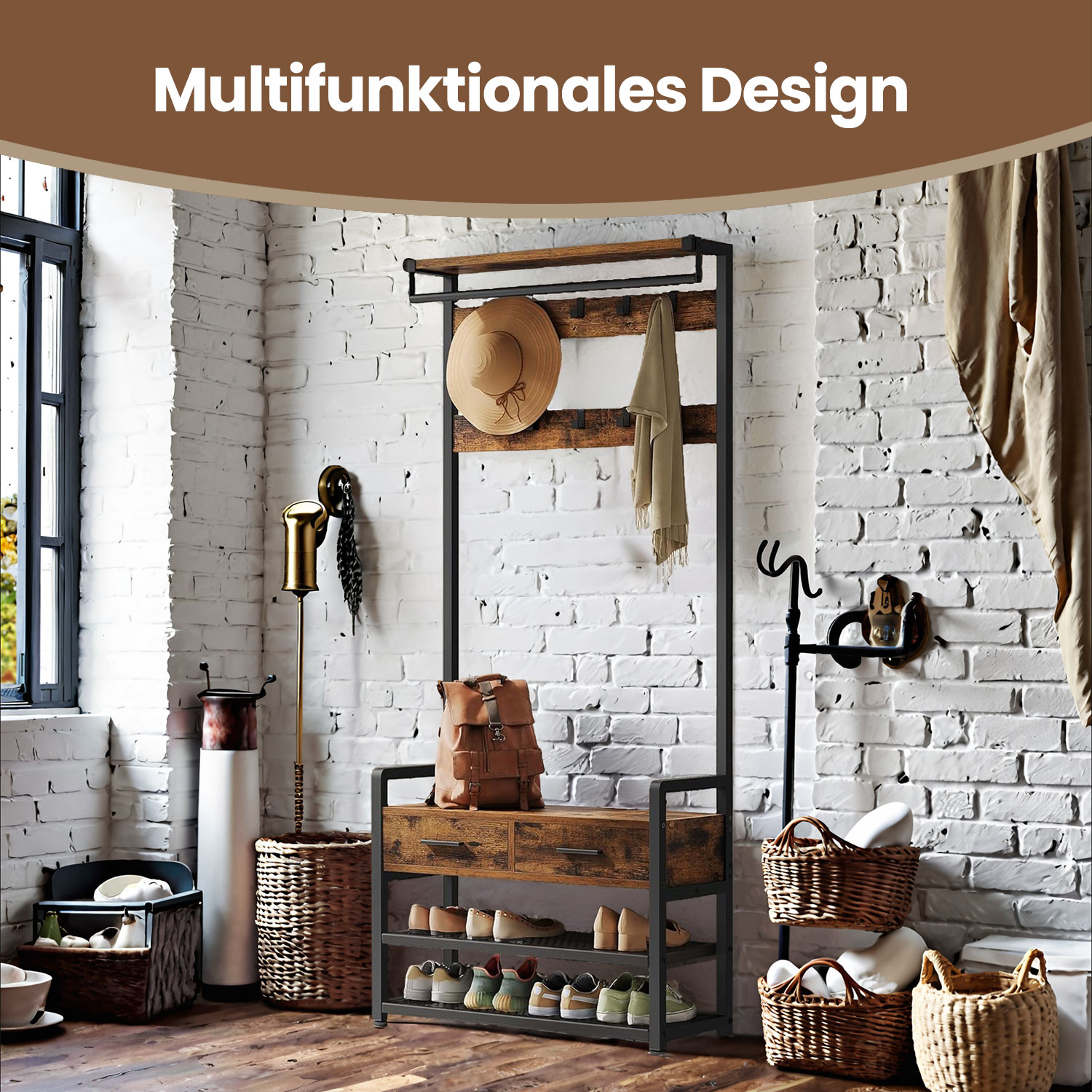 VASAGLE coat rack with shoe bench, coat rack, shoe storage, 2 fabric drawers, 10 hooks, 6 side hooks, 30 x 80.4 x 181.6 cm