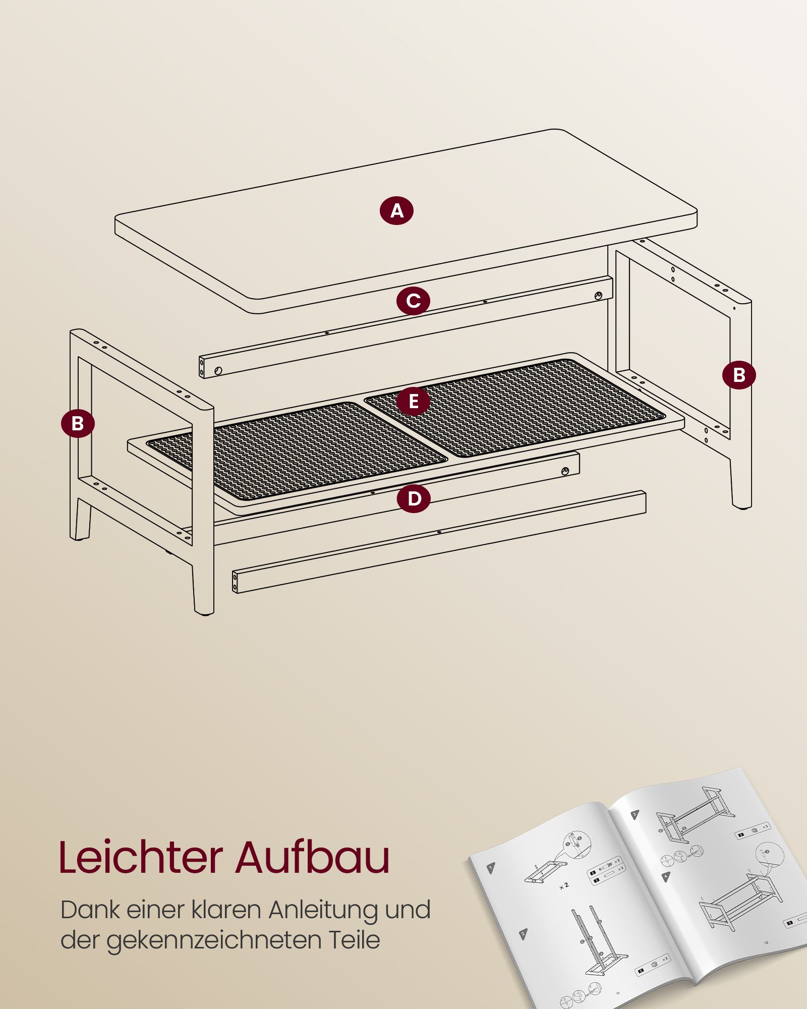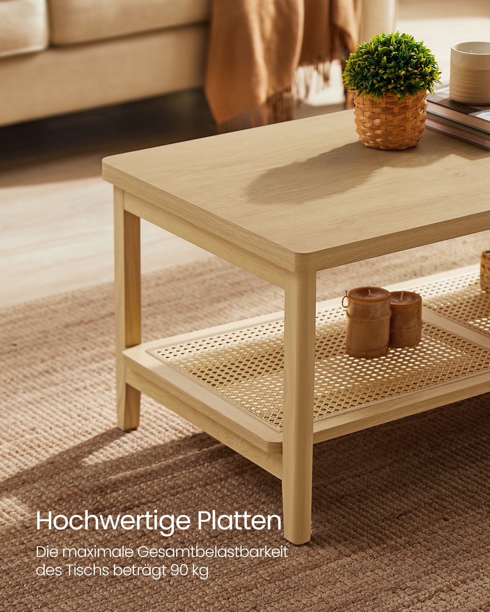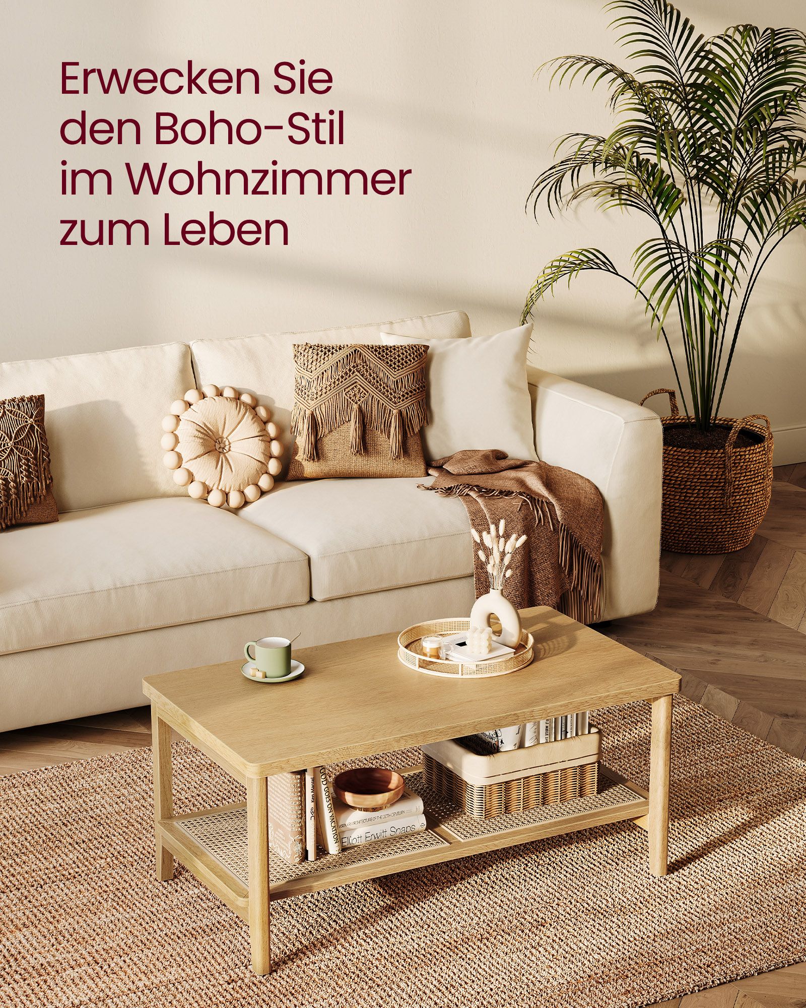 VASAGLE Coffee Table 2 Levels, Living Room Table with Storage Space, Living Room Table, Sofa Table with Storage Made of PVC Rattan, Rounded Corners, Boho Style
