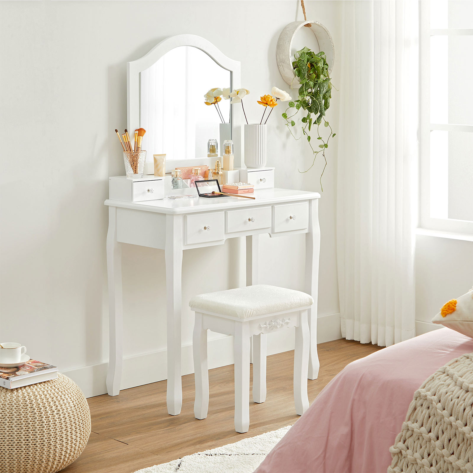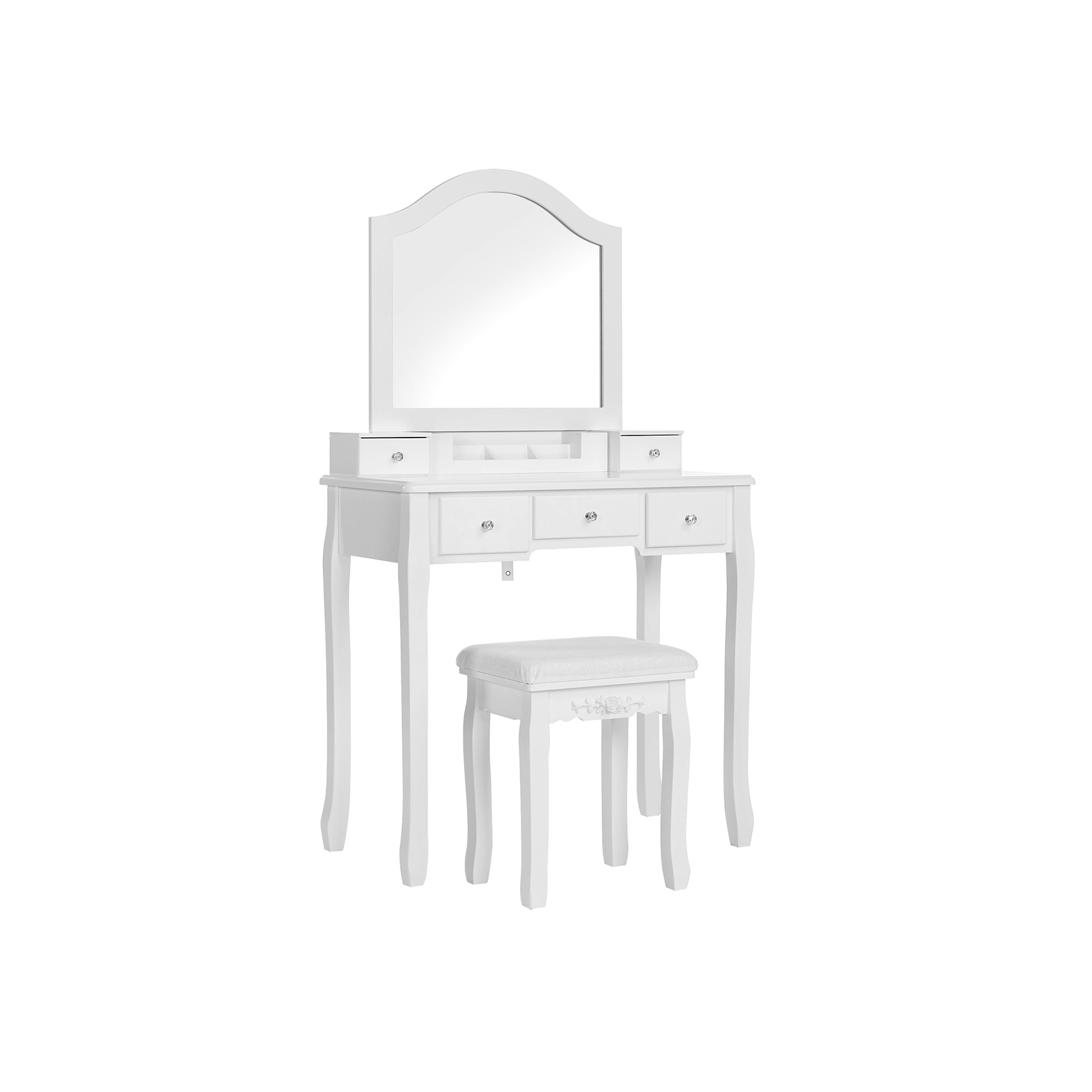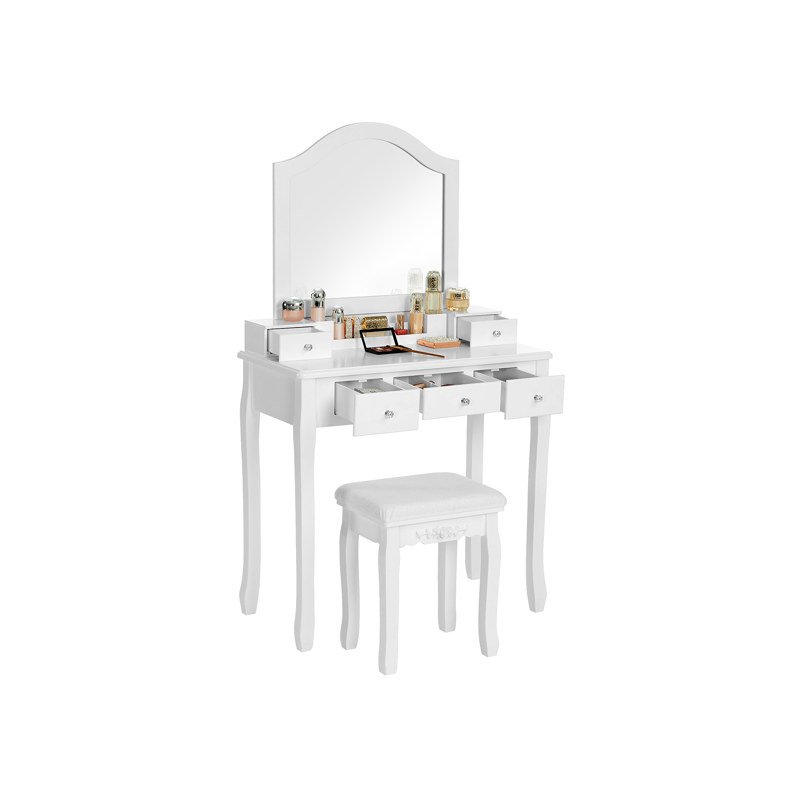 A reliable partner This dressing table impresses not only with its timeless appearance, but also with its solid combination of pine, rubberwood, and MDF materials. You can safely store your beauty products in the drawers or on the table surface. Sit down on the comfortable stool and admire yourself in the large mirror! A magical gift A great gift idea for a birthday, Christmas, or any other special anniversary! With a large mirror, plenty of storage space, and a comfortable stool, this dreamy dressing table is sure to make everyone smile! Product details: – Color: White – Material: MDF (medium-density fiberboard), pine wood, rubberwood, glass – Size of dressing table: 80 x 40 x 139 cm (L x W x H) – Stool size: 40 x 30 x 46 cm (L x W x H) – Weight: 18.2 kg – Max. static load capacity of the stool: 130 kg Scope of delivery:- 1 x dressing table with mirror – 1 x stool – 1 x accessory pack – 1 x instructions (DE, EN, FR, IT, ES) VASAGLE notes: – For safety reasons, children must not climb on or play with the product. – Keep the product away from chemicals. – Wipe the product with a damp cloth for daily cleaning.