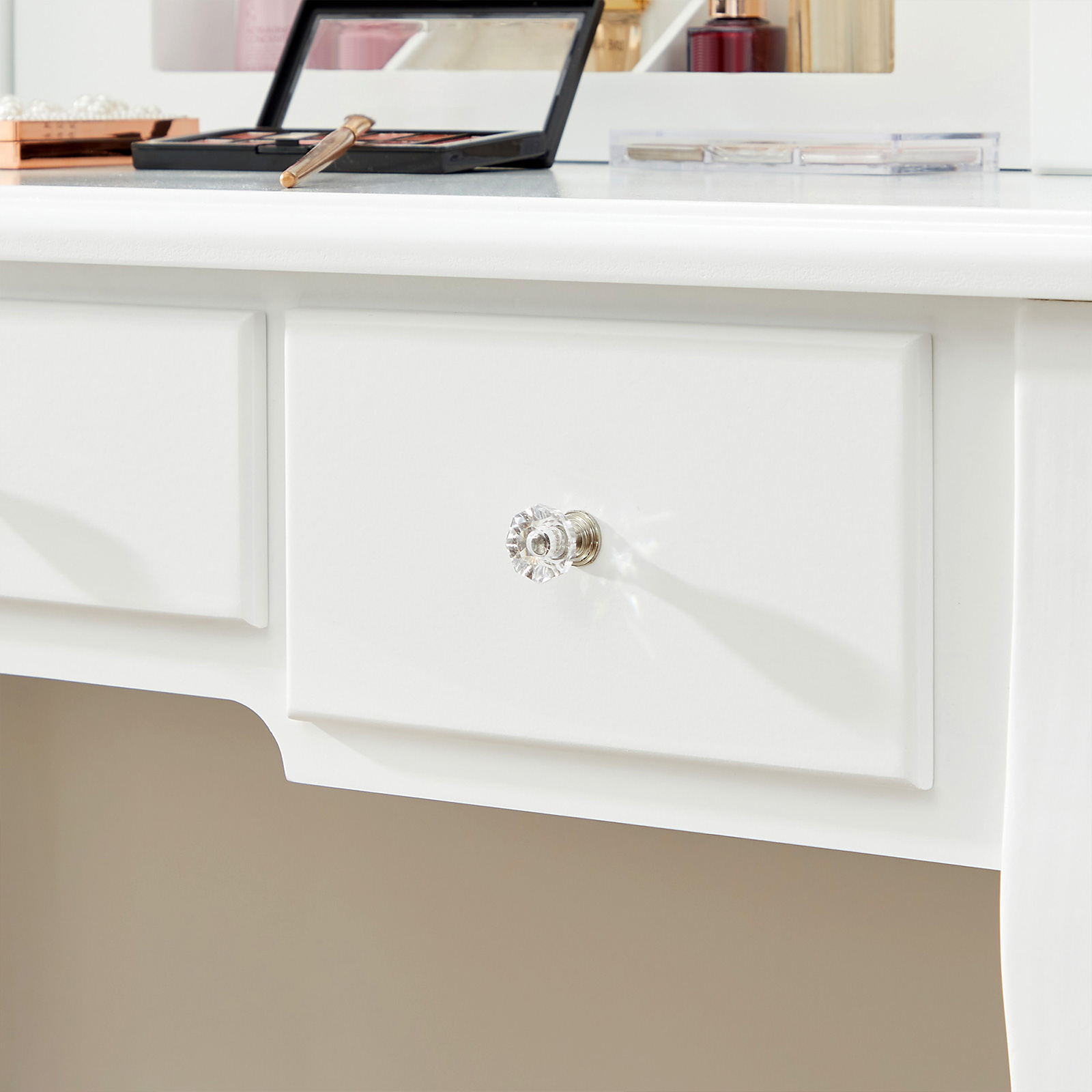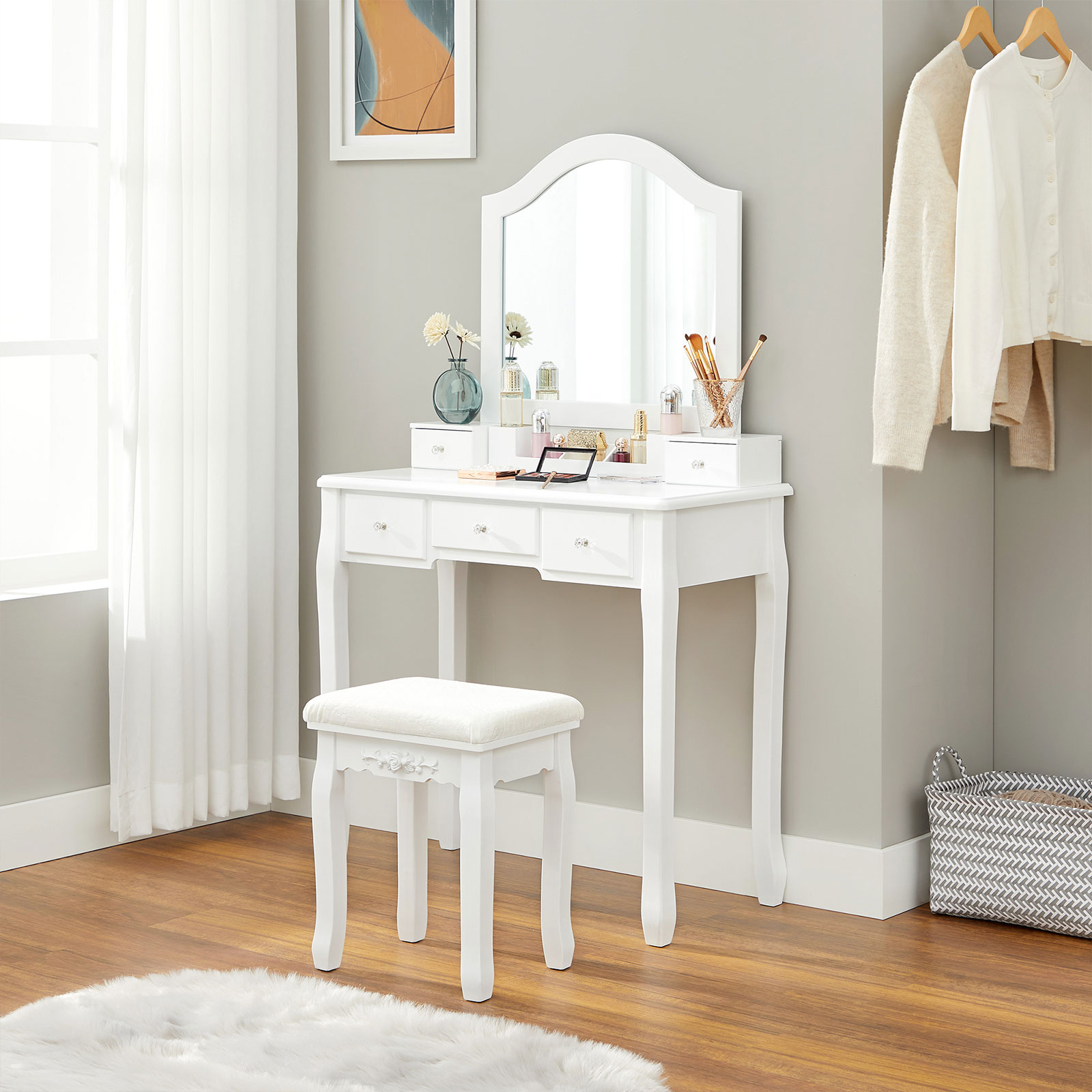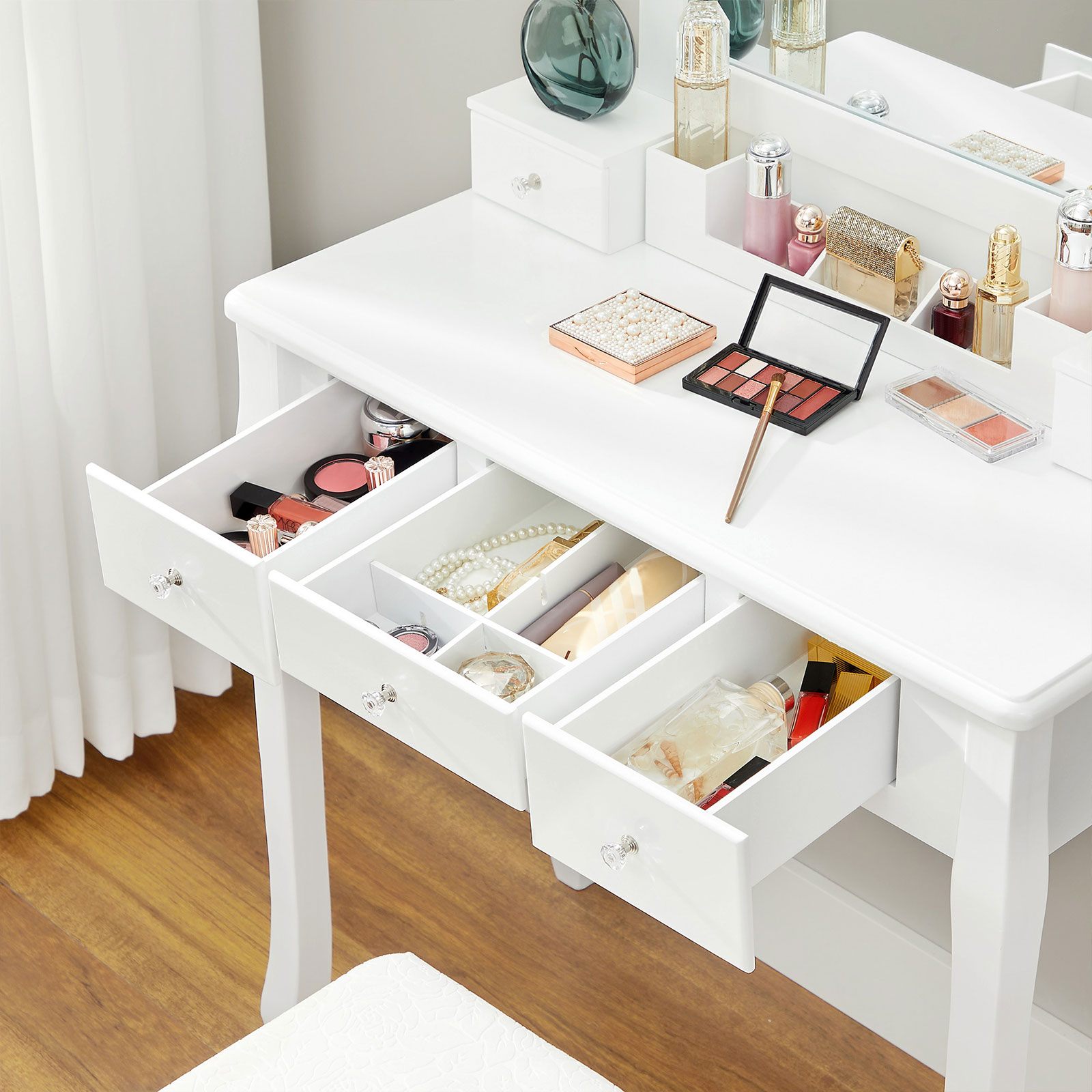 A reliable partner This dressing table impresses not only with its timeless appearance, but also with its solid combination of pine, rubberwood, and MDF materials. You can safely store your beauty products in the drawers or on the table surface. Sit down on the comfortable stool and admire yourself in the large mirror! A magical gift A great gift idea for a birthday, Christmas, or any other special anniversary! With a large mirror, plenty of storage space, and a comfortable stool, this dreamy dressing table is sure to make everyone smile! Product details: – Color: White – Material: MDF (medium-density fiberboard), pine wood, rubberwood, glass – Size of dressing table: 80 x 40 x 139 cm (L x W x H) – Stool size: 40 x 30 x 46 cm (L x W x H) – Weight: 18.2 kg – Max. static load capacity of the stool: 130 kg Scope of delivery:- 1 x dressing table with mirror – 1 x stool – 1 x accessory pack – 1 x instructions (DE, EN, FR, IT, ES) VASAGLE notes: – For safety reasons, children must not climb on or play with the product. – Keep the product away from chemicals. – Wipe the product with a damp cloth for daily cleaning.