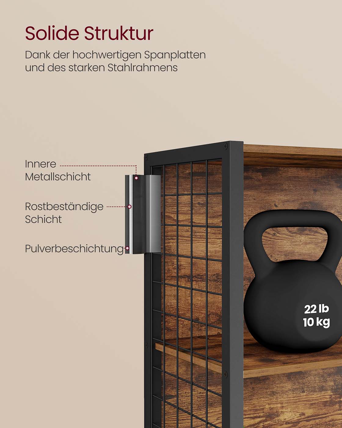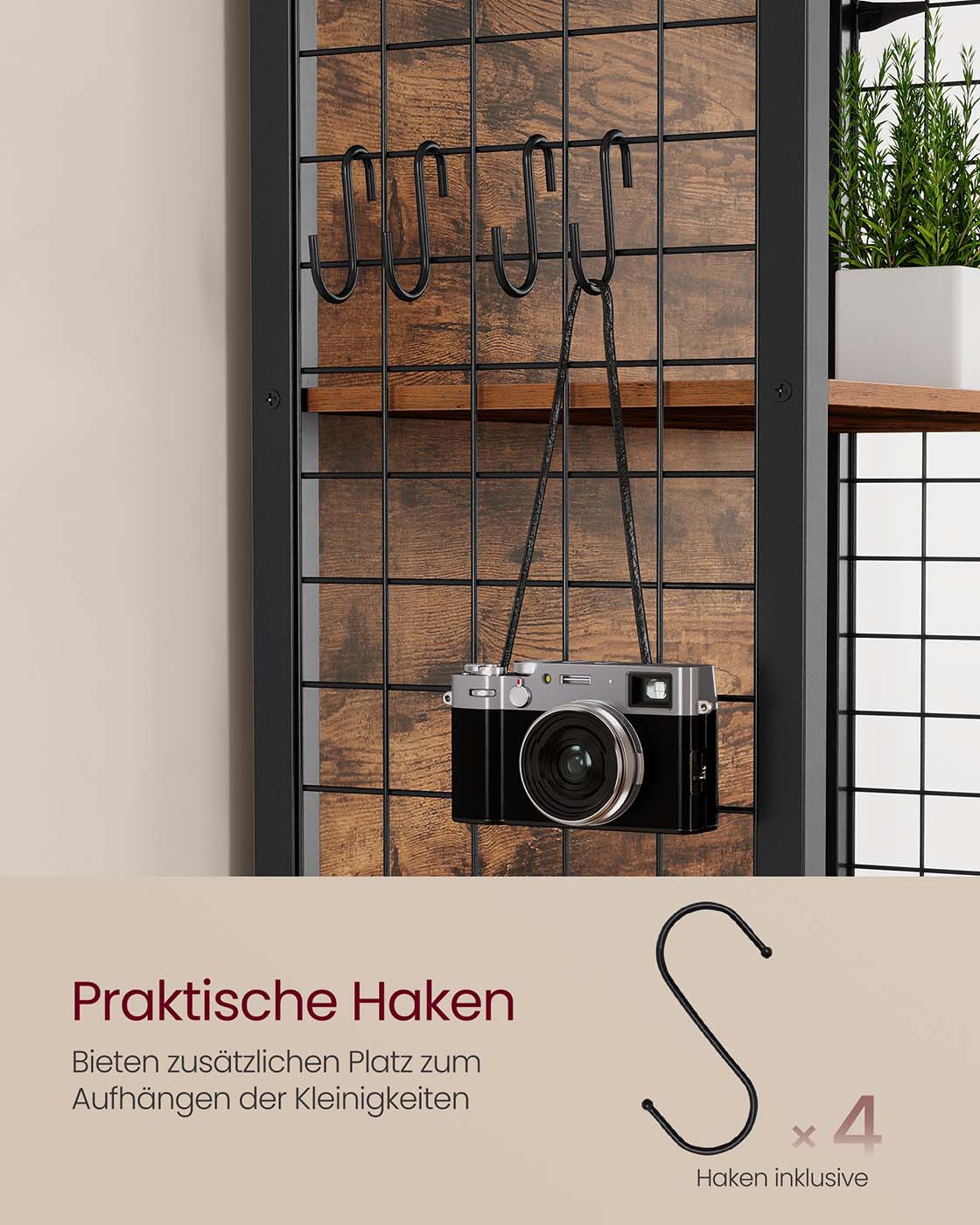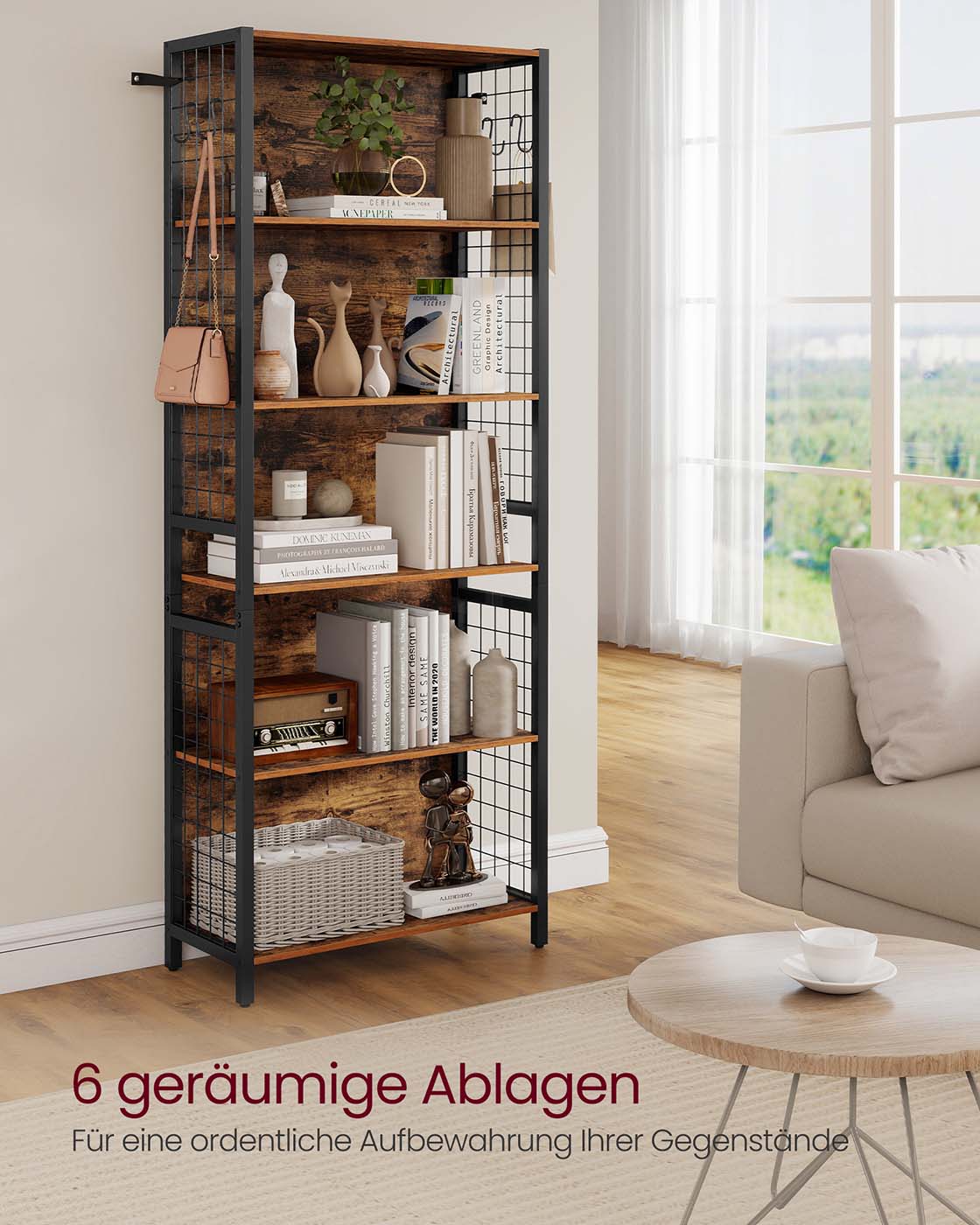 VASAGLE Bookshelf, Office Shelf, Kitchen Shelf, Standing Shelf with 4 Shelves, 4 S-Hooks Included, Office, Living Room, Home Office, Stable Steel Frame, Industrial Design, Vintage Brown-Black LBC023B01
