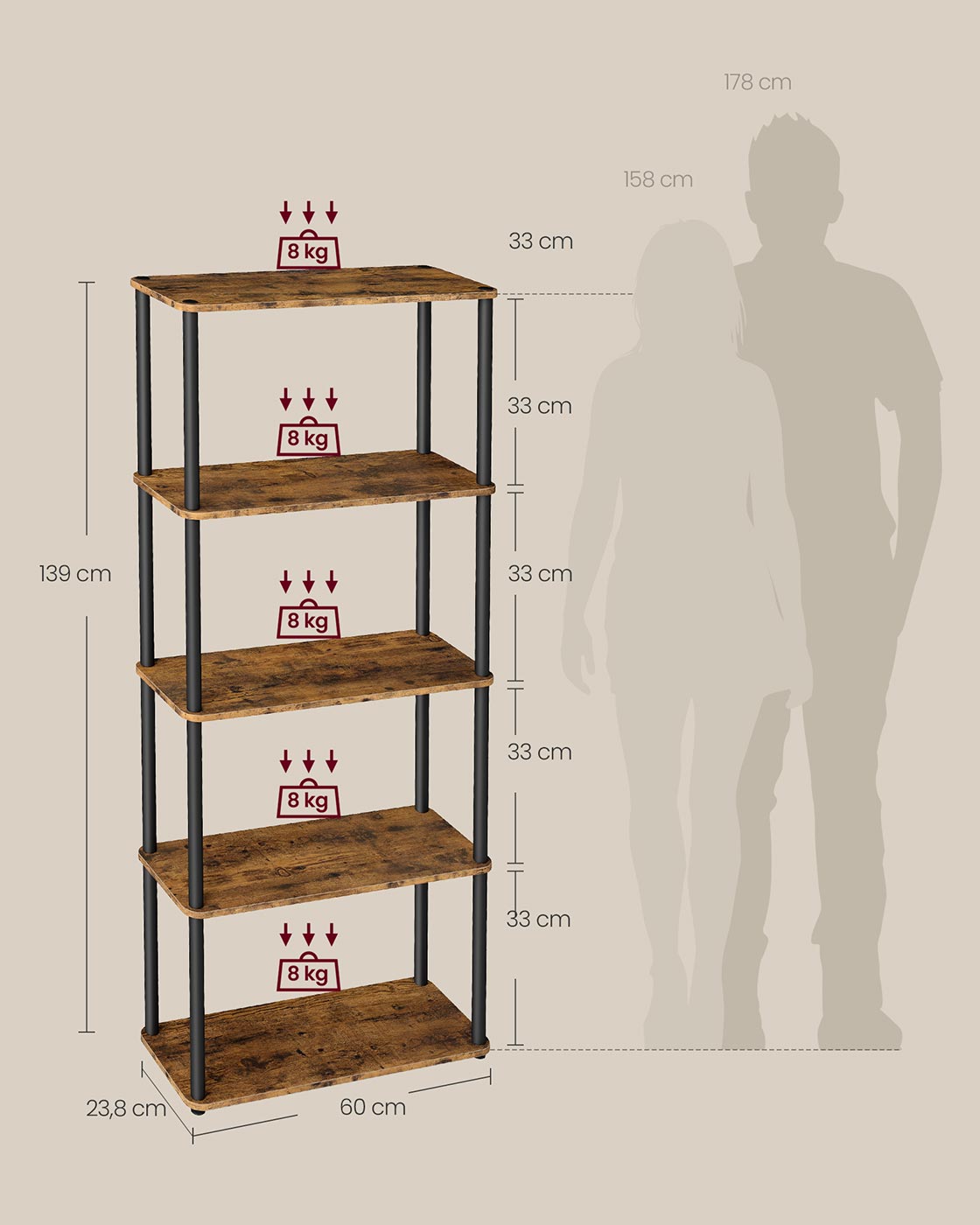 VASAGLE Super-fast tool-free assembly, 5-tier shelf, free-standing shelf, storage shelf, 23.8 x 38 x 139 cm, living room, bedroom, kitchen, vintage brown-ink black LLS135K01