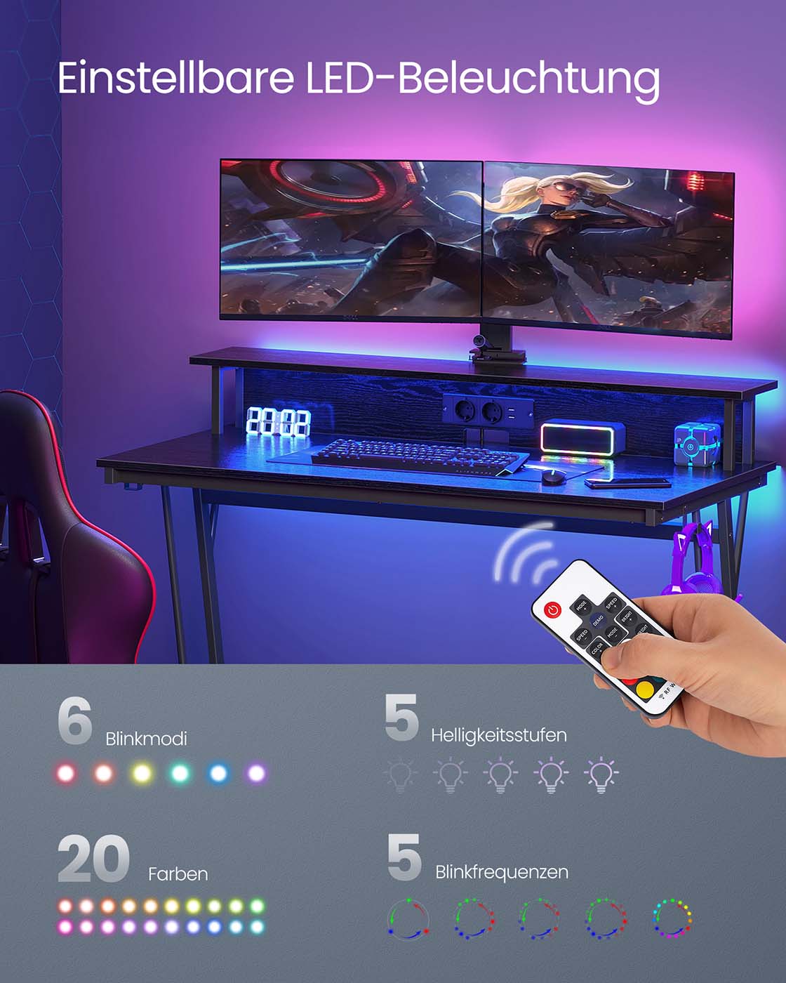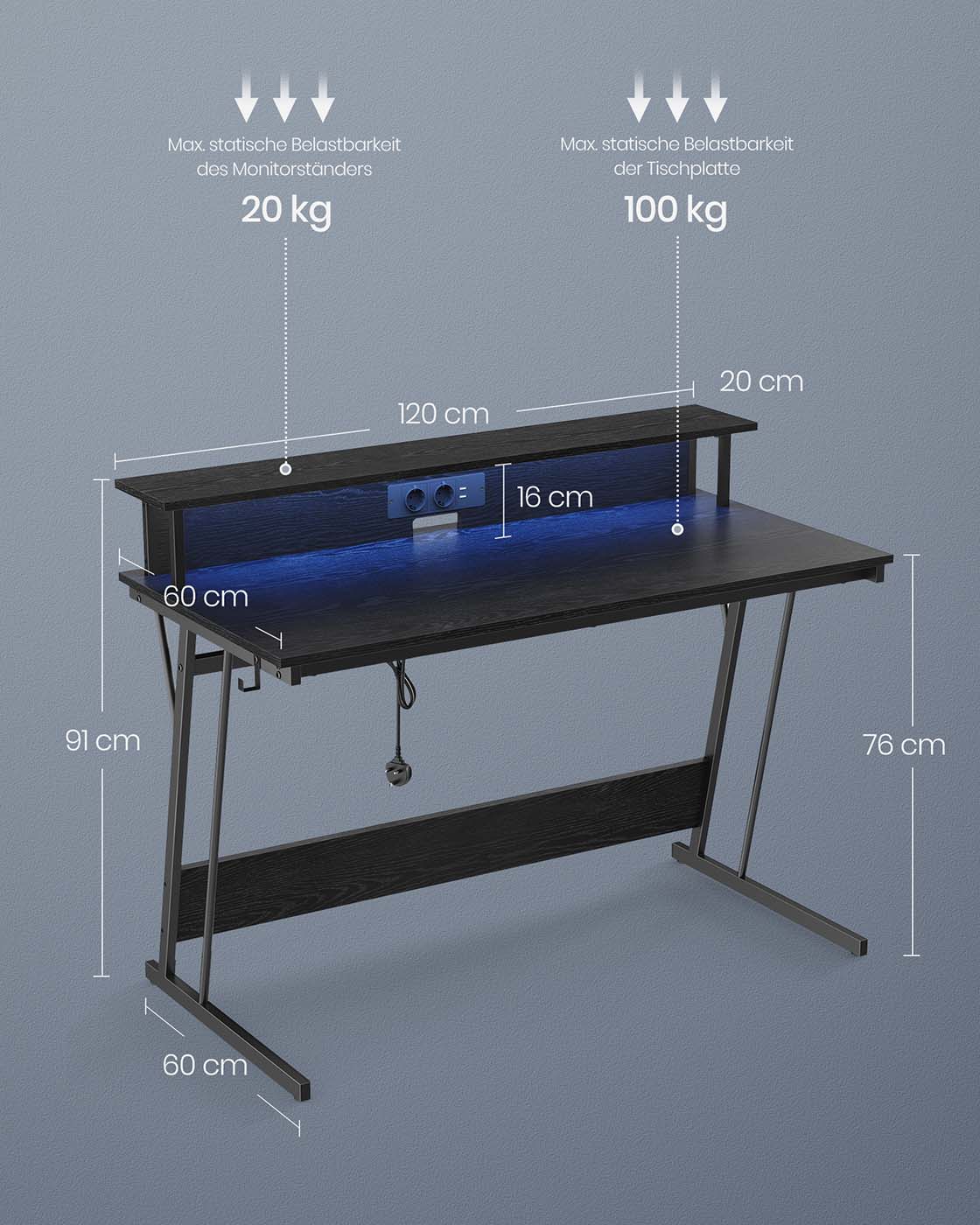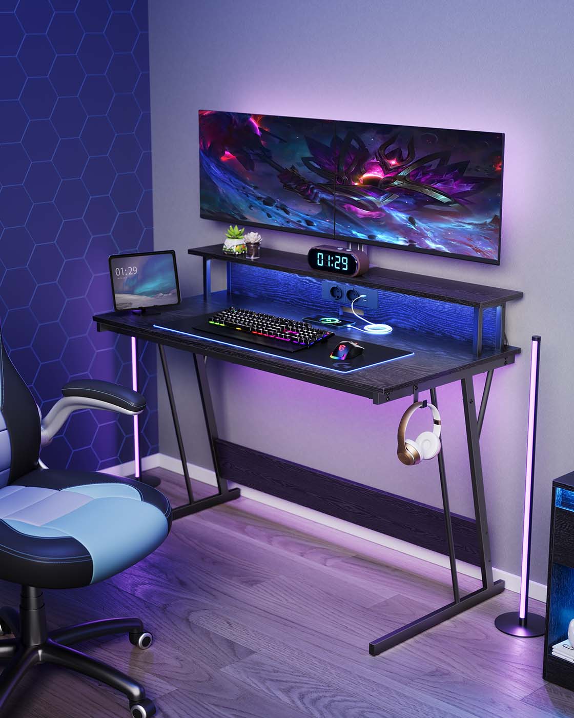 VASAGLE gaming table with LED lighting, desk with built-in power strip, computer desk, monitor stand for 2 monitors, bedroom