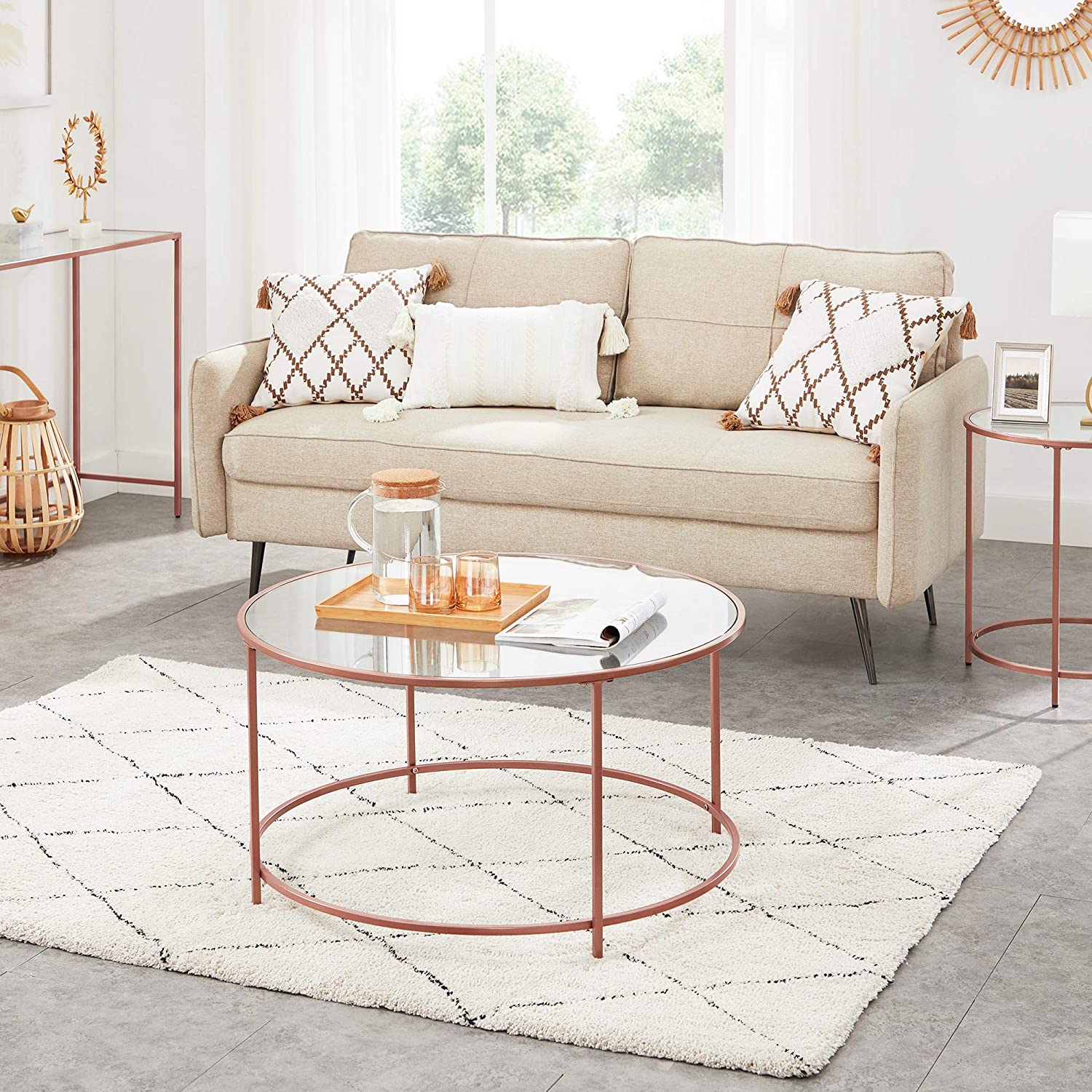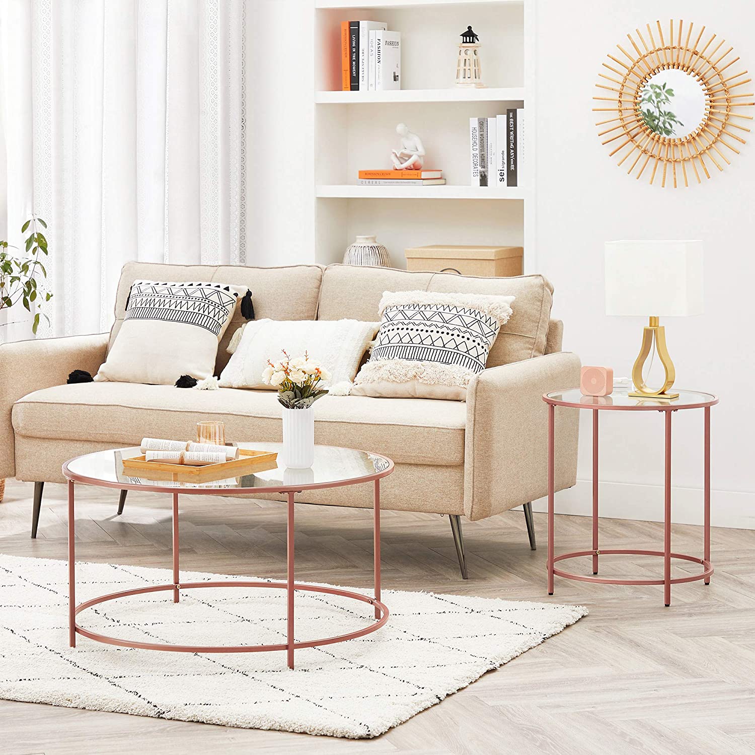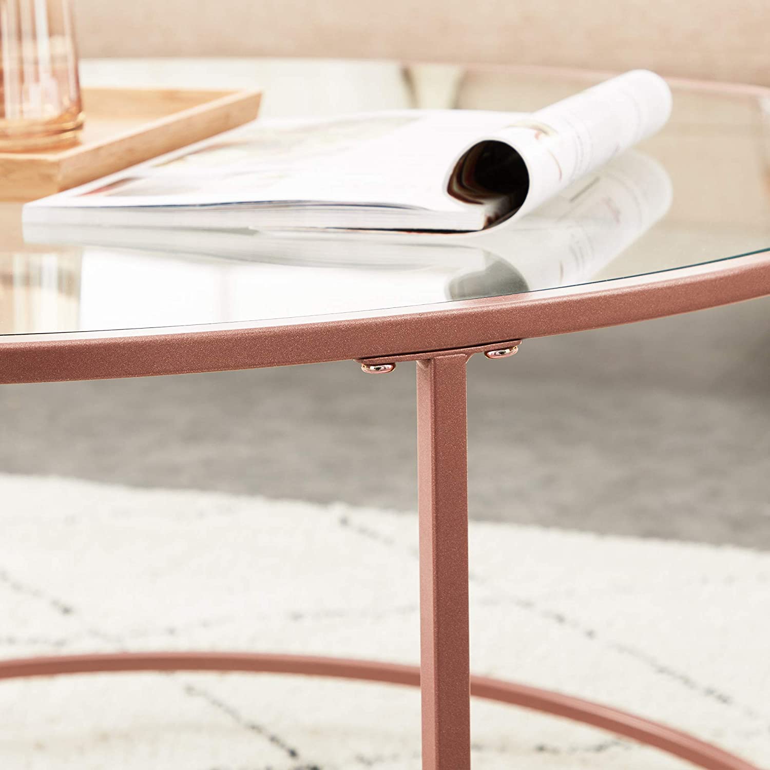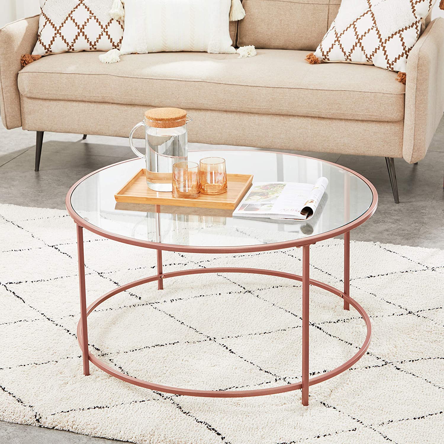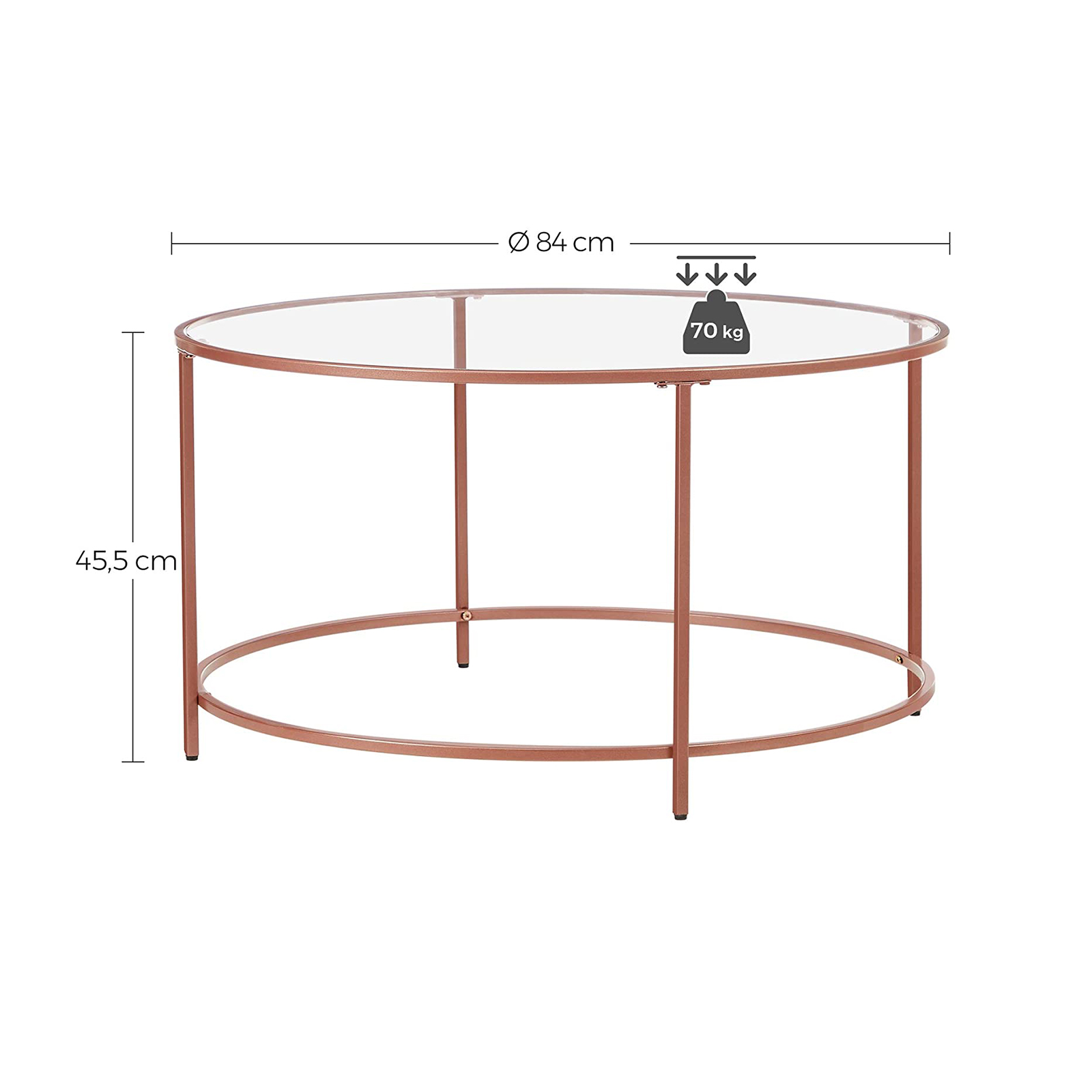 Product details: – Color: rose gold – Material: steel, tempered glass – Size: 84 x 45.5 cm (Ø x H) – Weight: 11.5 kg – Max. static load capacity: 70 kg Scope of delivery: – 1 x side table – 1 x accessory package – 1 x instructions VASAGLE Notes:- For safety reasons, children are not allowed to climb on or play with the product.