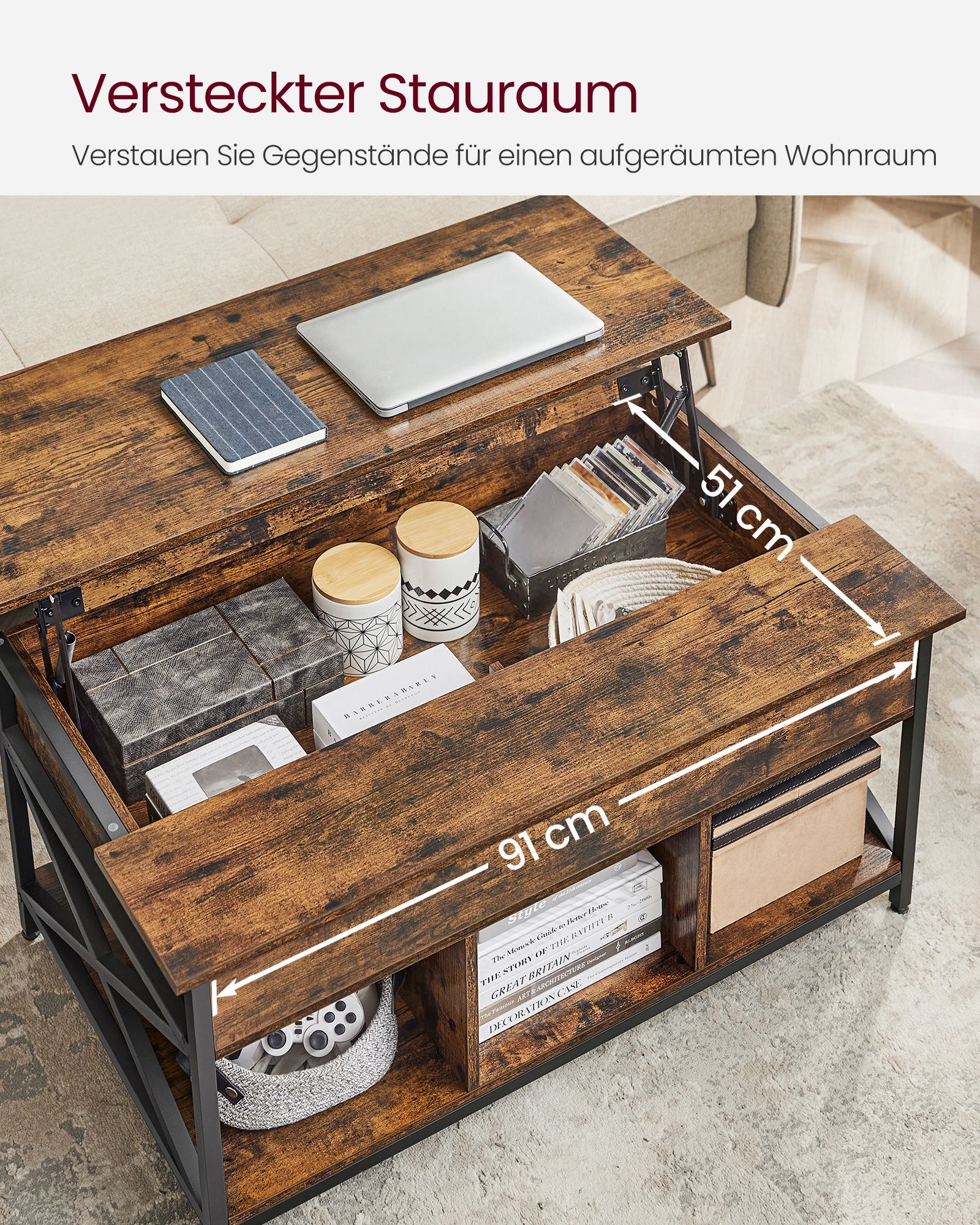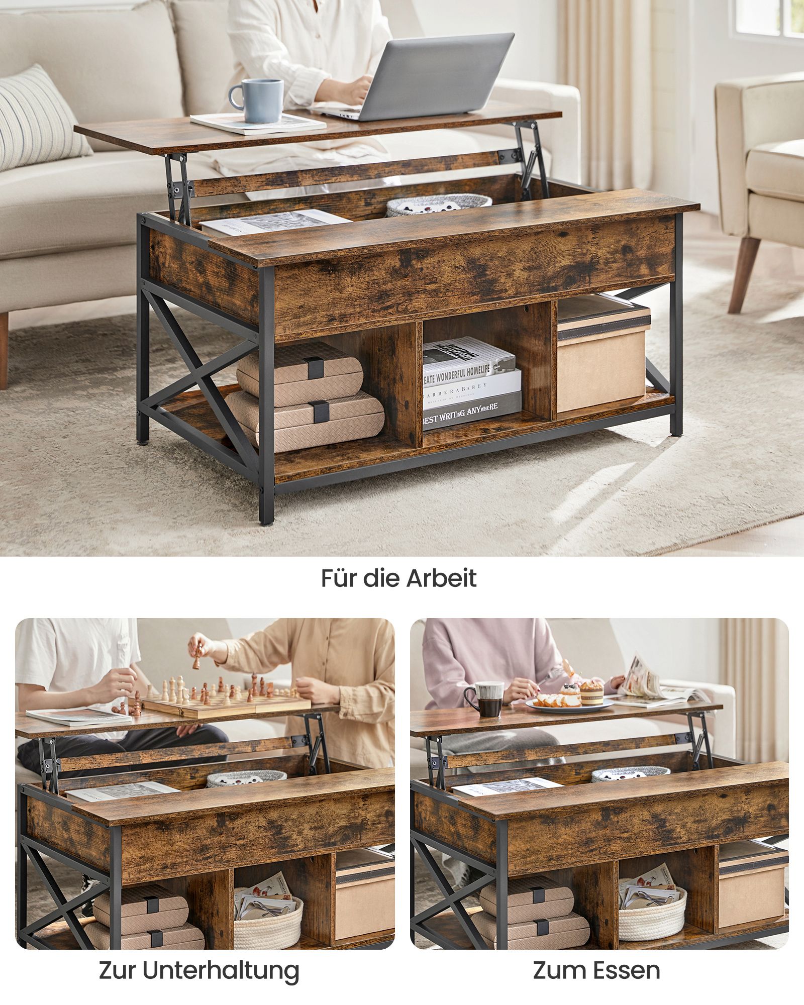Product details: Color: Vintage brown-black Material: Chipboard, steel Size: 60 x 100 x (48-62) cm (D x W x H) Weight: 29.2 kg Max. total static load capacity: 91 kg Scope of delivery: 1 x coffee table 1 x accessory package 1 x instructions VASAGLE Notes:For safety reasons, children are not allowed to climb on or play with the product.