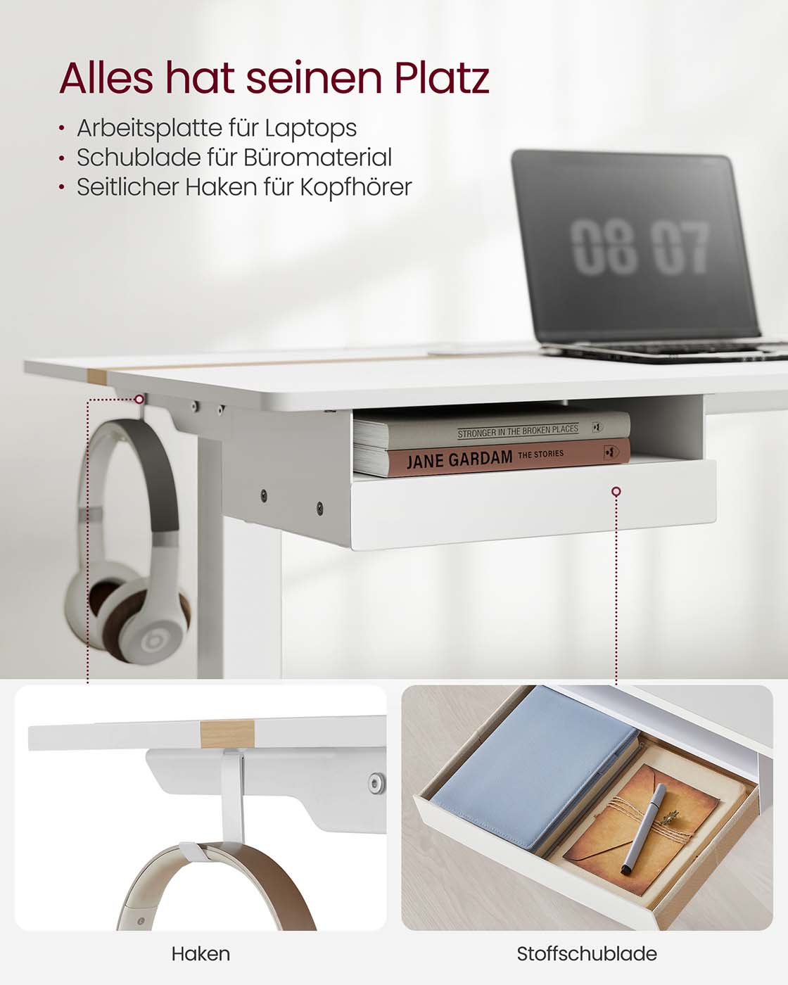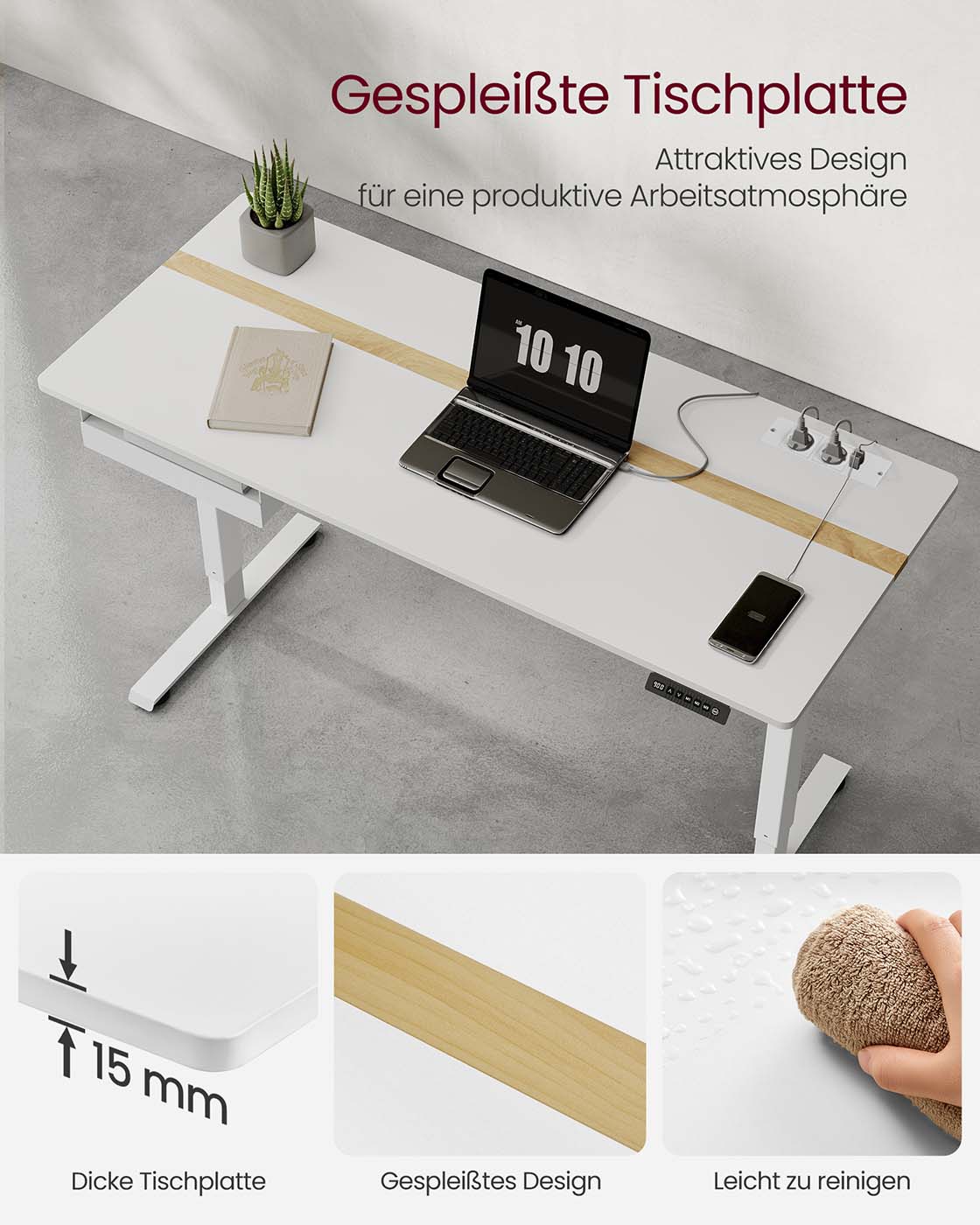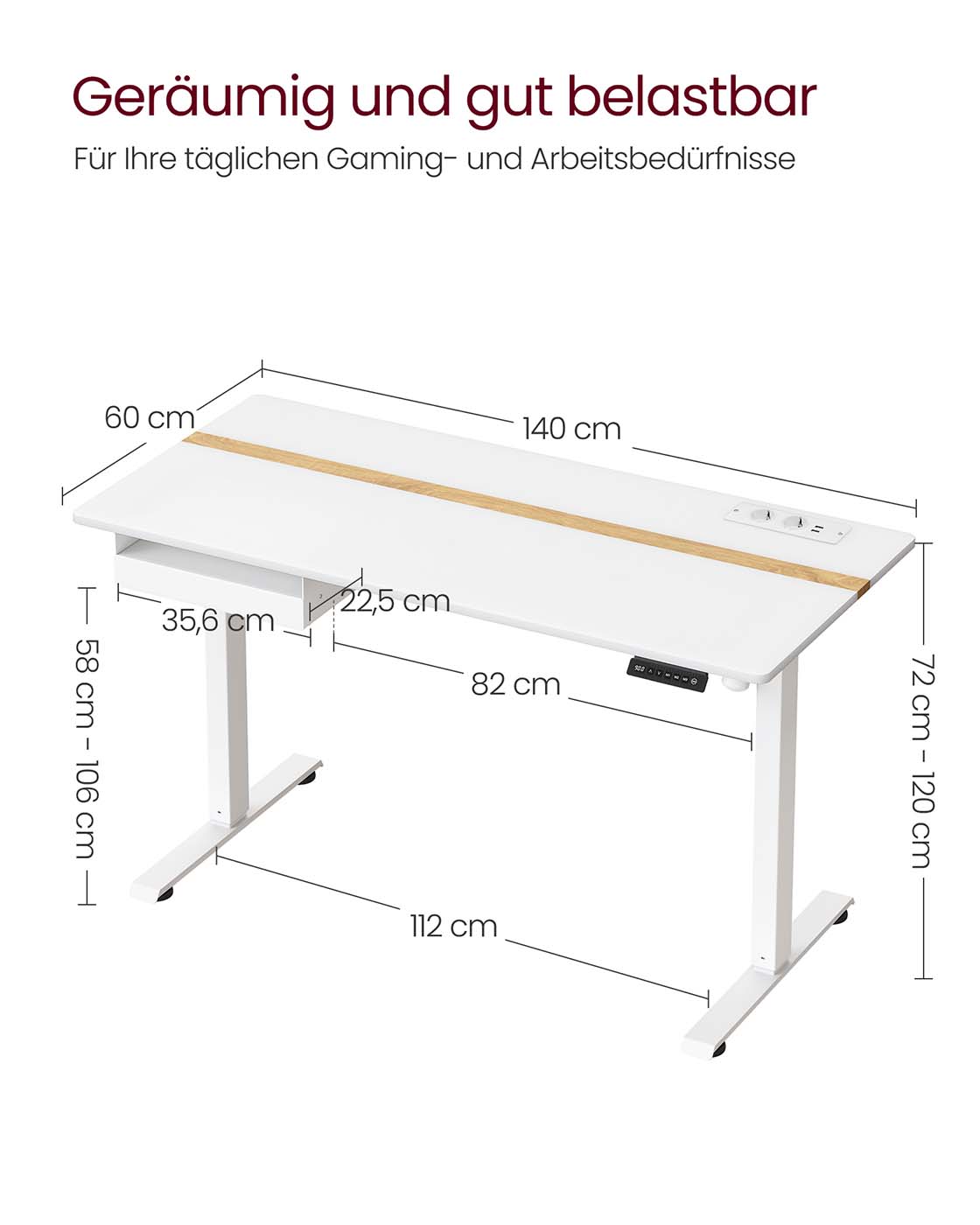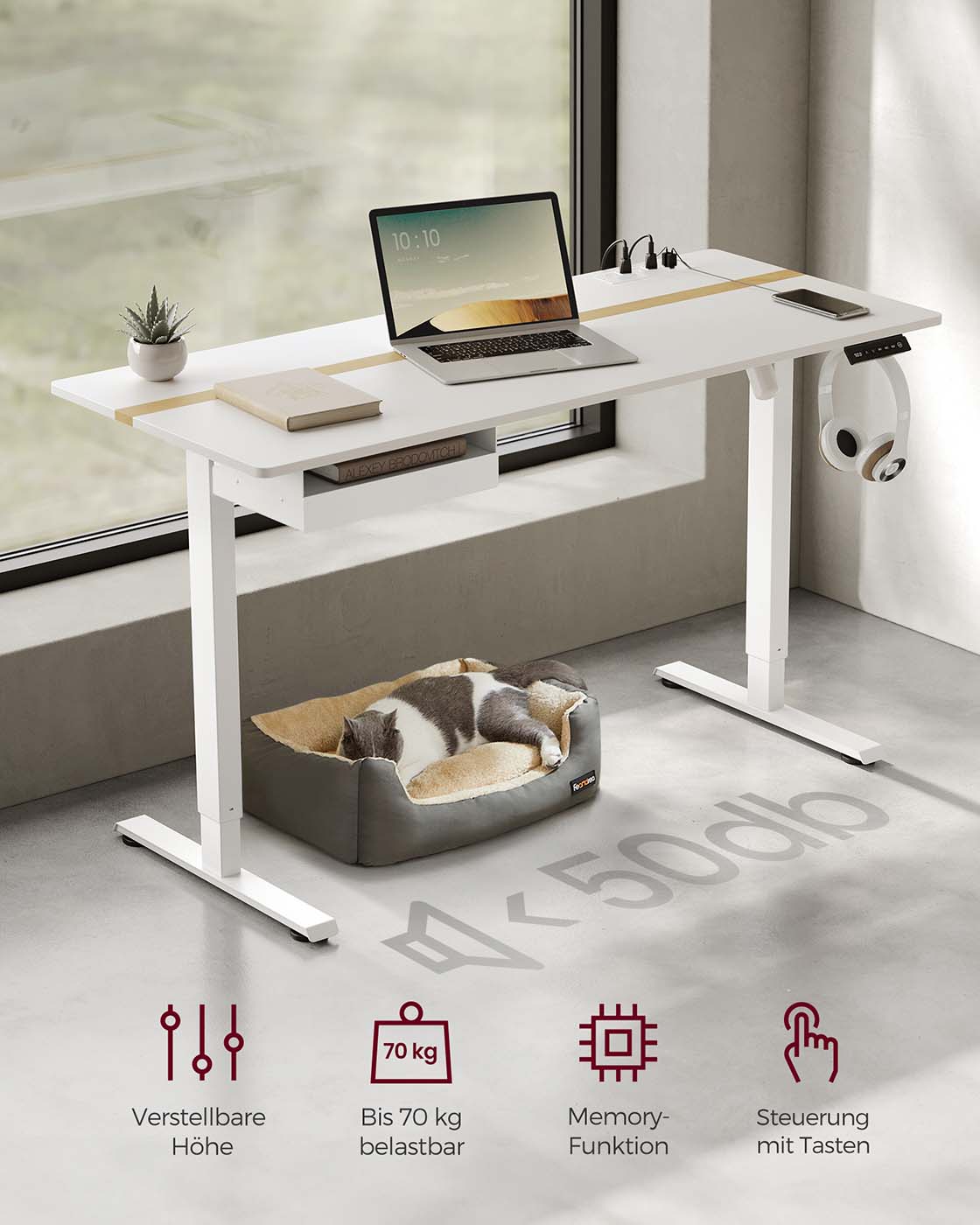 VASAGLE Height-adjustable electric desk, with power outlet and drawer, 60 x 140 cm table surface, continuously adjustable, memory function with 4 heights, white LSD114W01