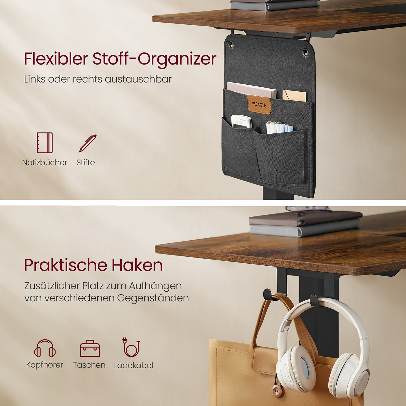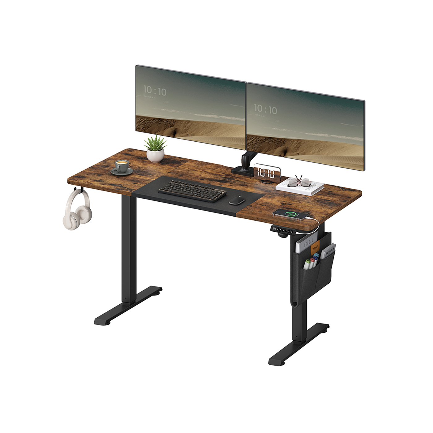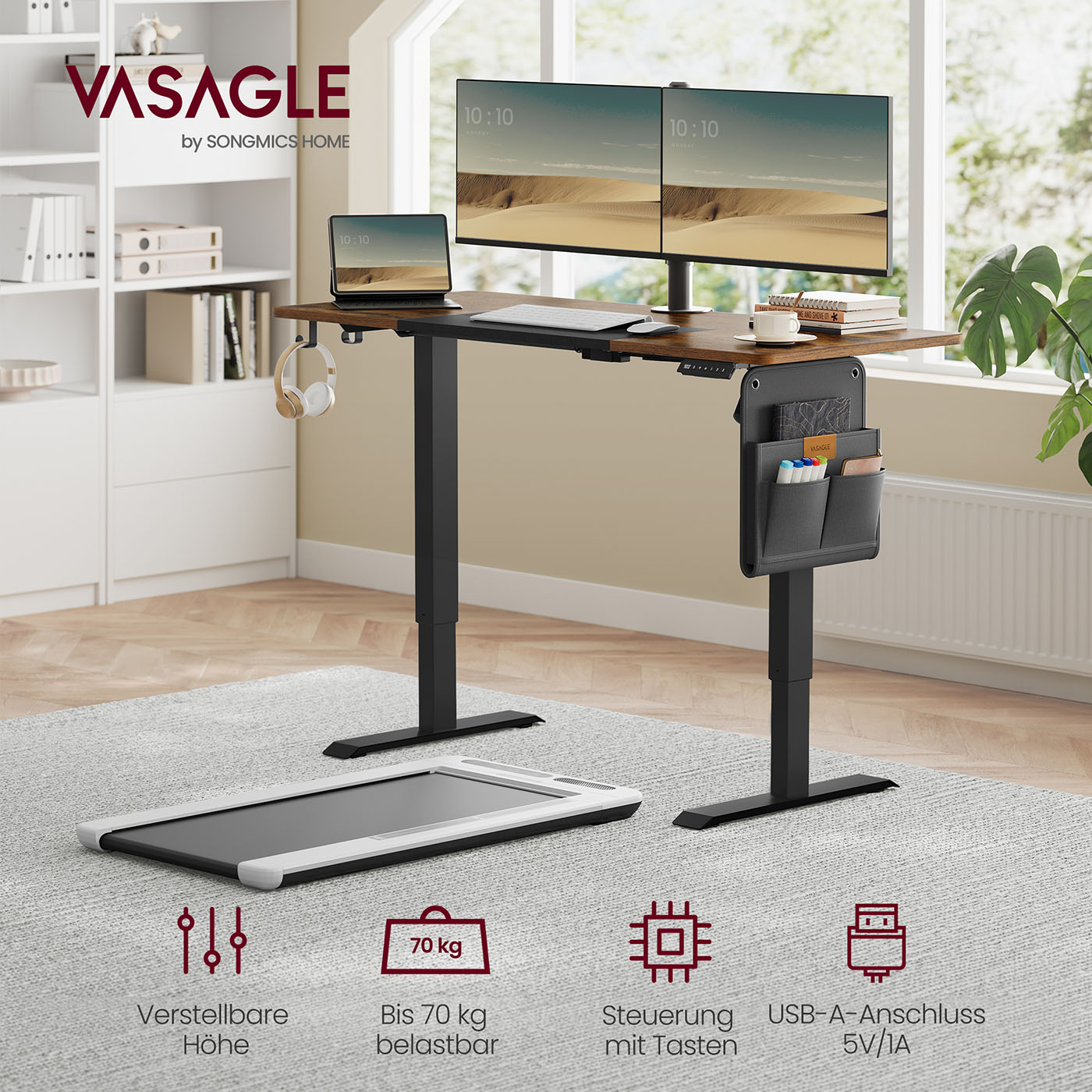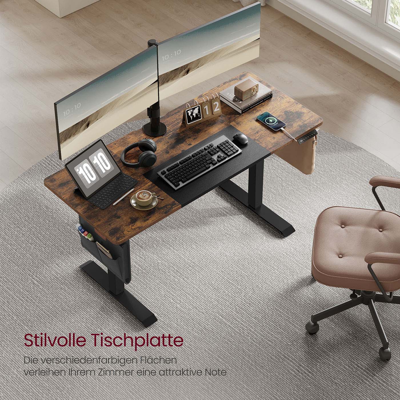 VASAGLE Height-adjustable electric desk, 72-120 cm, tabletop 60 x 120 cm, memory function with 3 heights, with organizer and hooks