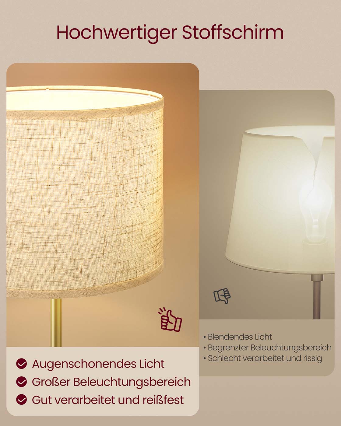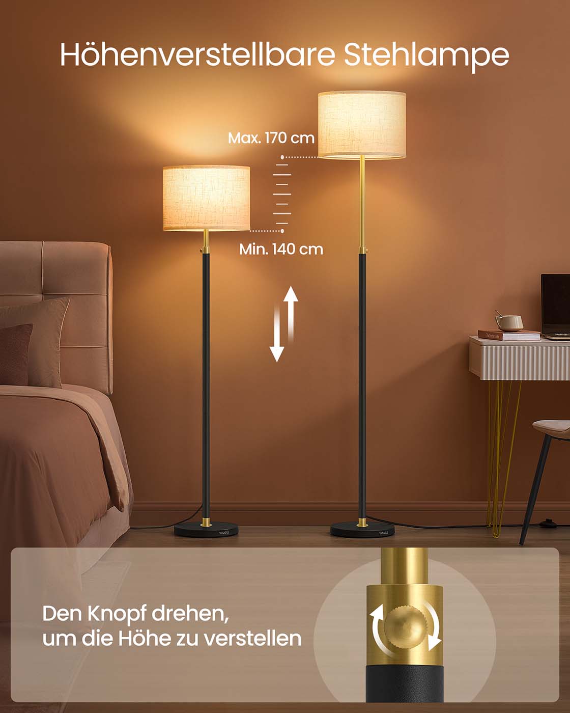 VASAGLE floor lamp, standing lamp, height-adjustable reading lamp, 140-170 cm high, modern, with foot switch, fabric lampshade, E27 socket, gold-black LFL002B02