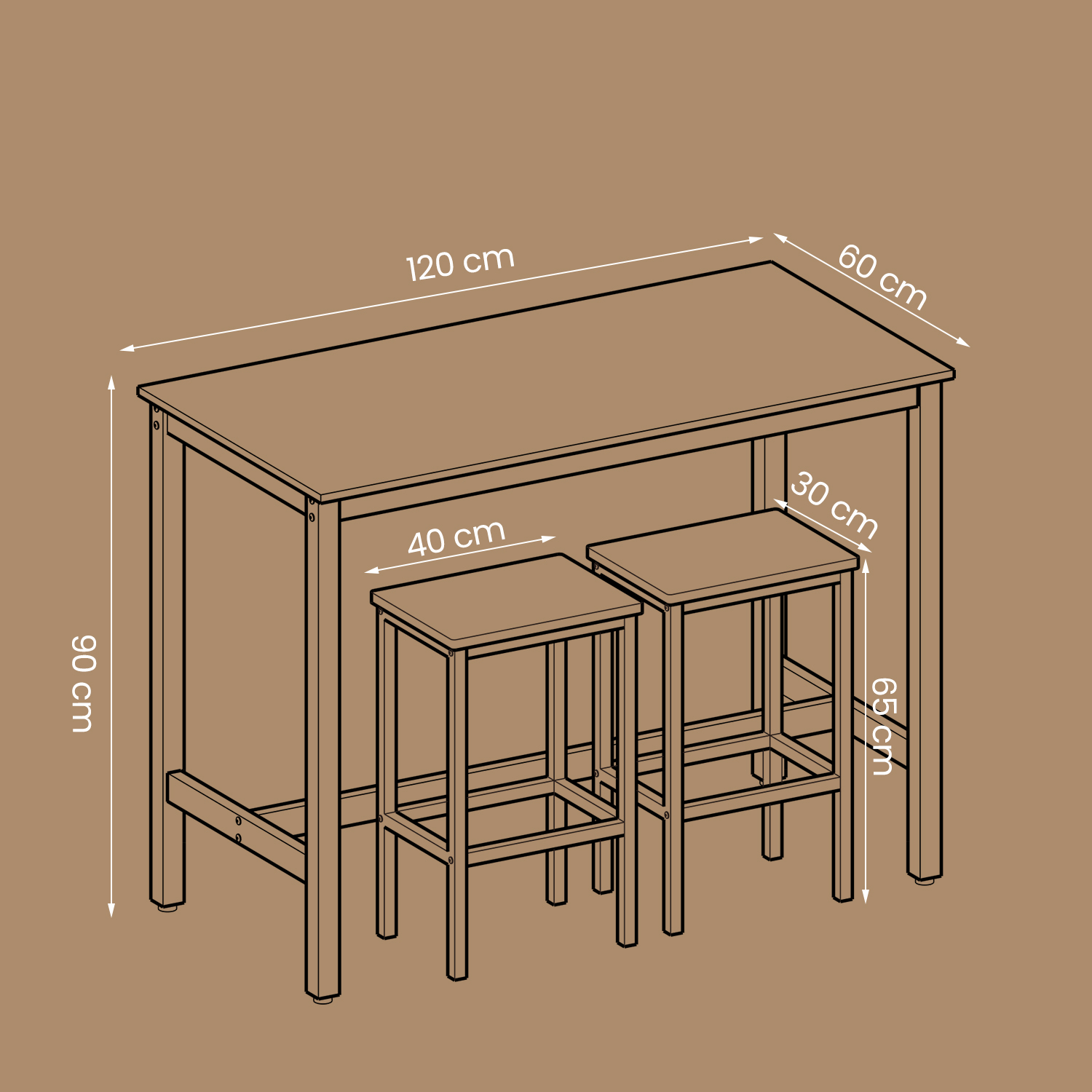 Product details: – Color: Dark brown/vintage – Material: Chipboard, iron – Table size: 120 x 60 x 90 cm (L x W x H) – Chair size: 40 x 30 x 65 cm (L x W x H) – Weight: 24.5 kg – Max. static load capacity of table top: 100 kg – Max. static load capacity per stool: 120 kg Scope of delivery: – 1 x bar table – 2 x bar stools – 1 x accessory bag – 1 x instructions (DE, EN, ES, FR, IT) VASAGLE Notes: – Children are not allowed to climb on or play with the product. – The maximum load capacity of the table surface is 100 kg. Please do not place any heavier objects on it. Do not exceed the maximum load capacity of the chairs (120 kg per chair). – The bar table should be secured to a wall using the anti-tip device to prevent it from tipping over. – Please do not lean back or rock back and forth while sitting on the stool.