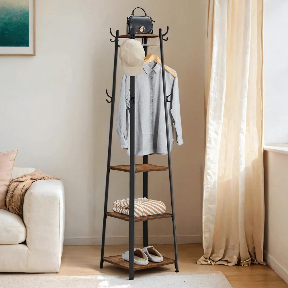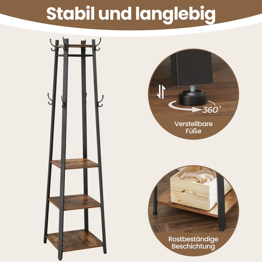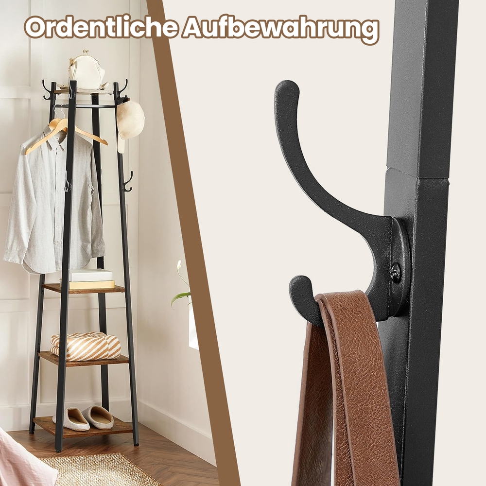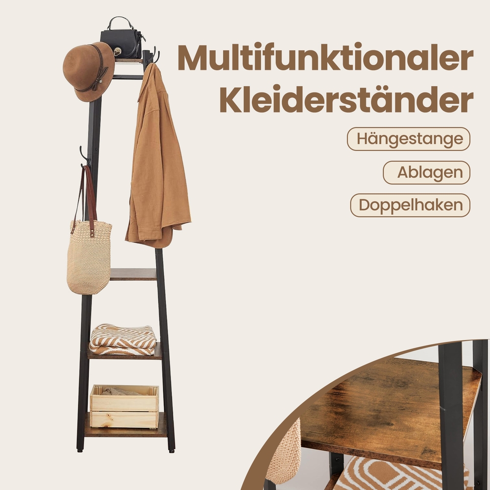 Product details:Color: Vintage Material: Iron frame, chipboard Dimensions: 45 x 45 x 181 cm (L x W x H) Weight: 11.8 kg Max. load capacity per shelf: 10 kg Scope of delivery: 1 x coat rack 1 x accessory bag 1 x instructions (DE, EN, FR, ES, IT) VASAGLE Notes:This product is designed for indoor use only. Please place it in a dry environment.