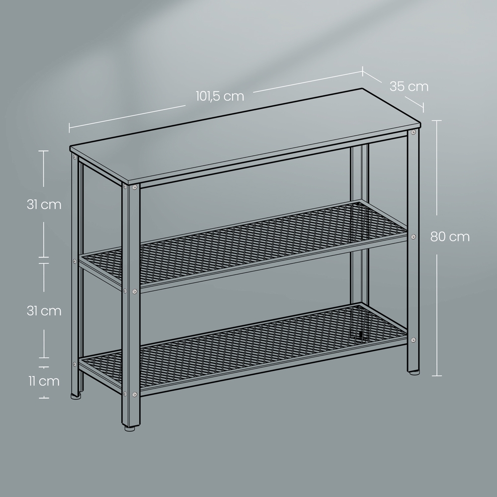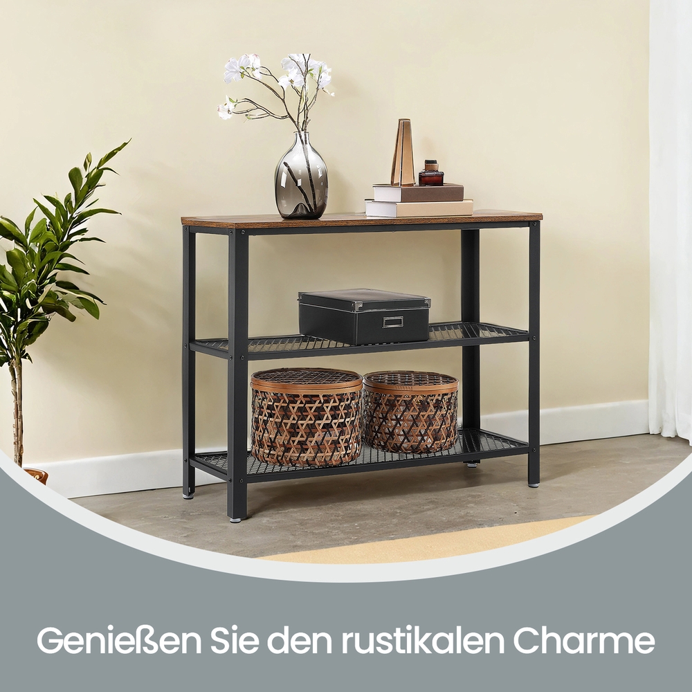 A touch of vintage here, a touch of industrial design there The style of this hallway table can be described as a combination of an iron frame with a trendy industrial look and a precisely crafted vintage wood-based panel. The practical iron mesh shelves add a very special touch. Ready for big jobs This piece of furniture, measuring 101.5 x 35 x 80 cm (L x W x H) and with a surface load capacity of 20 kg, is suitable for the following areas of use: – Living room: Here, this narrow console table offers a little more storage space next to the sofa, for example for a bowl of fruit or small decorative items. Or place a pot of climbing ivy and picture frames on the smooth vintage surface. – Hallway: This versatile piece of furniture can also be used in the entrance area as a key rack or a practical telephone table. The two wire shelves also provide space to neatly store several pairs of shoes side by side. The narrow coffee table can also be combined perfectly with other furniture from the VASAGLE industrial design series! Product details: – Color: Vintage brown-black – Material: Chipboard, steel – Size: 101.5 x 35 x 80 cm (L x W x H) – Weight: 13.2 kg – Max. load capacity surface: 20 kg – Max. load capacity per mesh shelf: 20 kg Scope of delivery: – 1 x console table – 1 x container with accessories – 1 x Allen key – 1 x instructions (DE, EN, FR, ES, IT) VASAGLE notes: – Please place this product in a cool, dry place. – The maximum load capacity of the surface is 20 kg. Please do not place any heavier items on the table.