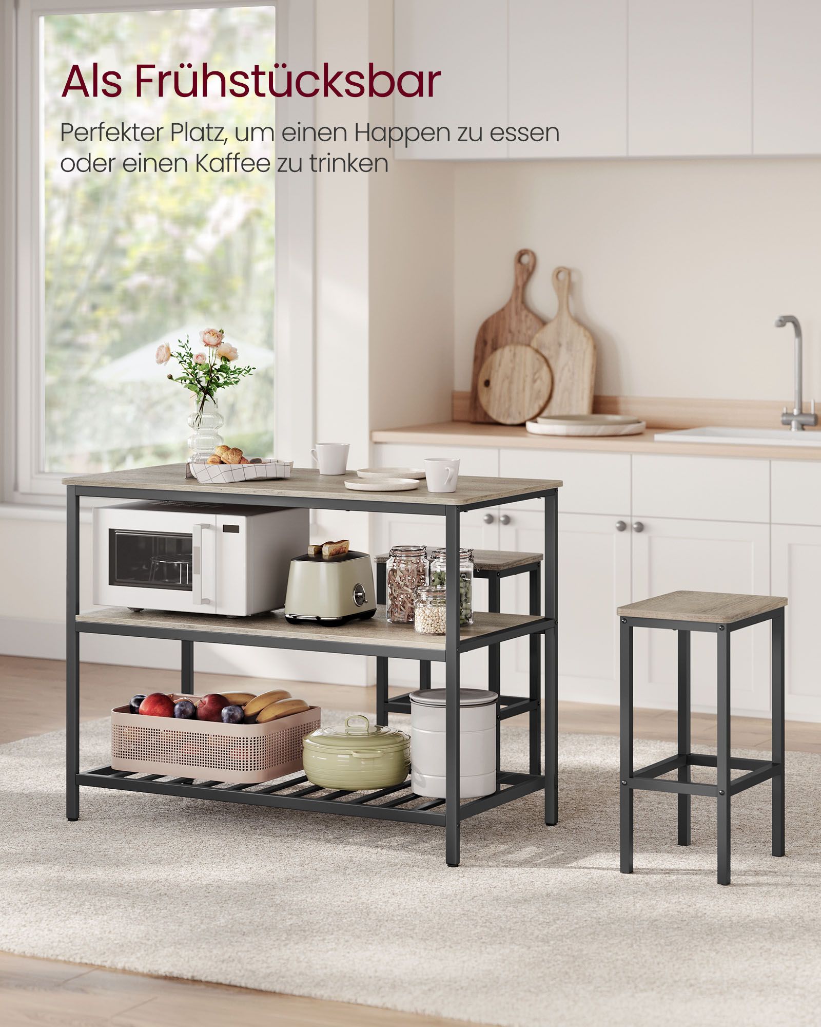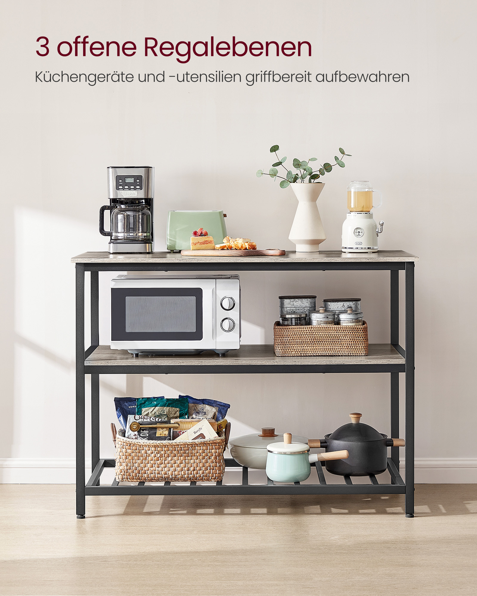 VASAGLE kitchen shelf with large worktop, 3-tier spice rack, steel frame, 60 x 120 x 90 cm, industrial, easy assembly, vintage brown-black KKI01BX