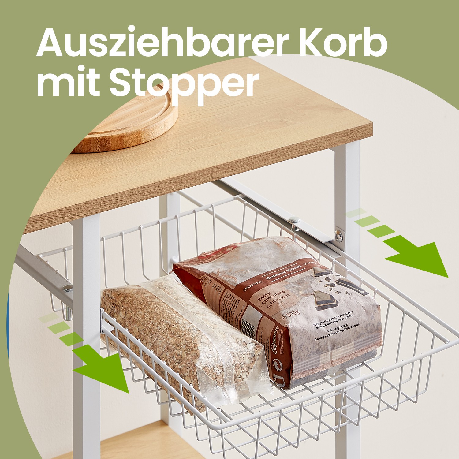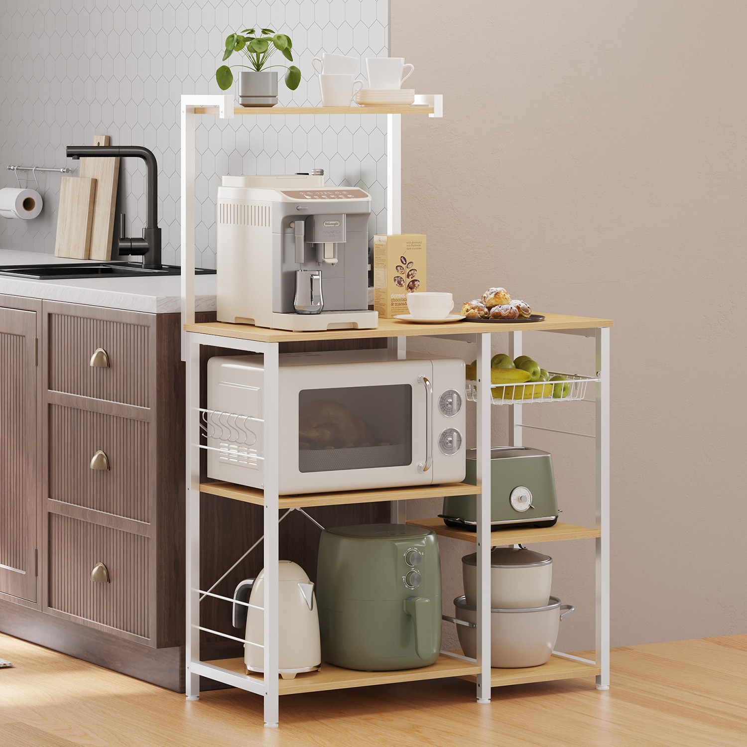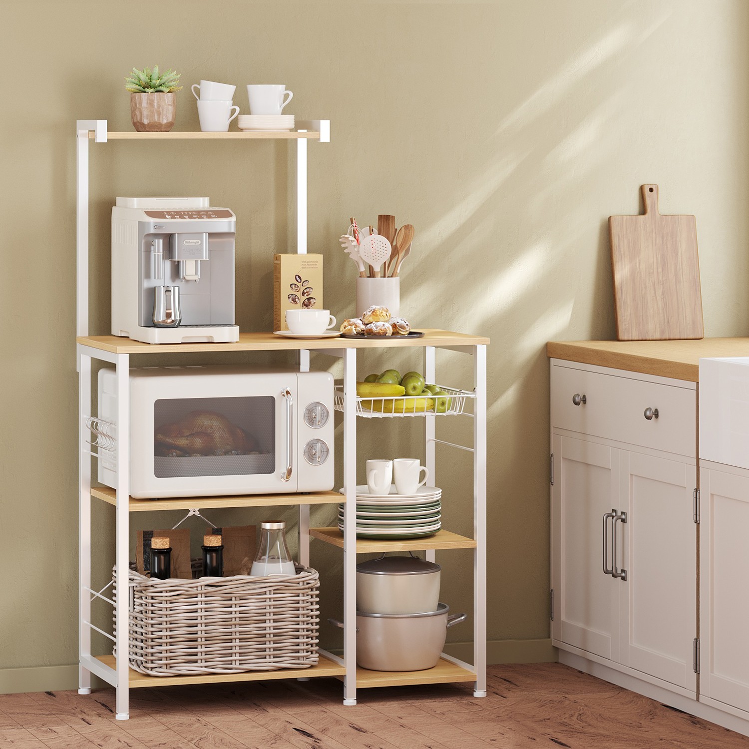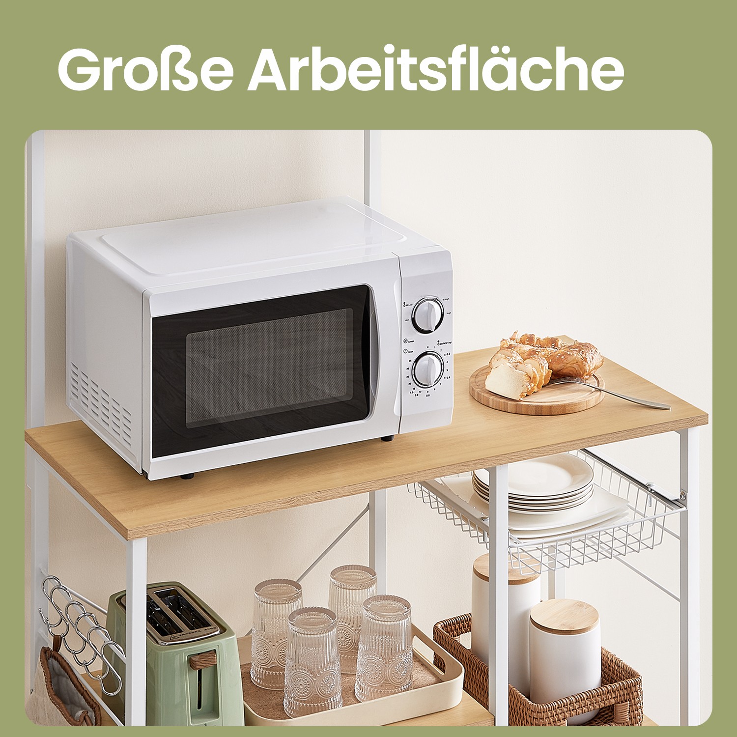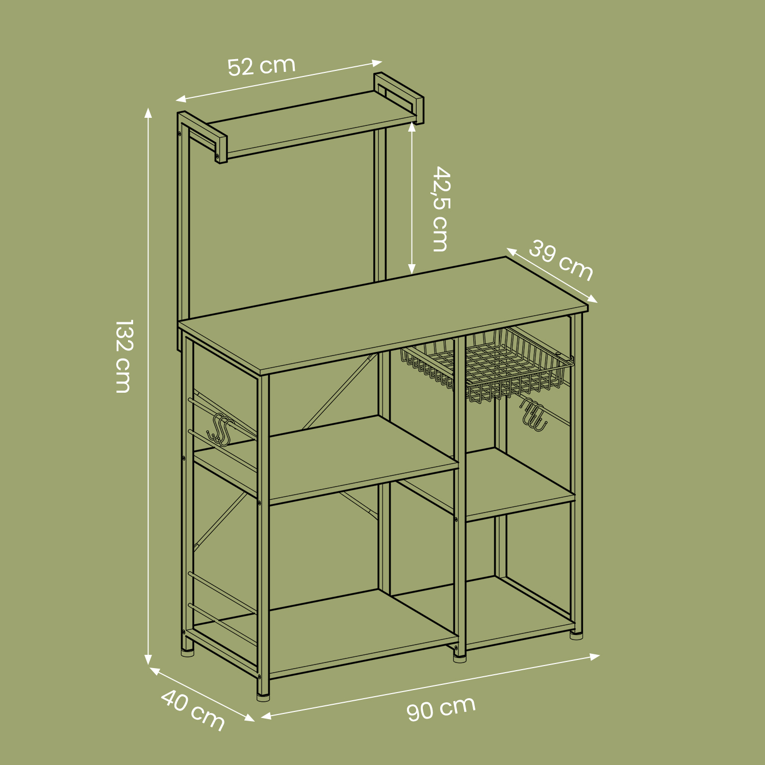VASAGLE kitchen shelf, standing shelf with metal basket, baker’s shelf with 6 S-hooks and shelf trays, microwave shelf, spice rack, for pots and pans, industrial design, greige-black KKS035B02