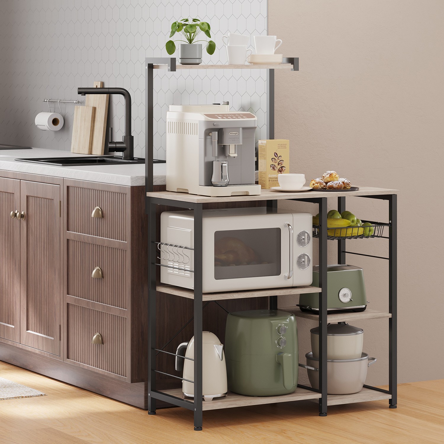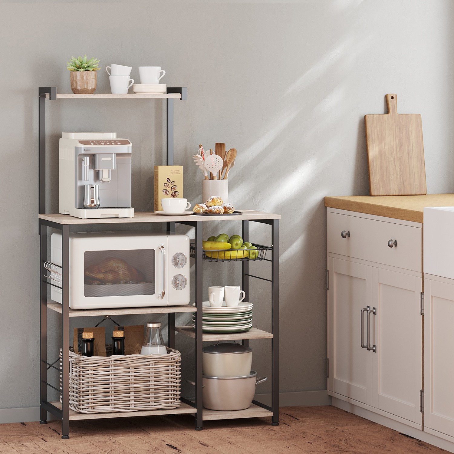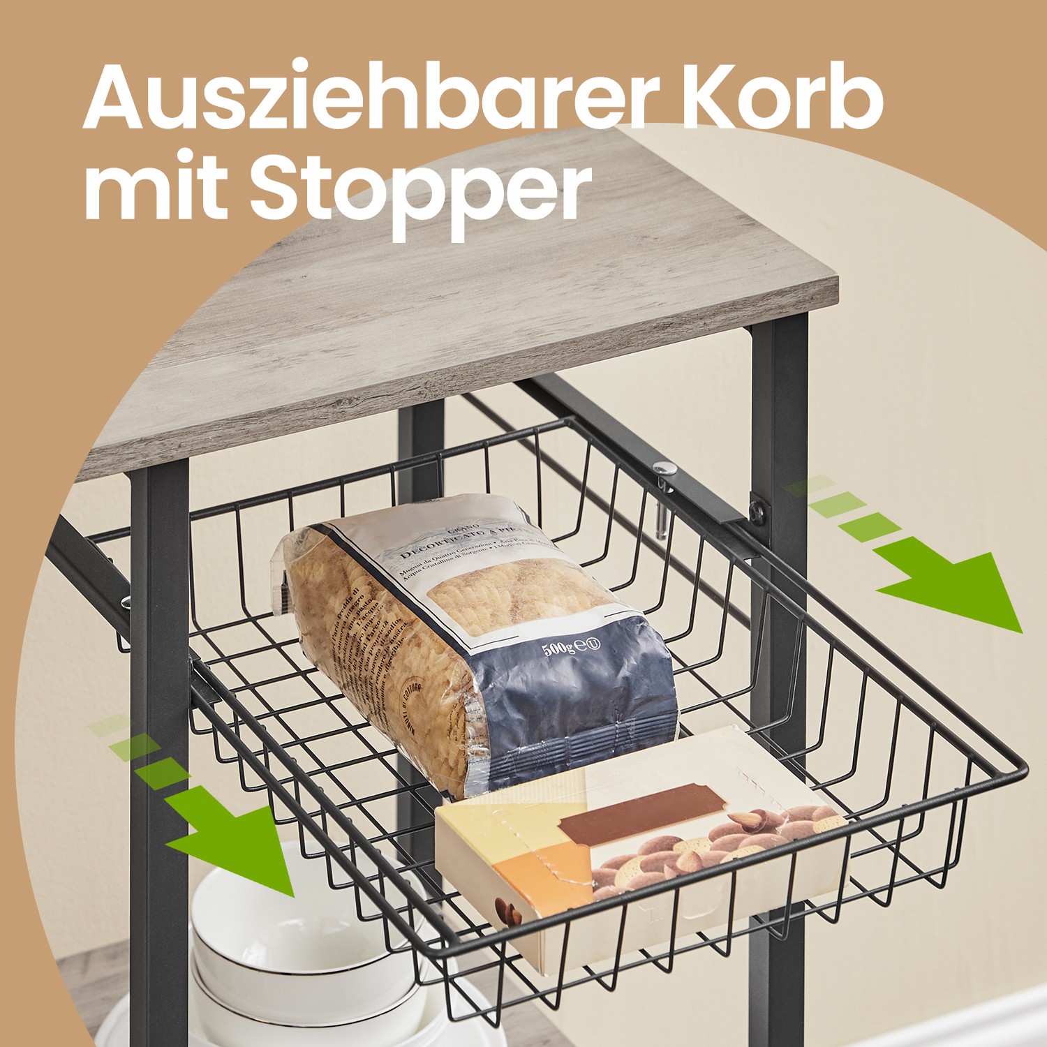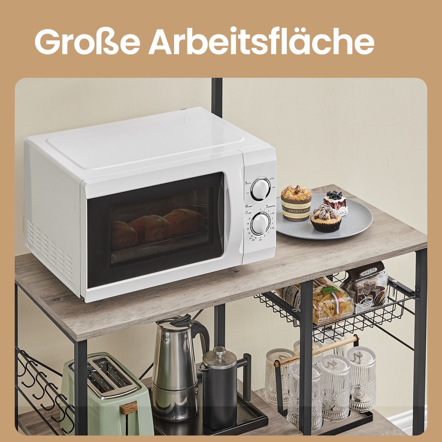 Product details: – Color: Greige-black – Material: Chipboard, steel – Size: 90 x 40 x 132 cm (L x W x H) – Weight: 15.7 kg – Max. static load capacity: – Top shelf: 15 kg – Surface: 25 kg – Middle and bottom shelves: 15 kg – Wire basket: 5 kg Scope of delivery: – 1 x kitchen shelf – 6 x hooks – 1 x accessory pack – 1 x instructions (DE, EN, IT, FR, ES) VASAGLE Notes: – For safety reasons, children are not allowed to climb on or play with the product. – Please secure this product to the wall using the included anti-tip device to ensure safe use. – For hygiene reasons, please do not place food directly on the surface of the metal wire basket.