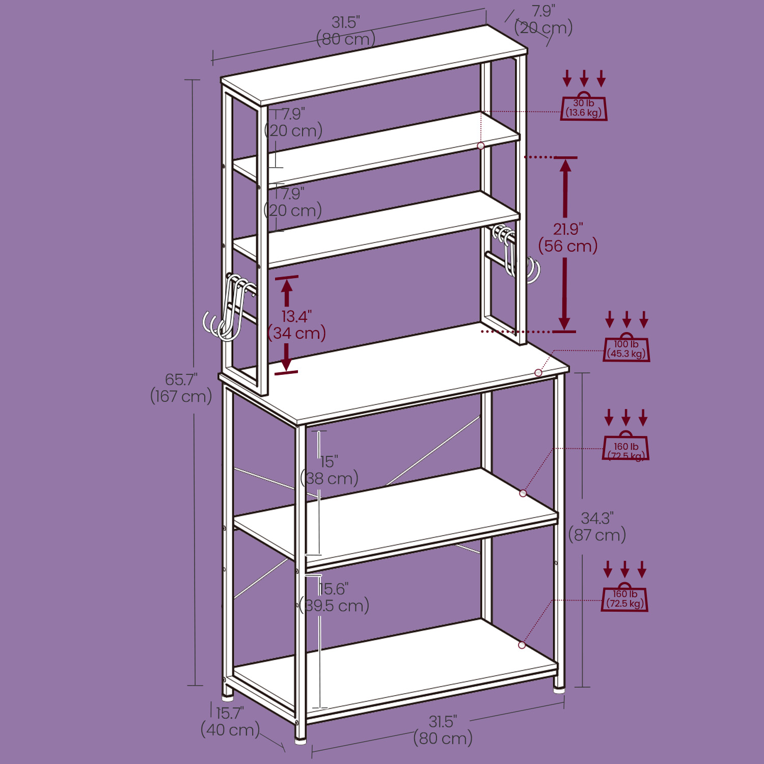 – Max. static load capacity of each upper shelf: 13.6 kg