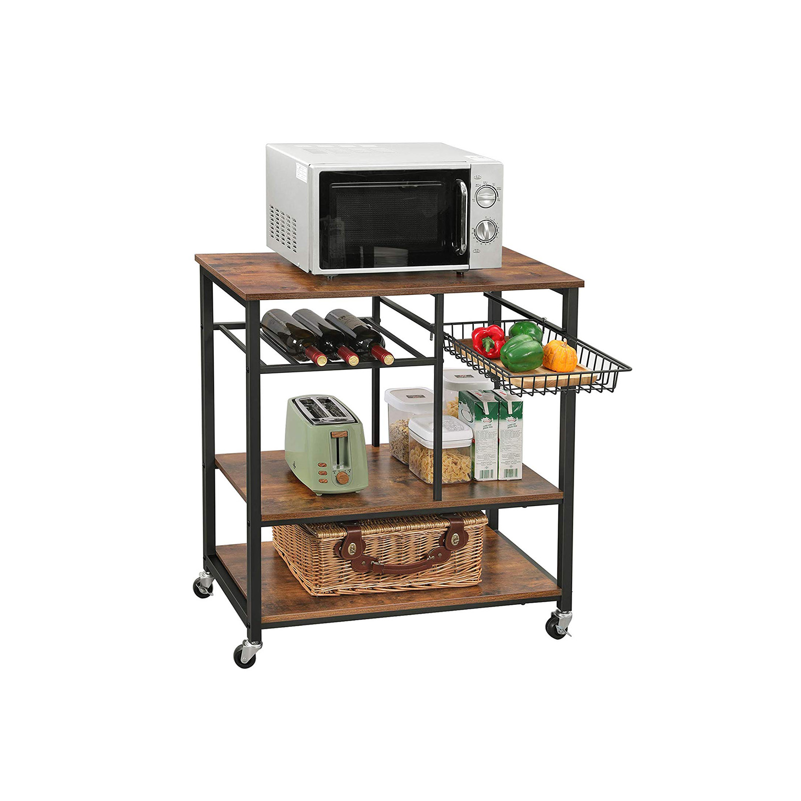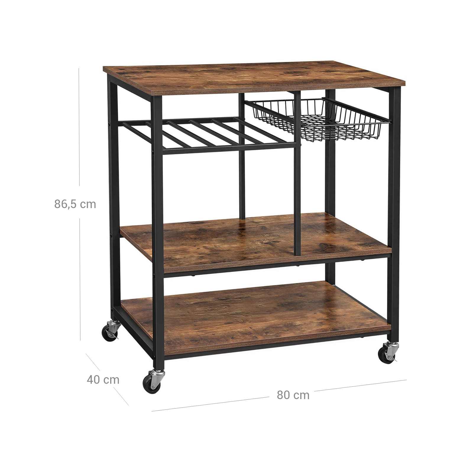 VASAGLE kitchen shelf with metal basket and bottle holder, wine rack, serving trolley, kitchen trolley, rolling cart with 3 shelves, 80 x 40 x 86.5 cm, industrial design, vintage, dark brown KKS80X