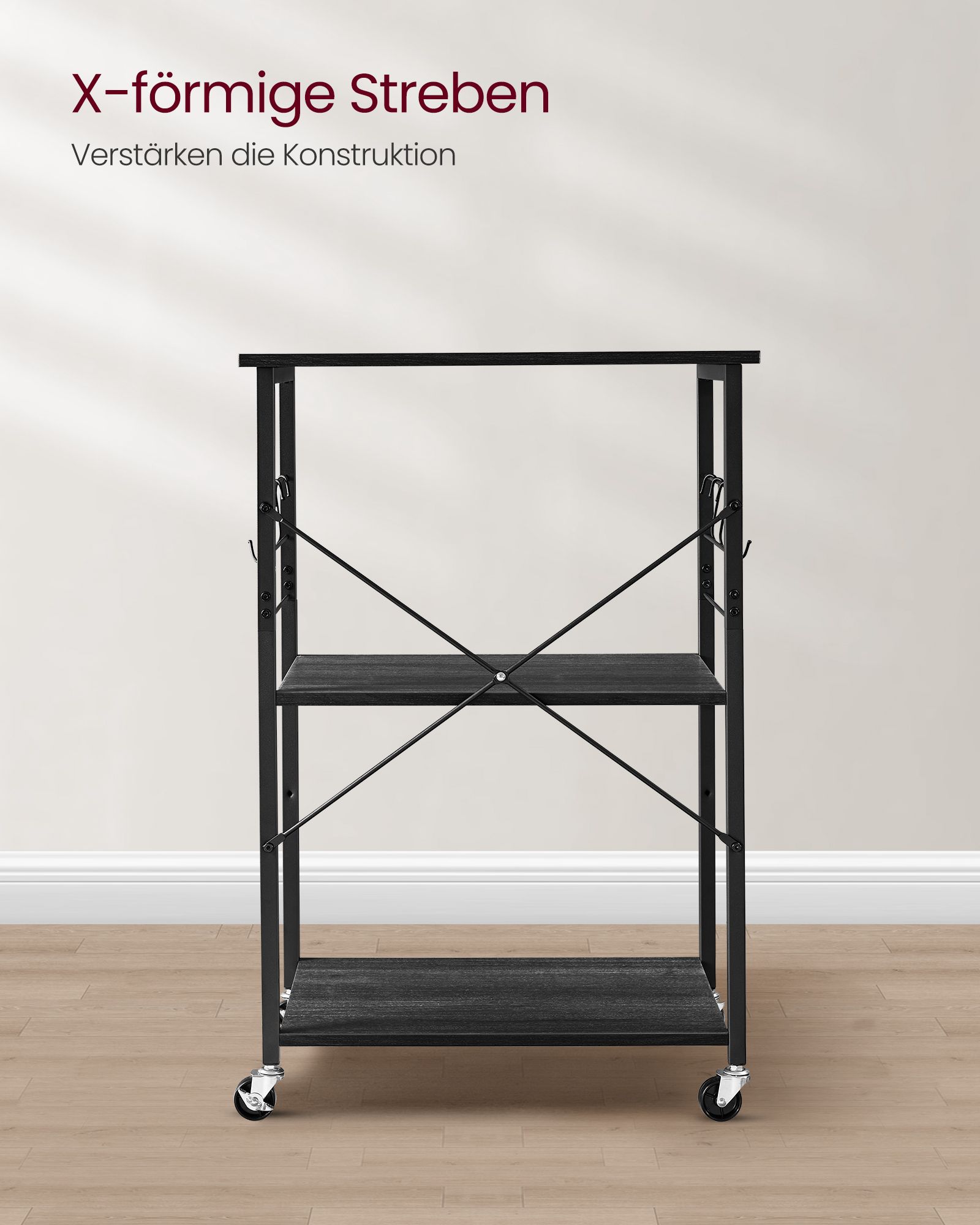 VASAGLE Kitchen shelf on casters, serving trolley with 3 shelves, microwave shelf, for mini oven, toaster, kettle, metal, with 6 hooks, industrial design, vintage, dark brown KKS60XV1