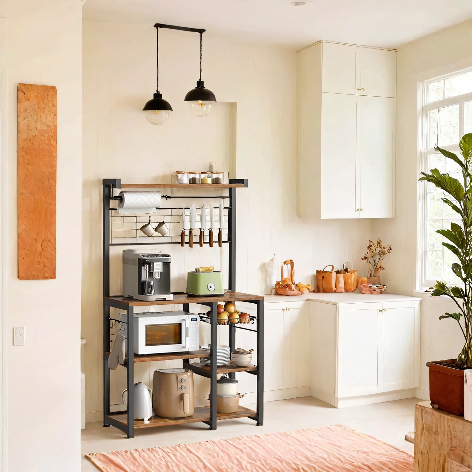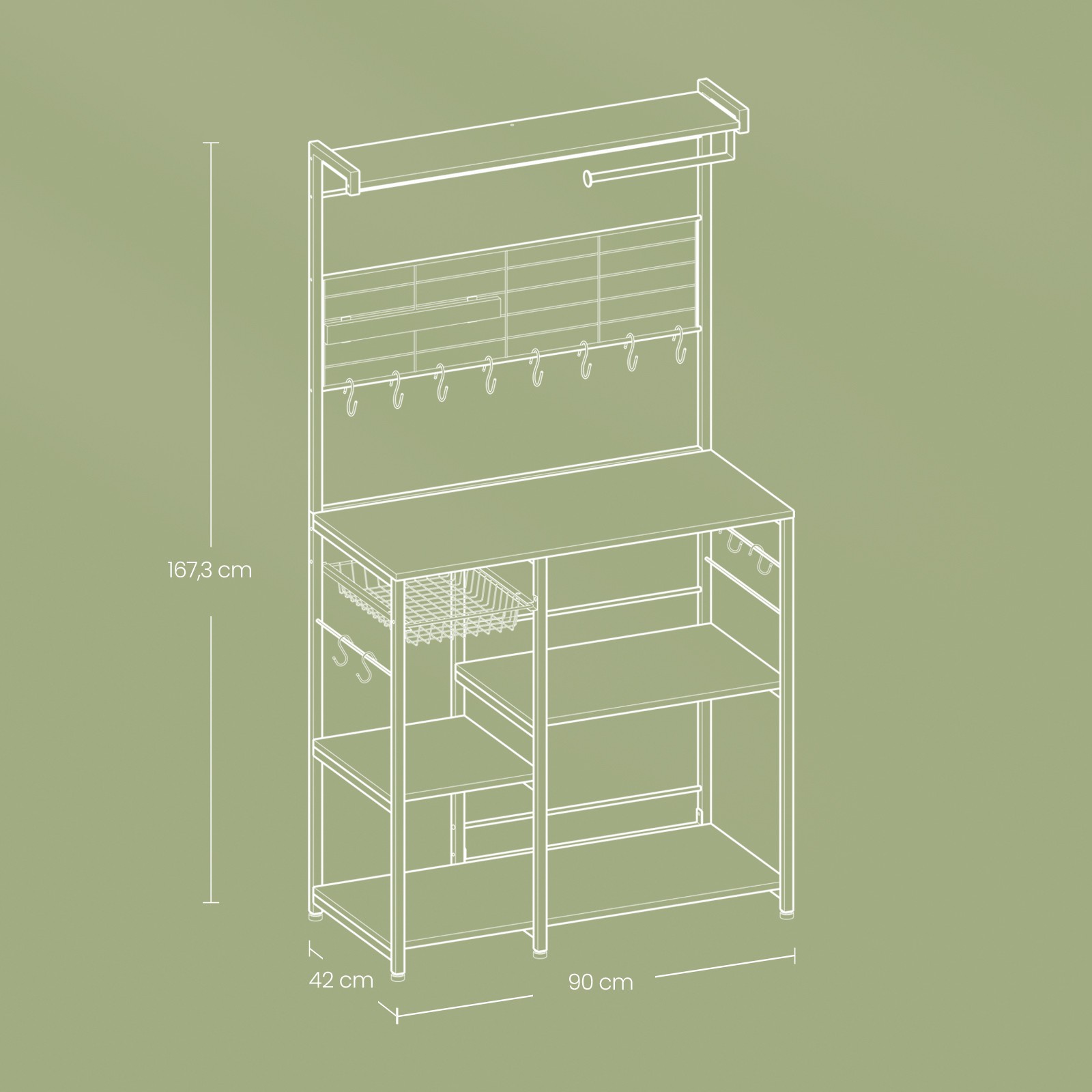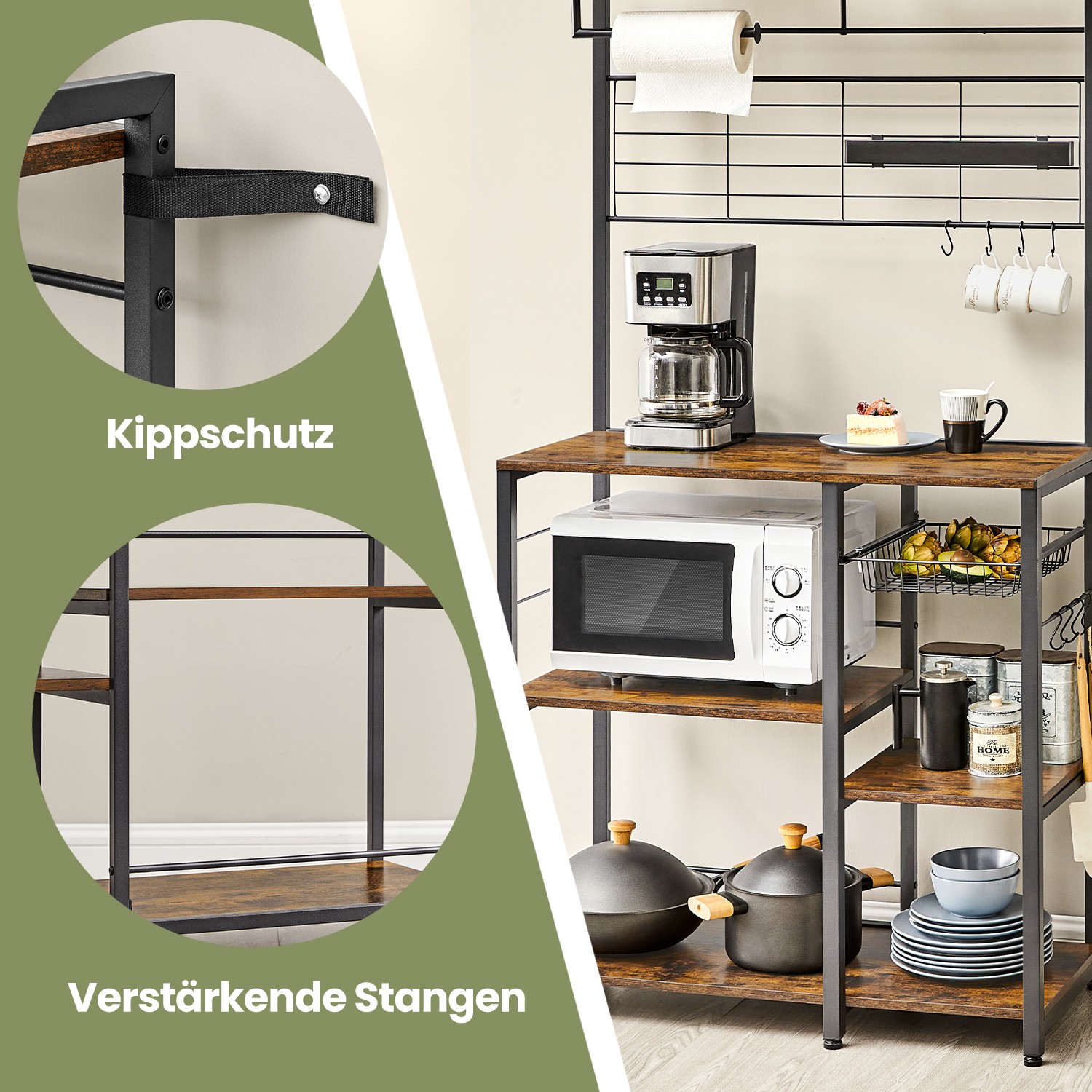 VASAGLE Kitchen Shelf, Free-Standing Shelf, Shelving Unit, Kitchen Worktop, Kitchen Island with Magnetic Strip for Knives, Wire Basket, Kitchen Roll Holder, 12 Hooks, Vintage Brown-Black KKS026B01