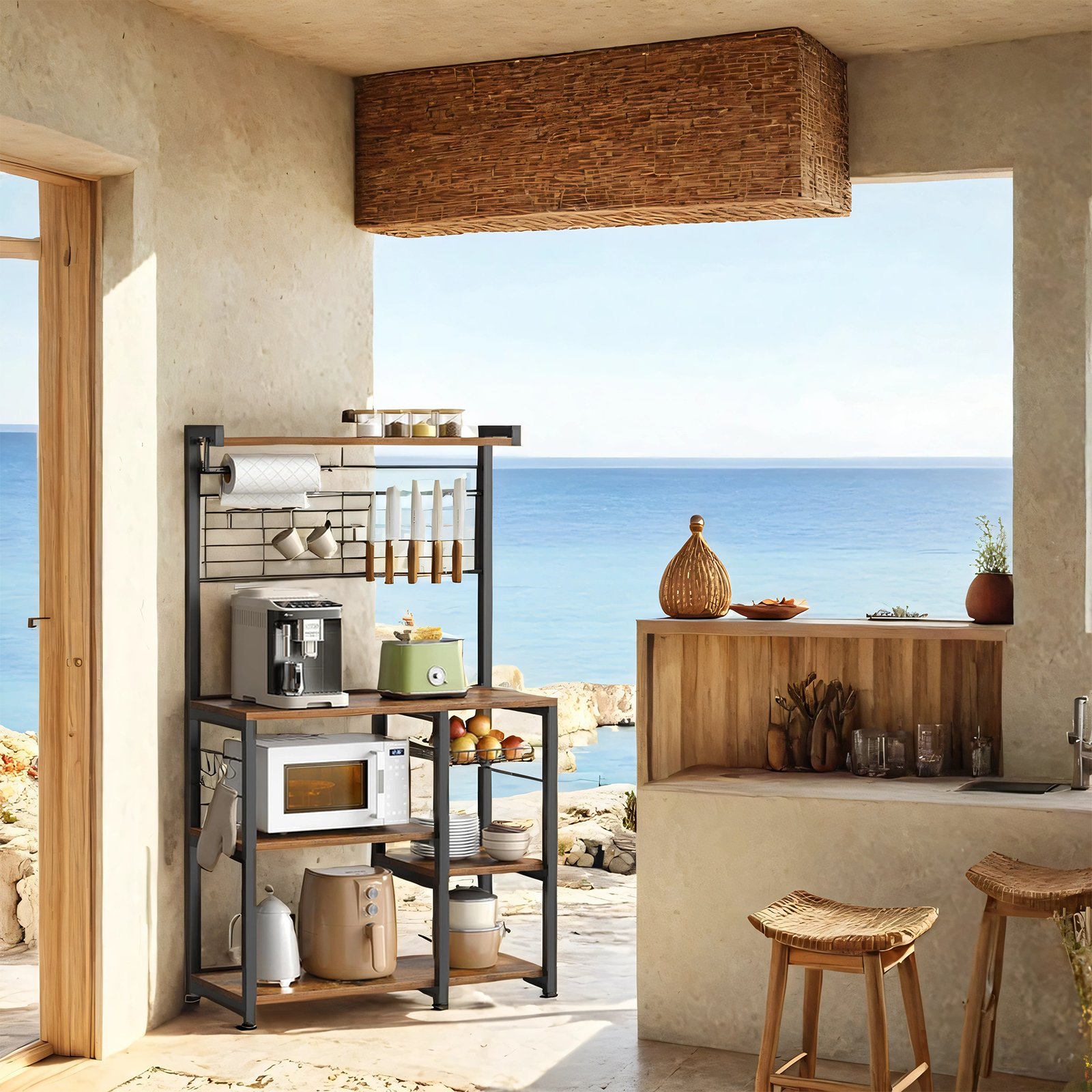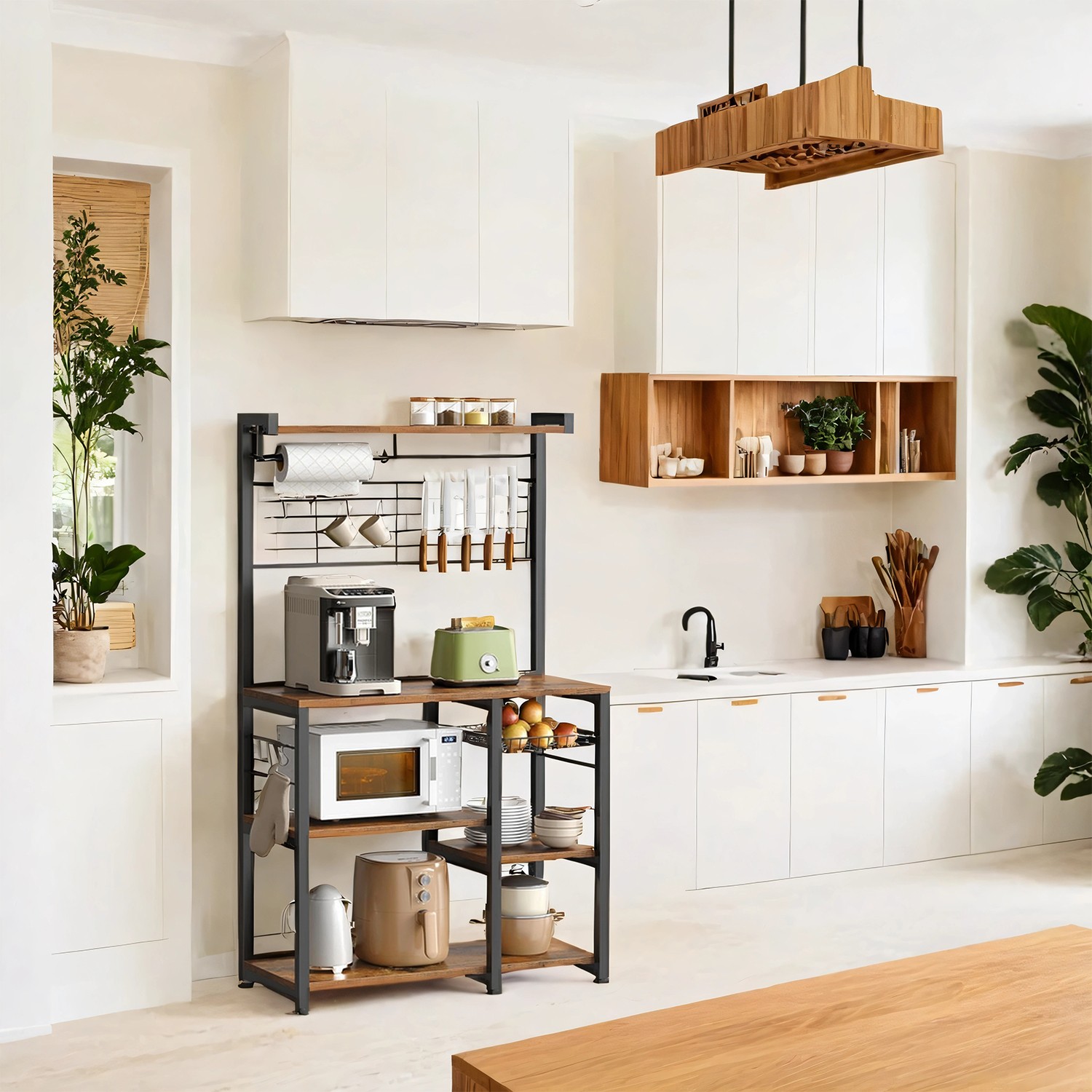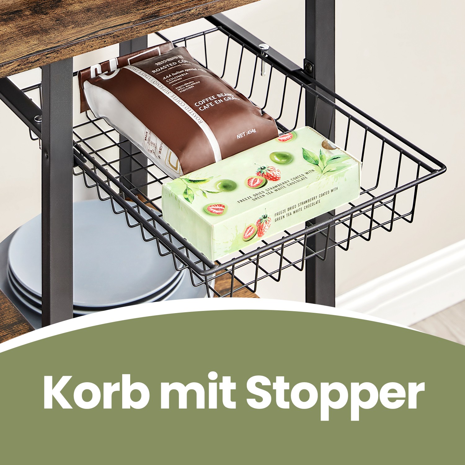 VASAGLE Kitchen Shelf, Free-Standing Shelf, Shelving Unit, Kitchen Worktop, Kitchen Island with Magnetic Strip for Knives, Wire Basket, Kitchen Roll Holder, 12 Hooks, Vintage Brown-Black KKS026B01