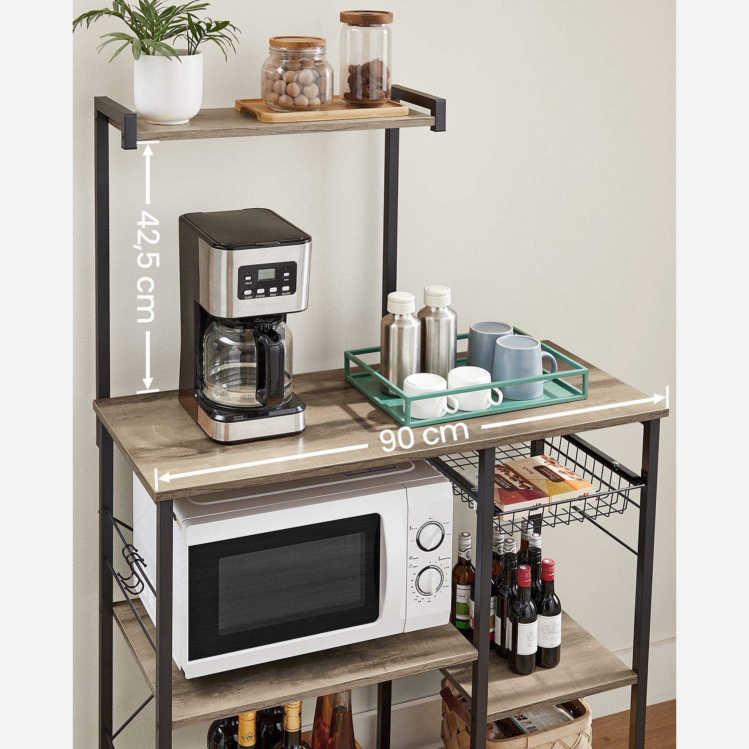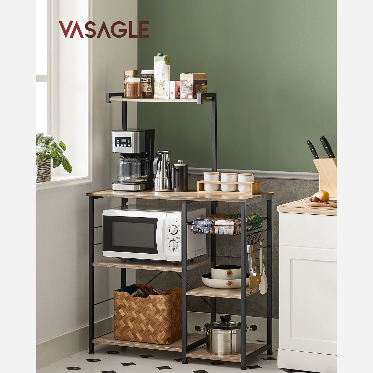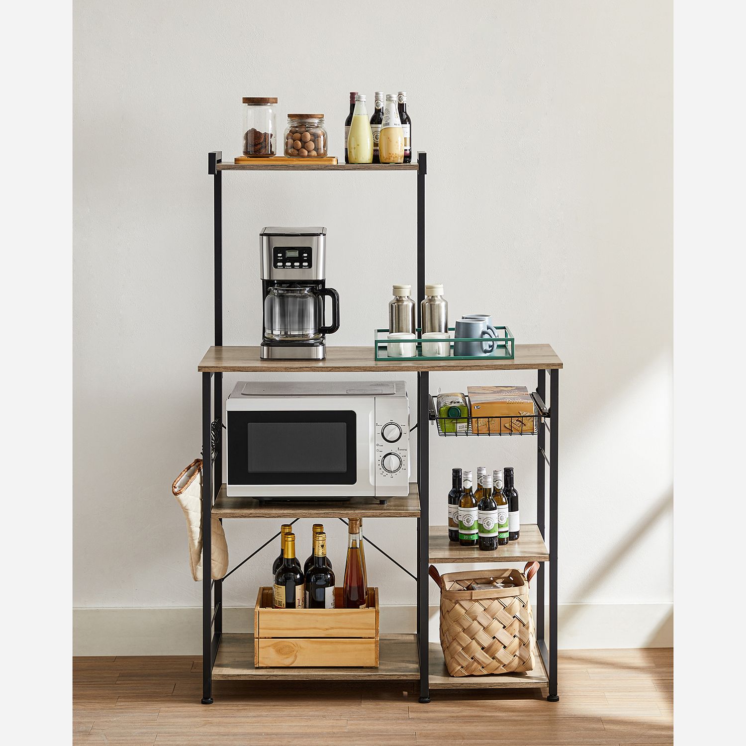 Product details: – Color: Oak brown-black – Material: Chipboard, steel – Size: 40 x 90 x 132 cm (D x W x H) – Weight: 15.8 kg – Max. static load capacity: – Top shelf: 15 kg – Surface: 25 kg – Middle and bottom shelves: 15 kg – Wire basket: 5 kg Scope of delivery: – 1 x kitchen shelf – 6 x hooks – 1 x accessory pack – 1 x instructions VASAGLE Notes:- For safety reasons, children are not allowed to climb on or play with the product. – Please secure this product to the wall with the included anti-tip device to ensure safe use. – For hygiene reasons, please do not place food directly on the surface of the metal wire basket.