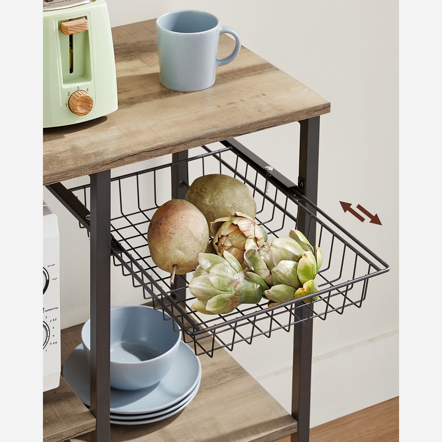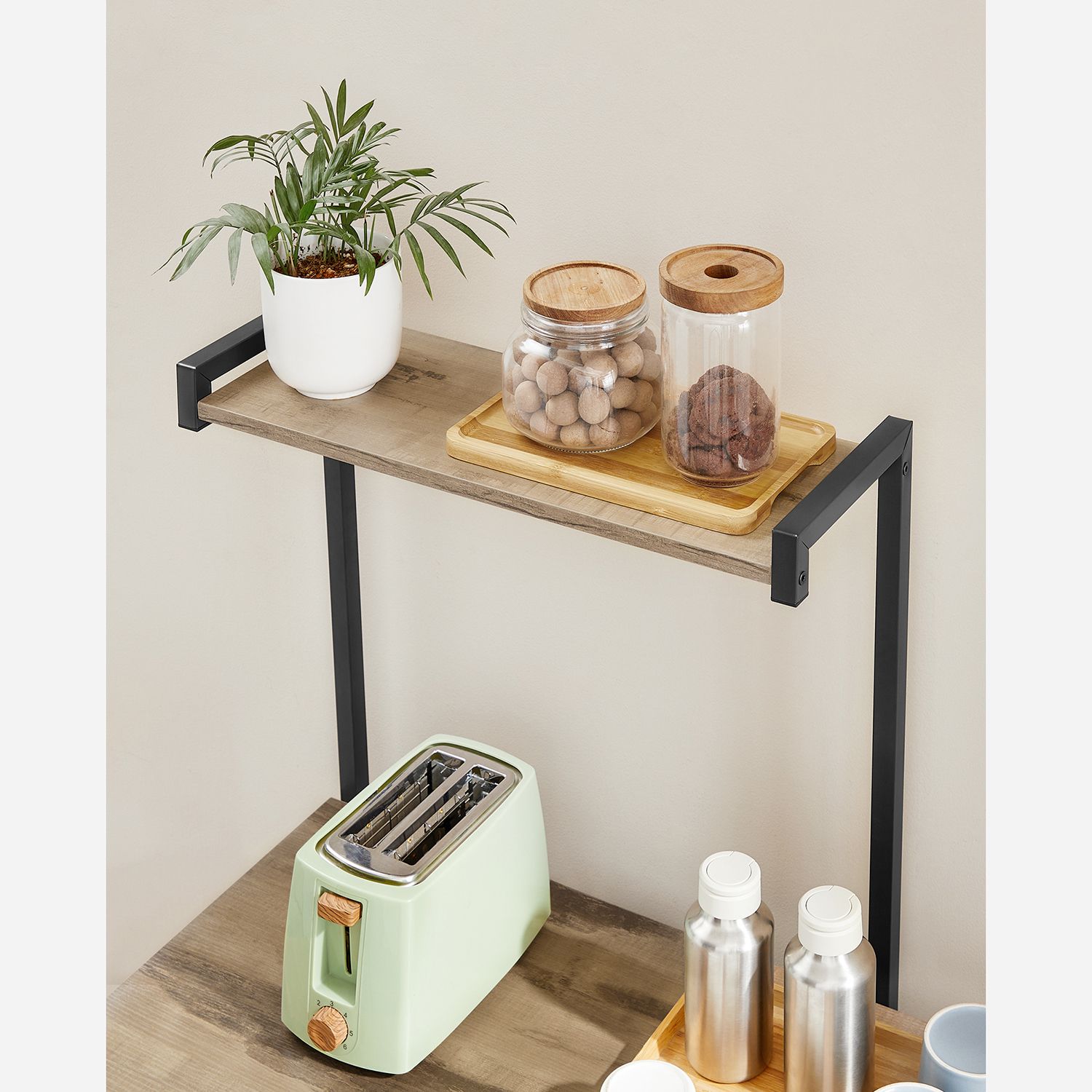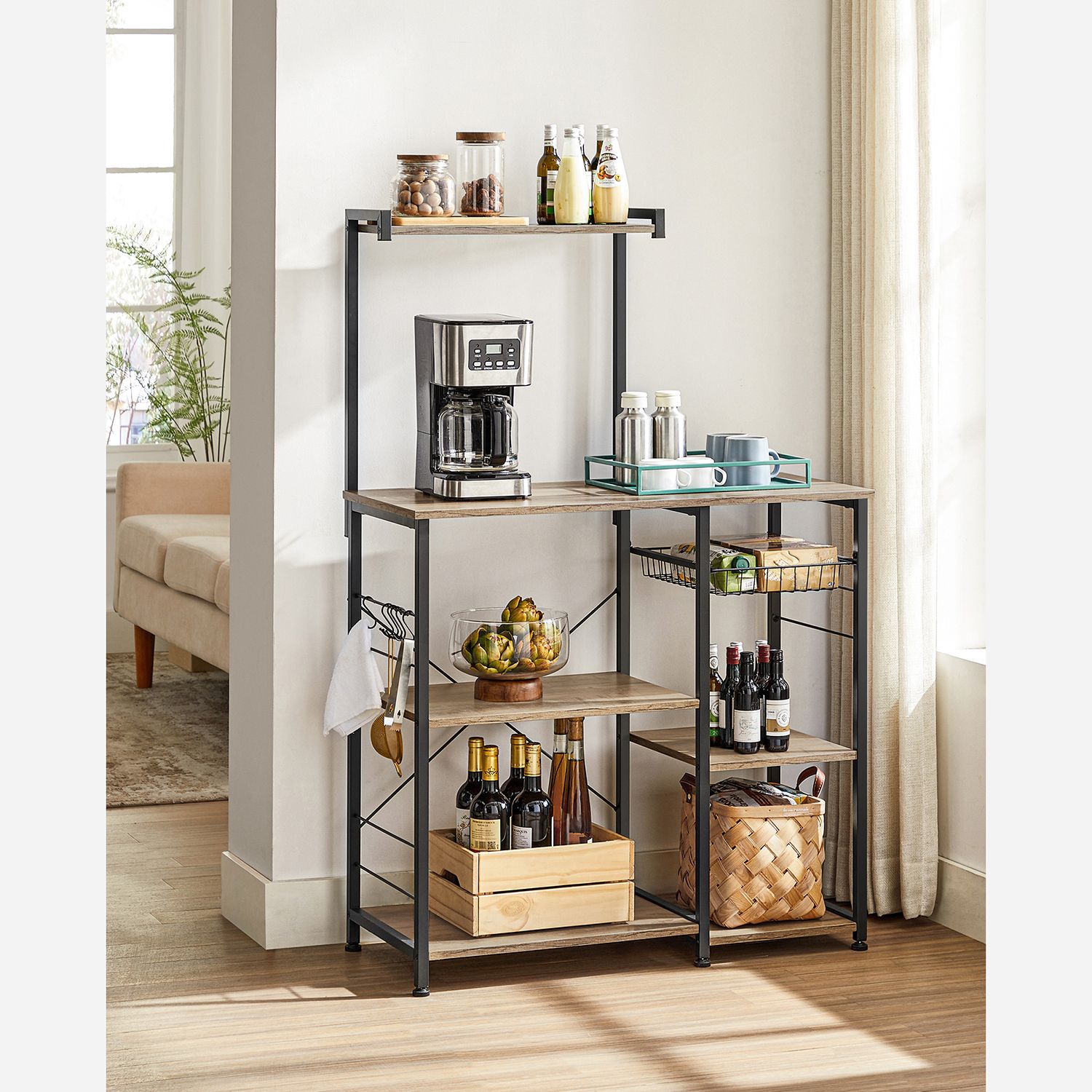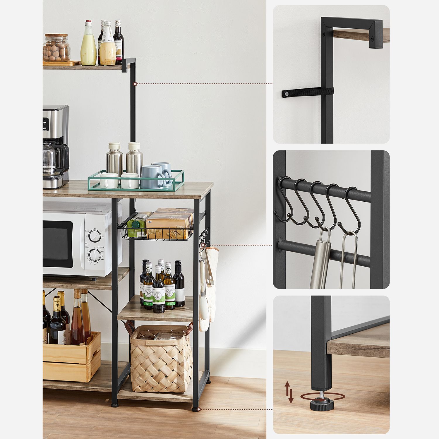 Product details: – Color: Oak brown-black – Material: Chipboard, steel – Size: 40 x 90 x 132 cm (D x W x H) – Weight: 15.8 kg – Max. static load capacity: – Top shelf: 15 kg – Surface: 25 kg – Middle and bottom shelves: 15 kg – Wire basket: 5 kg Scope of delivery: – 1 x kitchen shelf – 6 x hooks – 1 x accessory pack – 1 x instructions VASAGLE Notes:- For safety reasons, children are not allowed to climb on or play with the product. – Please secure this product to the wall with the included anti-tip device to ensure safe use. – For hygiene reasons, please do not place food directly on the surface of the metal wire basket.