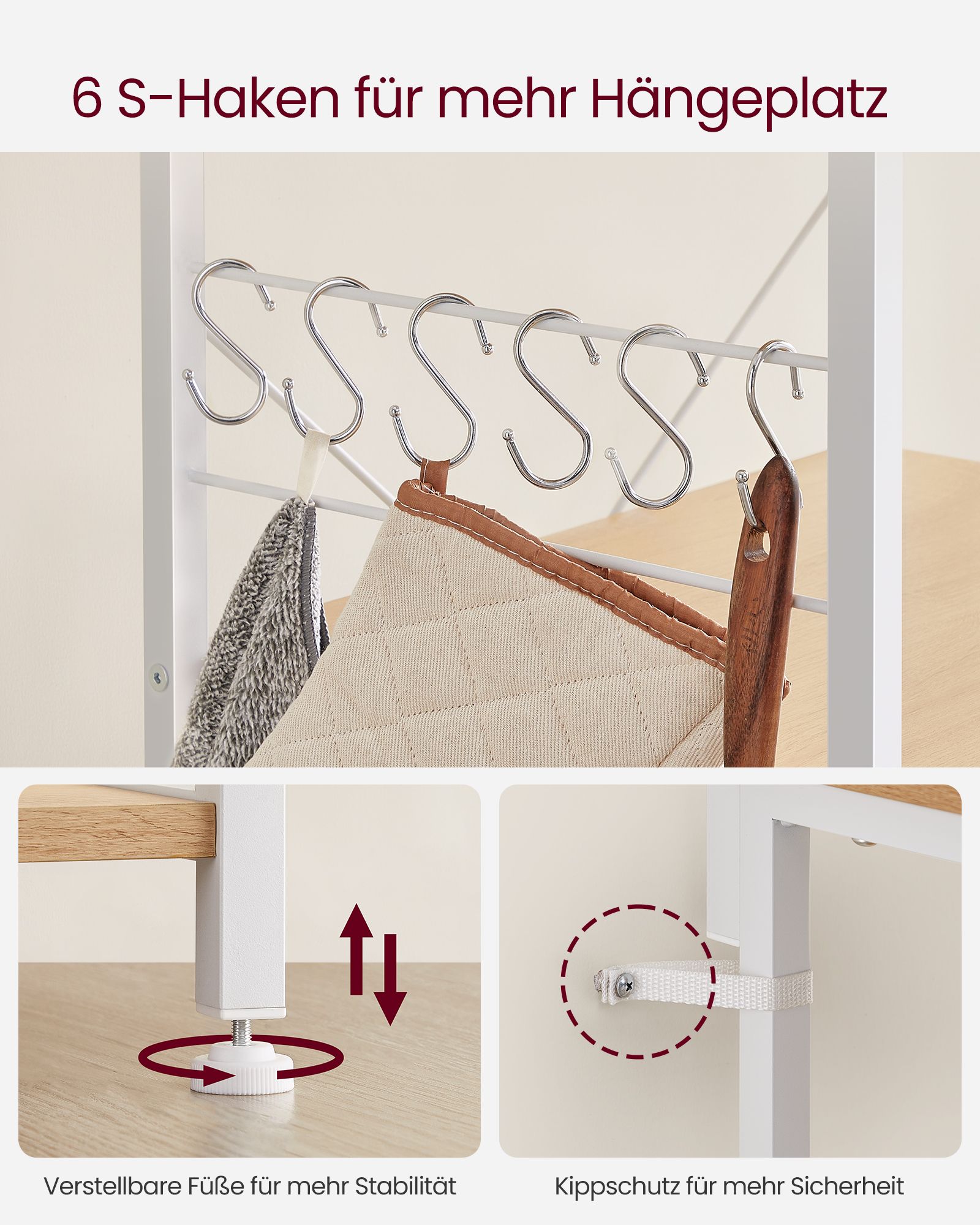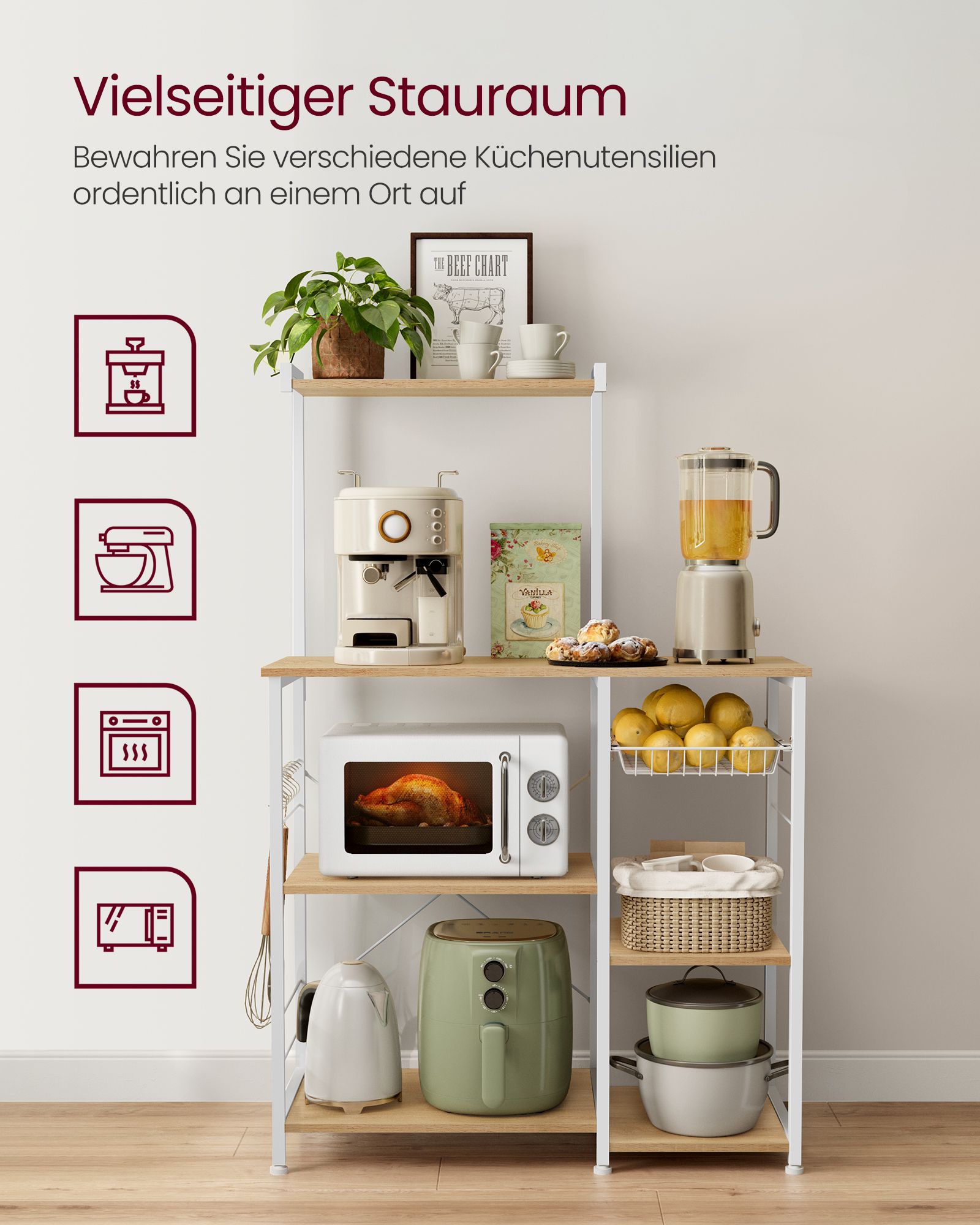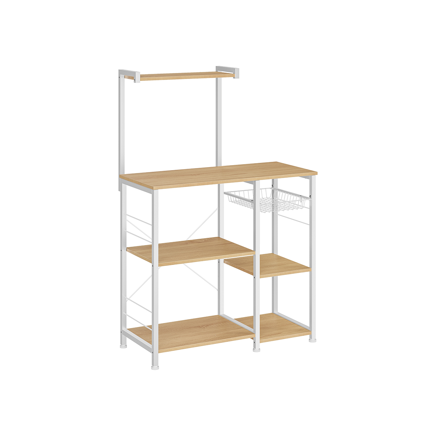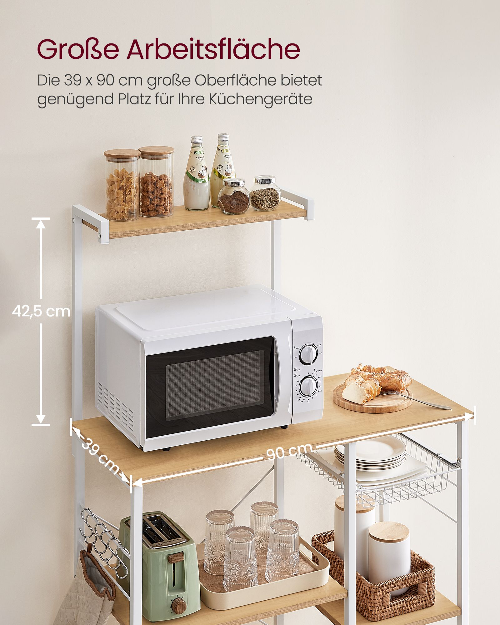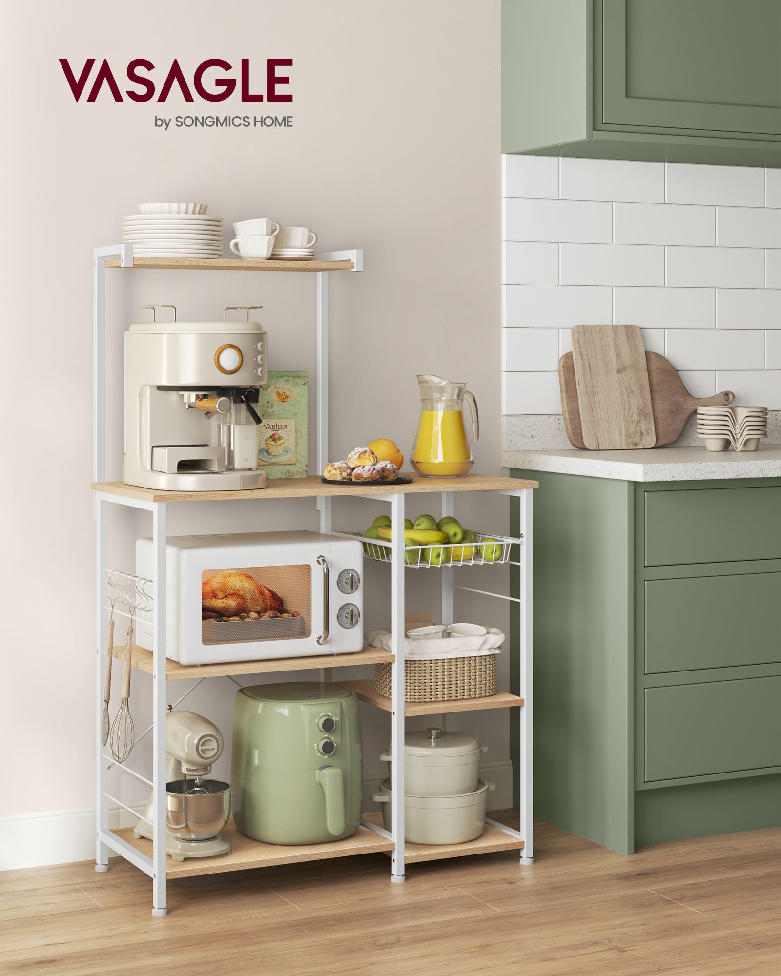 VASAGLE kitchen shelf, standing shelf with metal basket, baker’s shelf with 6 S-hooks and shelf trays, microwave shelf, spice rack, for pots and pans, industrial design, greige-black KKS035B02