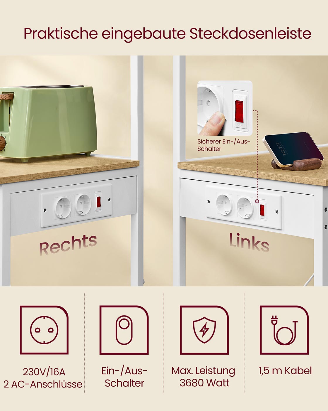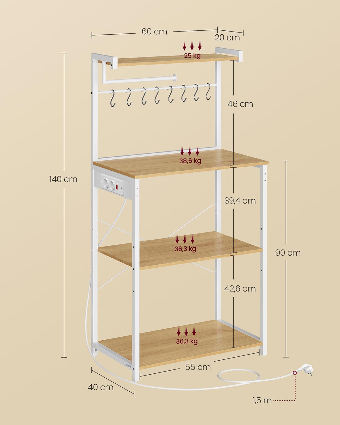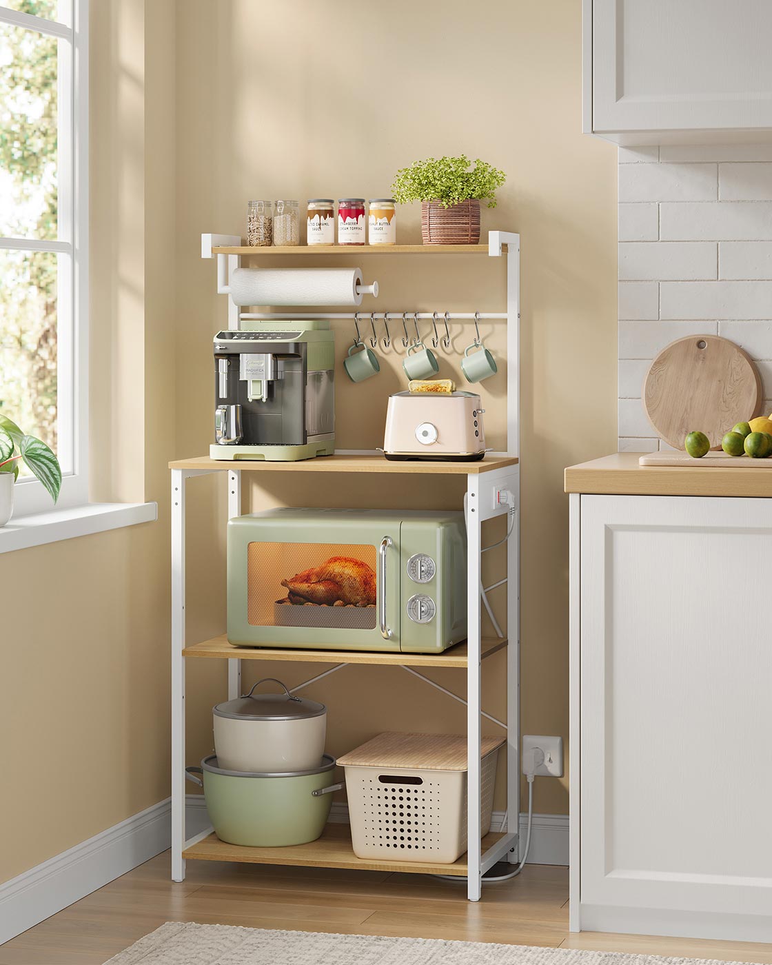 VASAGLE kitchen shelf with sockets, standing shelf, microwave shelf 4 levels, adjustable shelf, kitchen roll holder, 40 x 60 x 140 cm, vintage brown-ink black KKS014K02