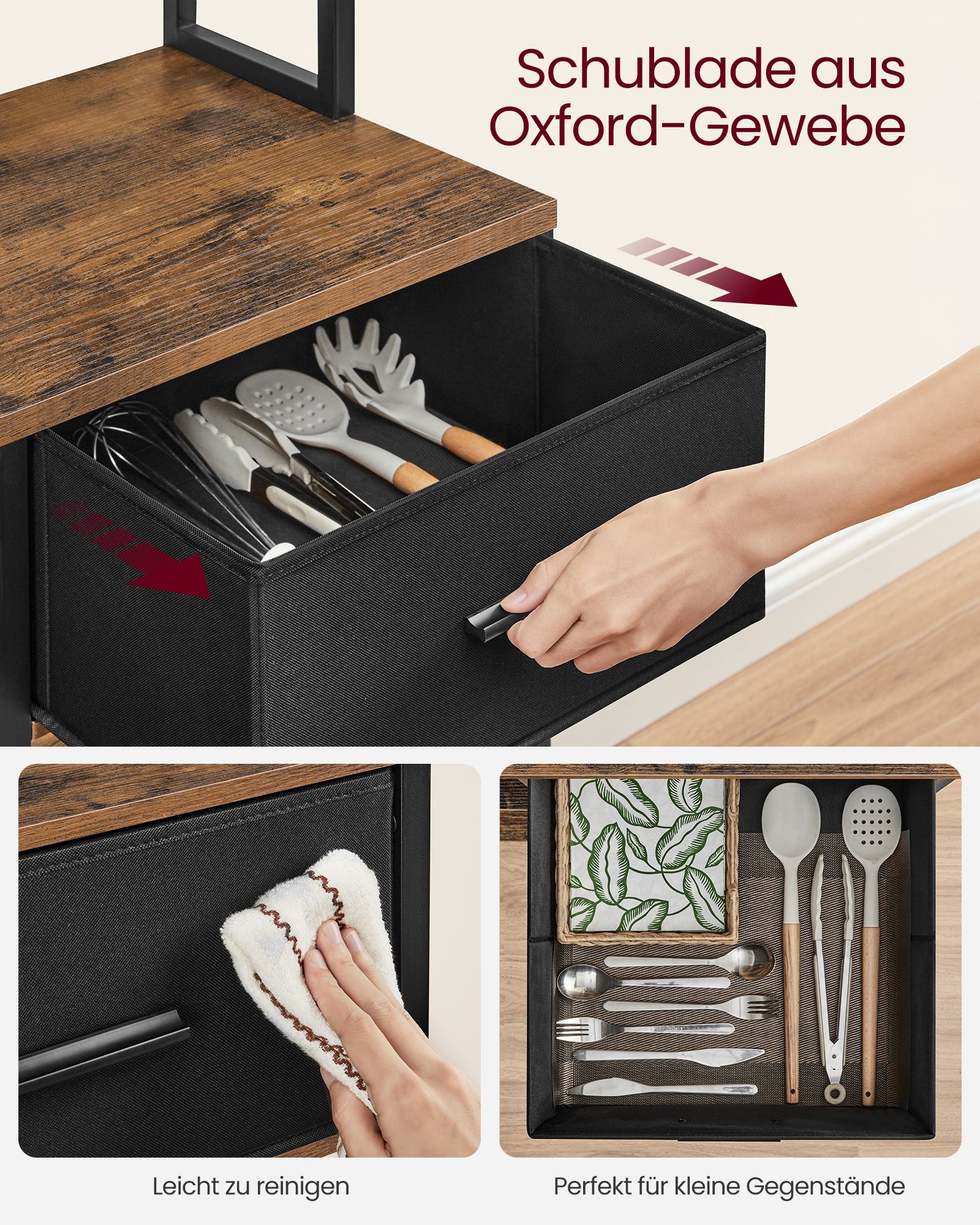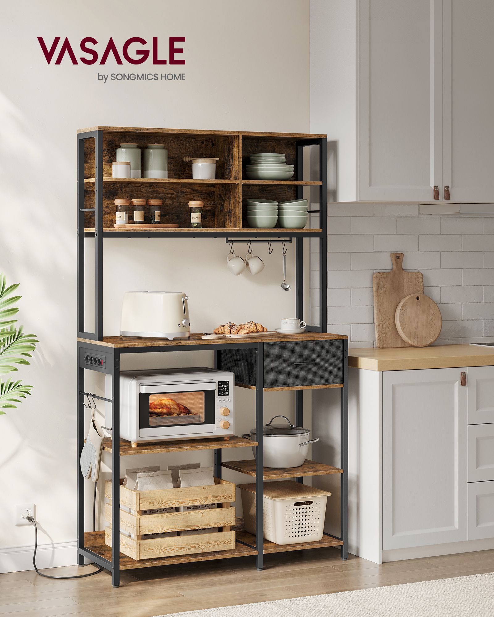 VASAGLE kitchen shelf with sockets, standing shelf, microwave shelf with adjustable shelves, fabric drawer, 12 hooks, for microwave, shelf for kitchen