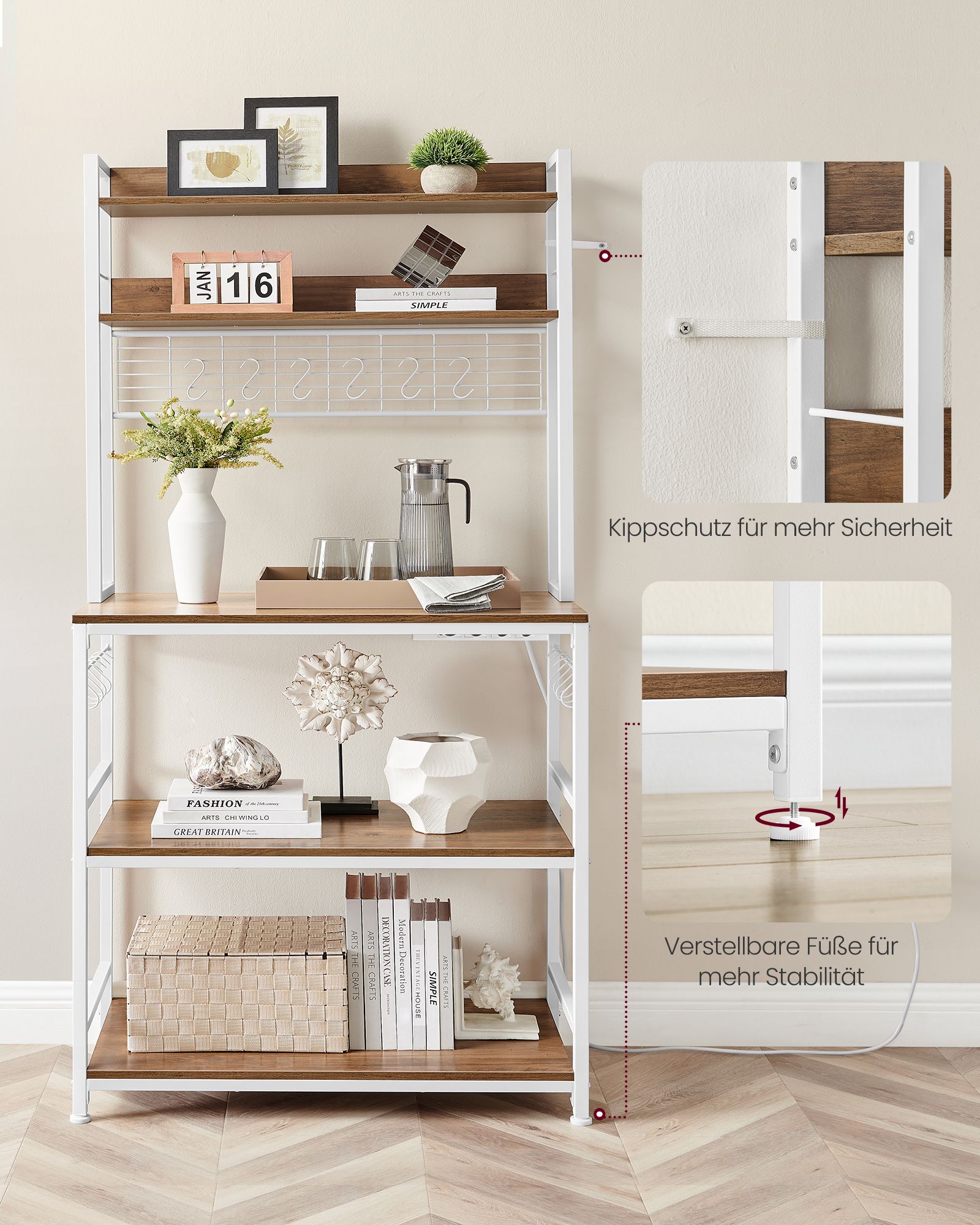 VASAGLE Kitchen Shelf, Free-Standing Shelf with Power Sockets, Microwave Shelf, with Wire Shelf, 14 Hooks, 40 x 80 x 170 cm, Vintage Brown-Black KKS025B01EU