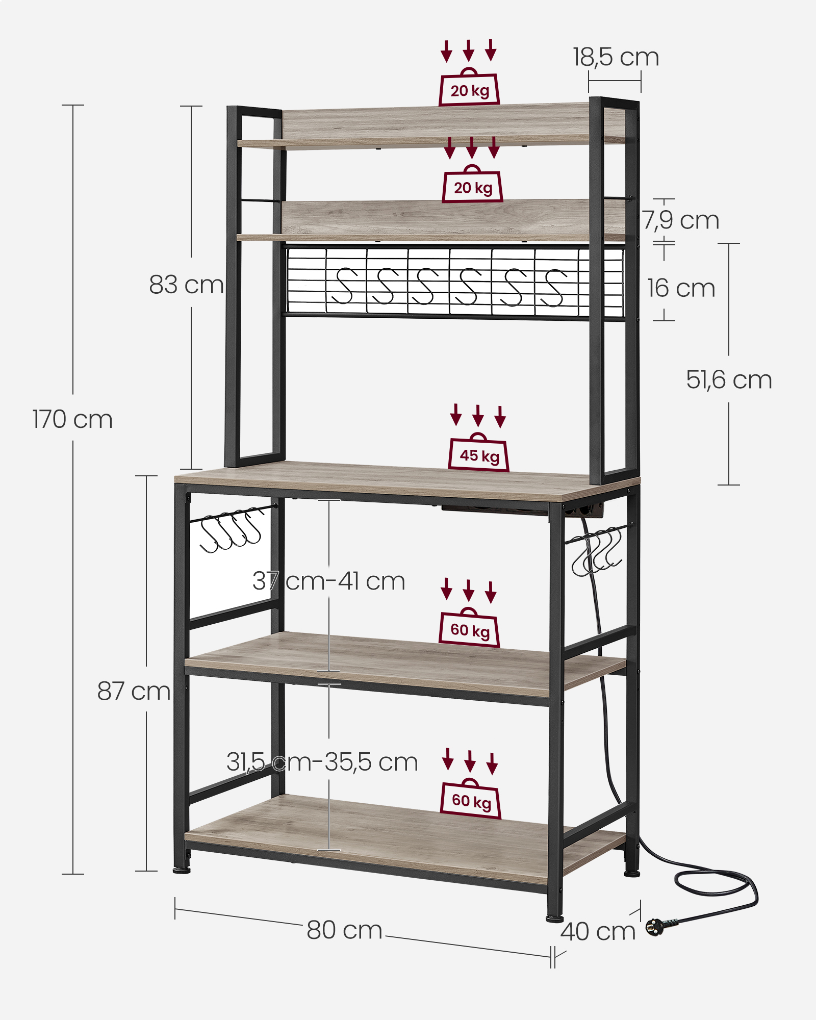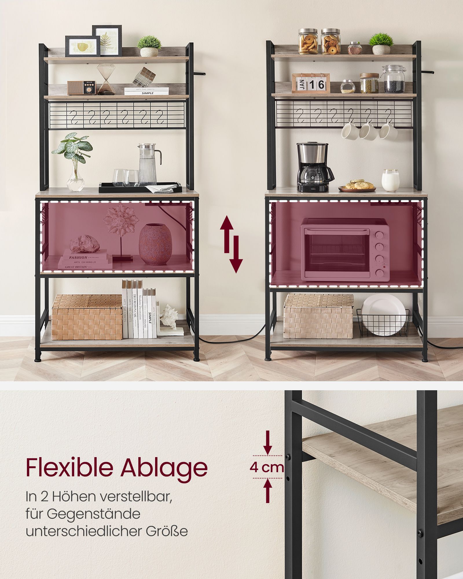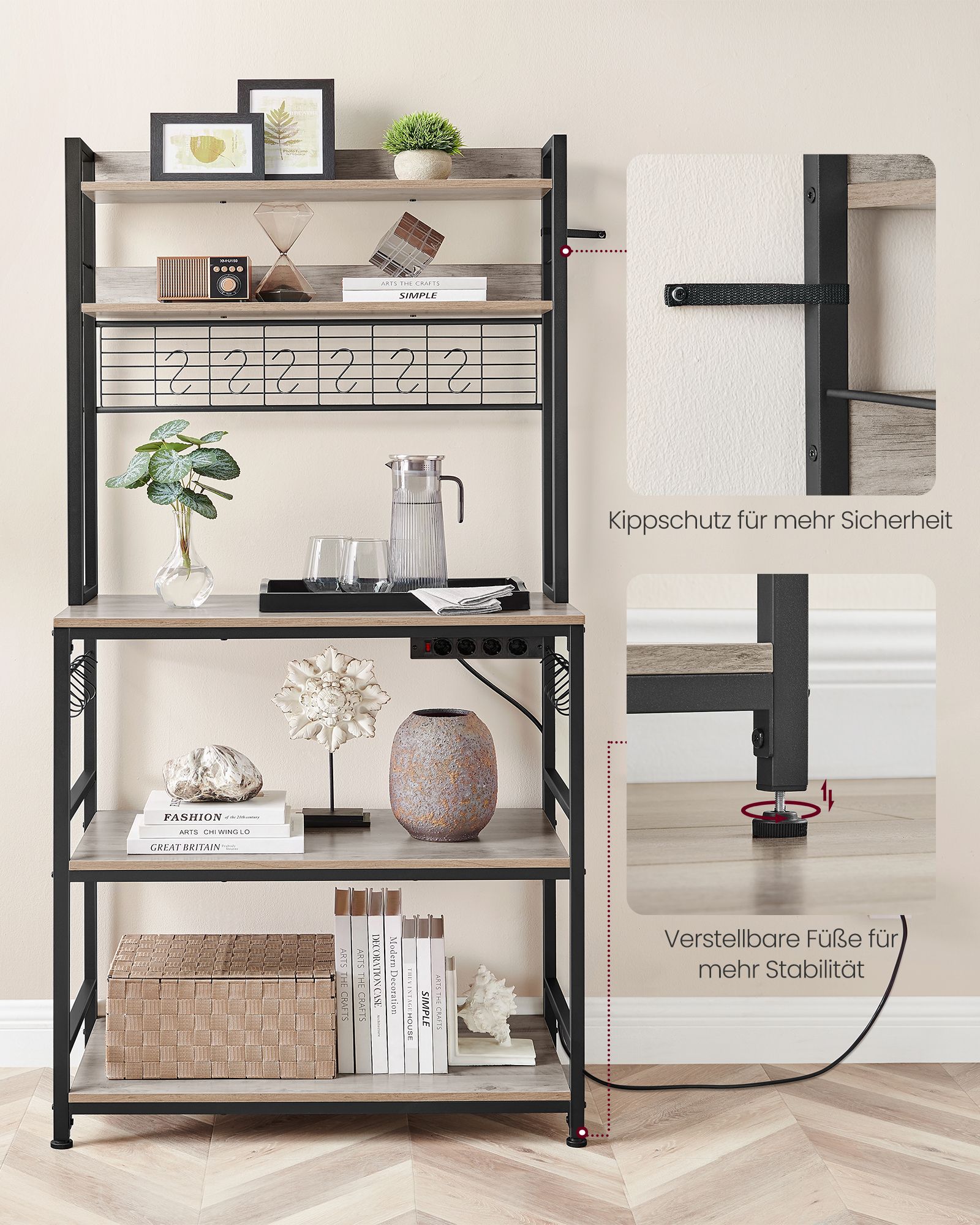 VASAGLE Kitchen Shelf, Free-Standing Shelf with Power Sockets, Microwave Shelf, with Wire Shelf, 14 Hooks, 40 x 80 x 170 cm, Vintage Brown-Black KKS025B01EU
