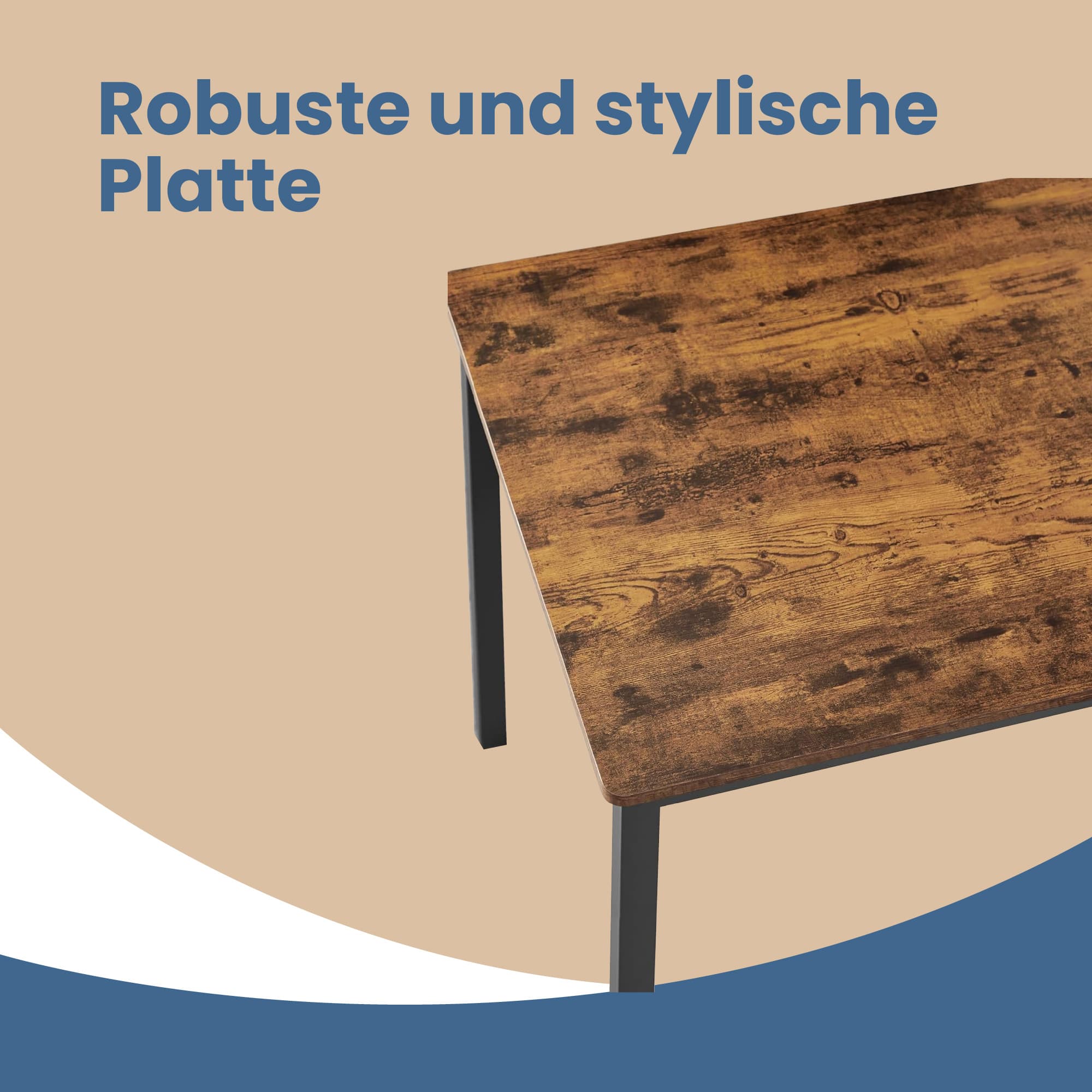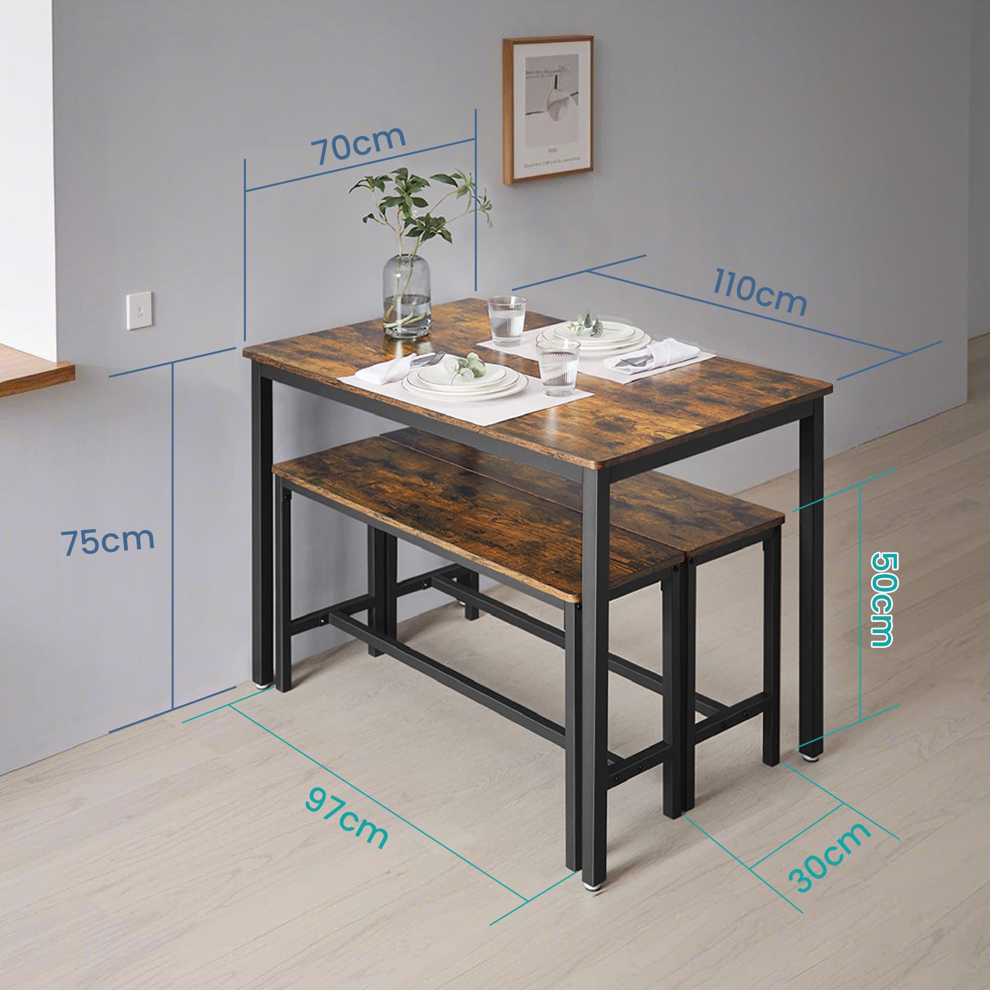 Product details: – Color: Vintage brown-black – Material: Chipboard, steel – Dining table size: 110 x 70 x 75 cm (L x W x H) – Bench size: 97 x 30 x 50 cm (L x W x H) – Weight: 27 kg – Max. static load capacity of the dining table: 100 kg – Max. static load capacity per bench: 100 kg Scope of delivery: – 1 x dining table – 2 x benches – 1 x accessory pack – 1 x anti-tip device – 1 x instructions (DE, EN, ES, FR, IT) VASAGLE Notes: – For safety reasons, children are not allowed to climb on or play with the product. – The maximum static load capacity of the table surface is 100 kg. Please do not exceed this maximum weight. – Please attach this product to the wall using the included anti-tip device to ensure safe use. – Do not rock back and forth on the bench to prevent it from tipping over.