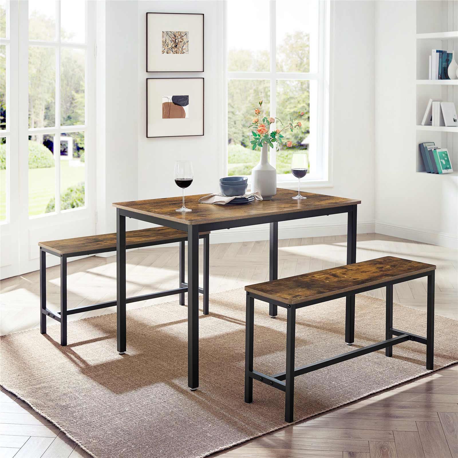 Product details: – Color: Vintage brown-black – Material: Chipboard, steel – Dining table size: 110 x 70 x 75 cm (L x W x H) – Bench size: 97 x 30 x 50 cm (L x W x H) – Weight: 27 kg – Max. static load capacity of dining table: 100 kg – Max. static load capacity per bench: 100 kg Scope of delivery: – 1 x dining table – 2 x bench – 1 x accessory pack – 1 x anti-tip device – 1 x instructions (DE, EN, ES, FR, IT) VASAGLE Notes: – For safety reasons, children are not allowed to climb on or play with the product. – The maximum static load capacity of the table surface is 100 kg. Please do not exceed this maximum weight. – Please secure this product to the wall with the included anti-tip device to ensure safe use. – Do not rock back and forth on the bench to prevent it from tipping over.
