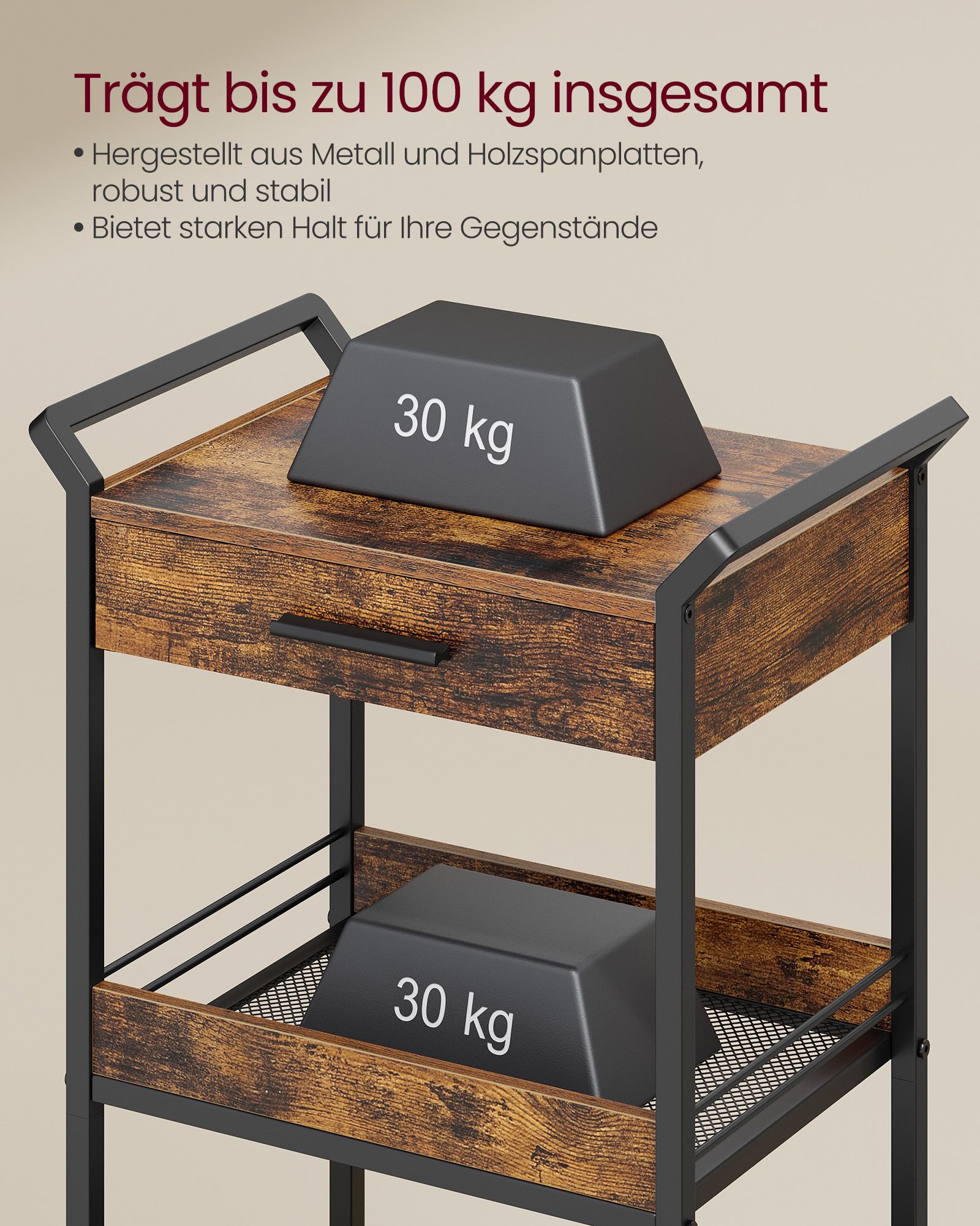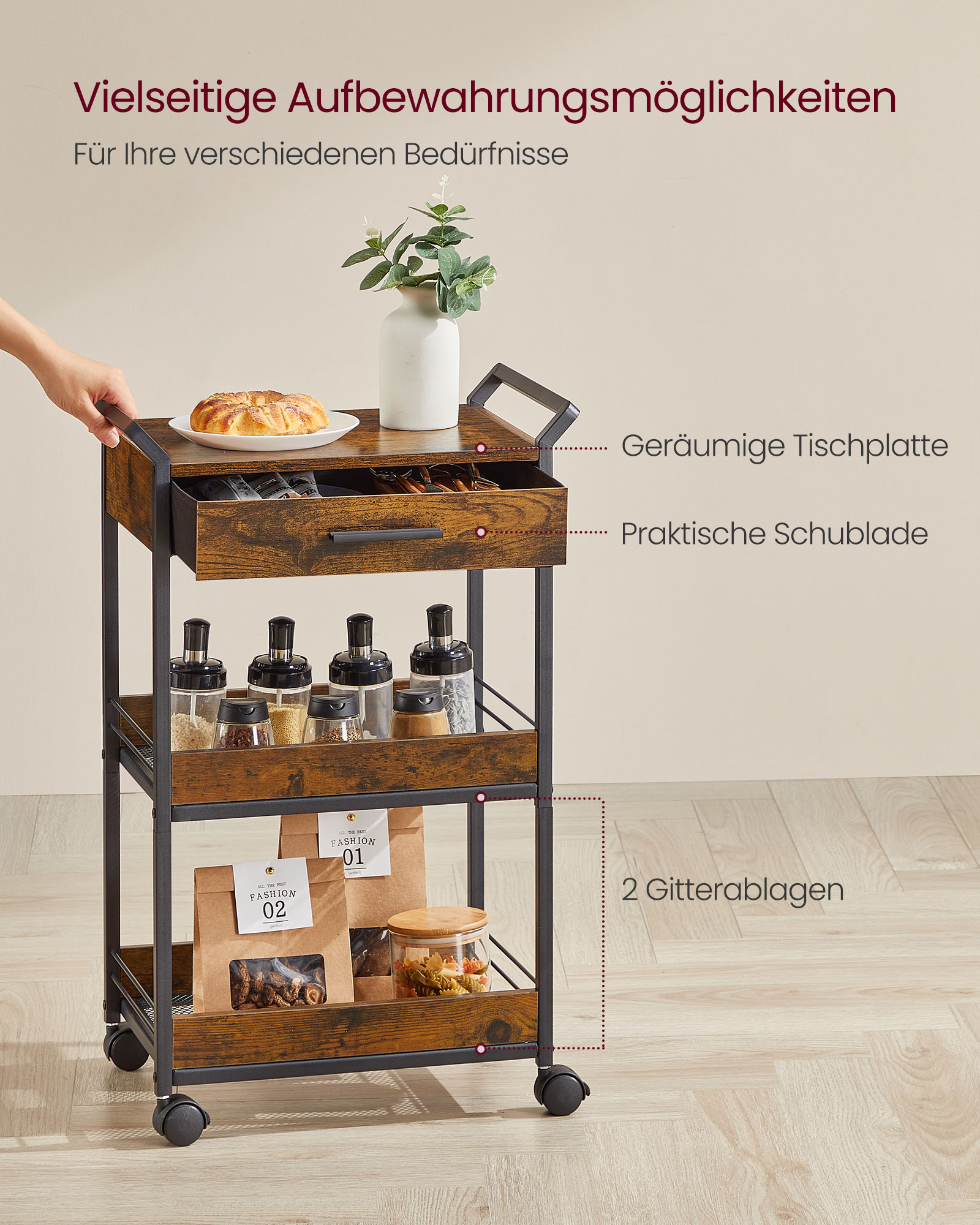 VASAGLE trolley, kitchen trolley with 3 levels, serving trolley with brakes, chipboard, top drawer, storage shelf for kitchen, bathroom, bedroom, vintage brown-ink black LRC048K01