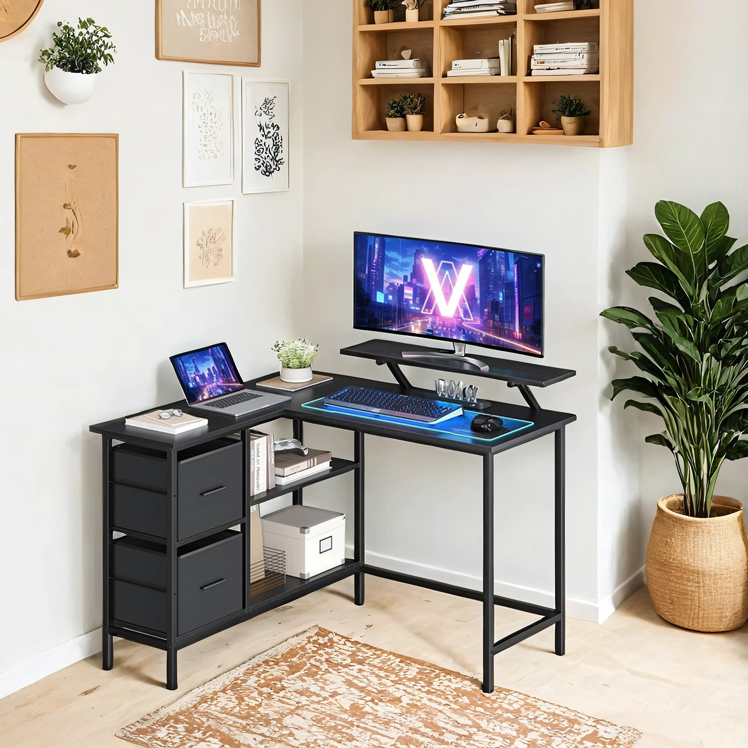 VASAGLE L-shaped desk, 2 spacious drawers, computer desk with monitor stand, corner desk, gaming table with adjustable shelf 115 x 105 cm vintage brown LWD097B01