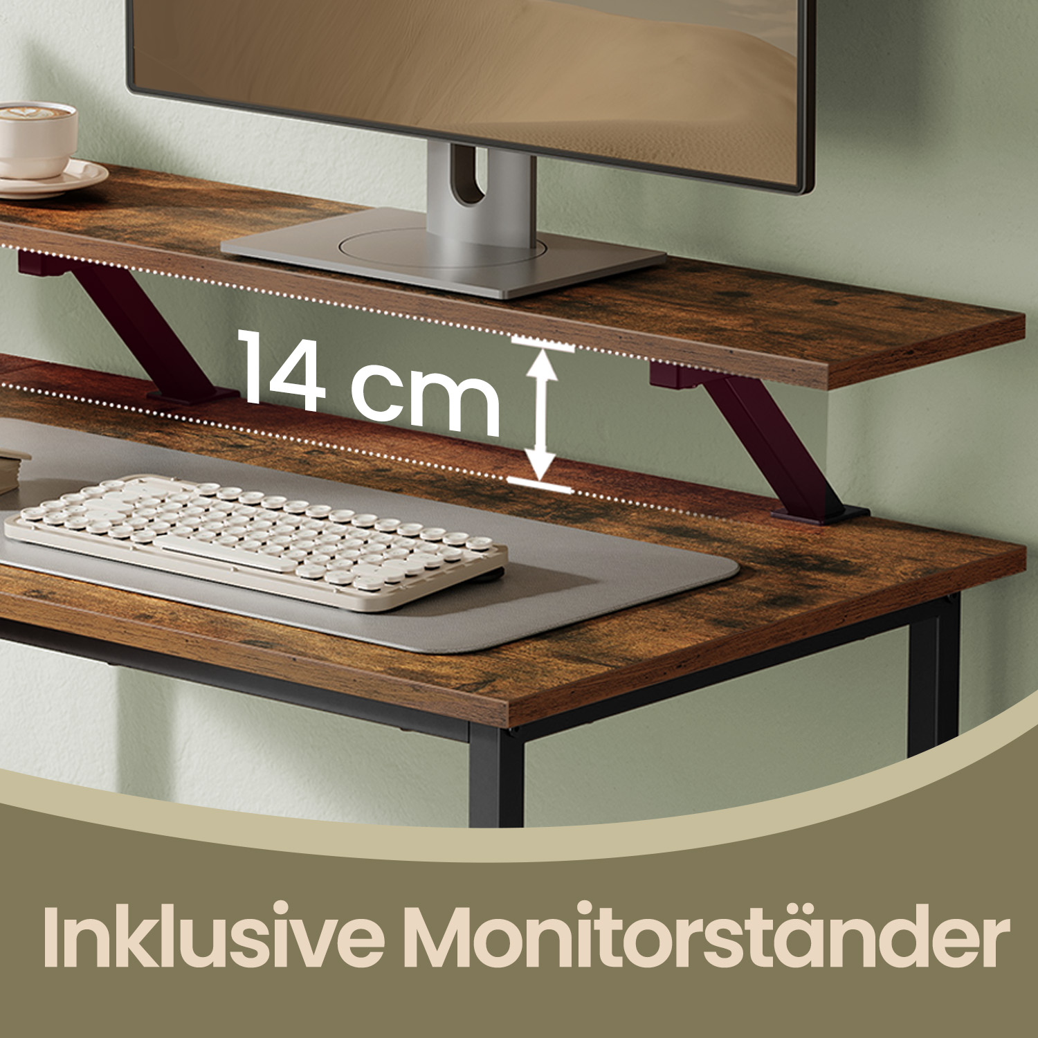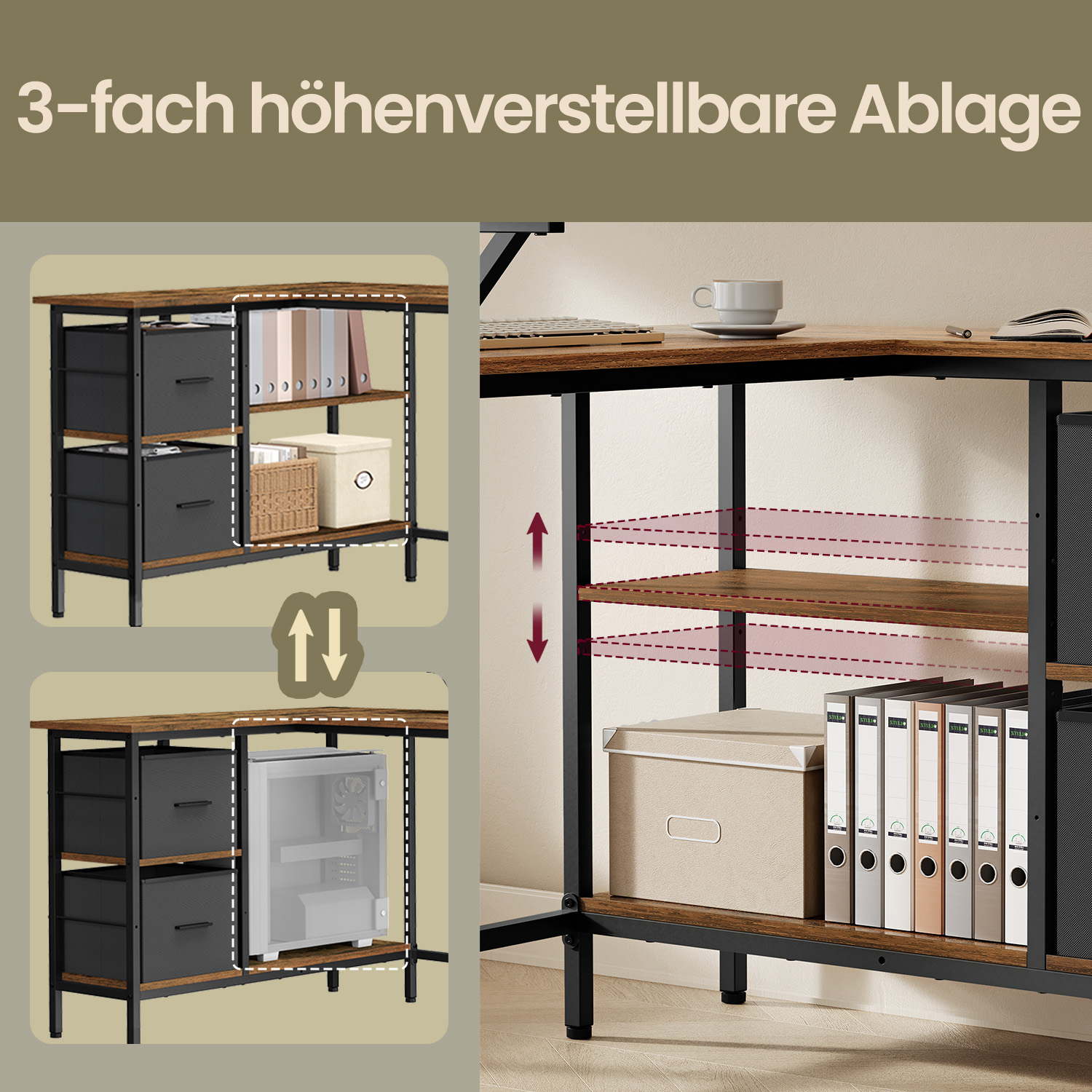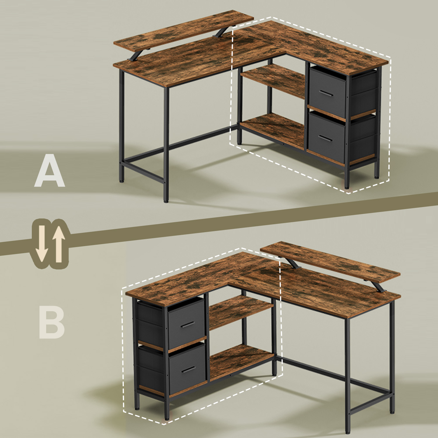 VASAGLE L-shaped desk, 2 spacious drawers, computer desk with monitor stand, corner desk, gaming table with adjustable shelf 115 x 105 cm vintage brown LWD097B01