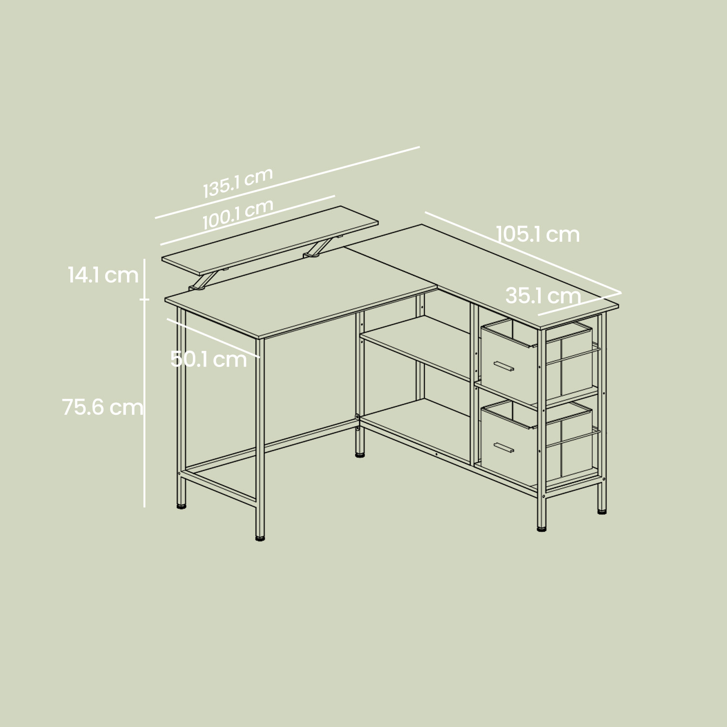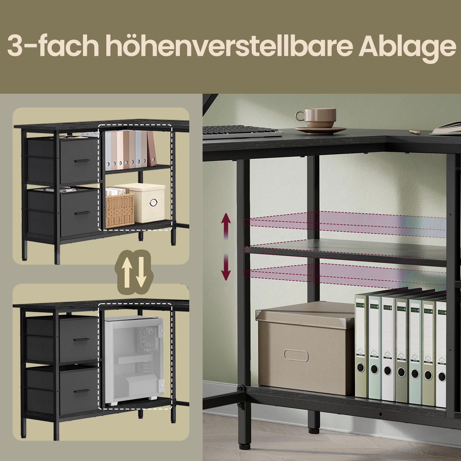VASAGLE L-shaped desk, 2 spacious drawers, computer desk with monitor stand, corner desk, gaming table with adjustable shelf 115 x 105 cm vintage brown LWD097B01