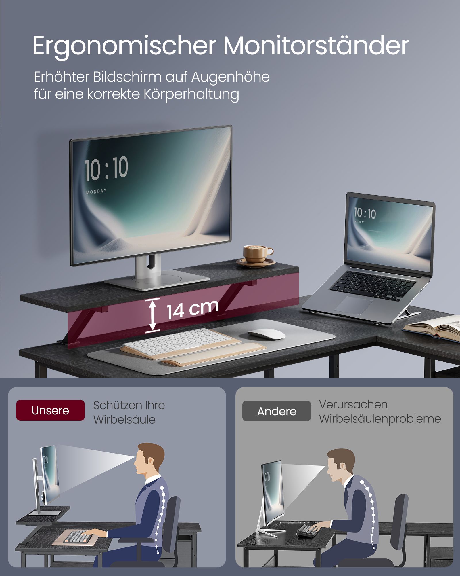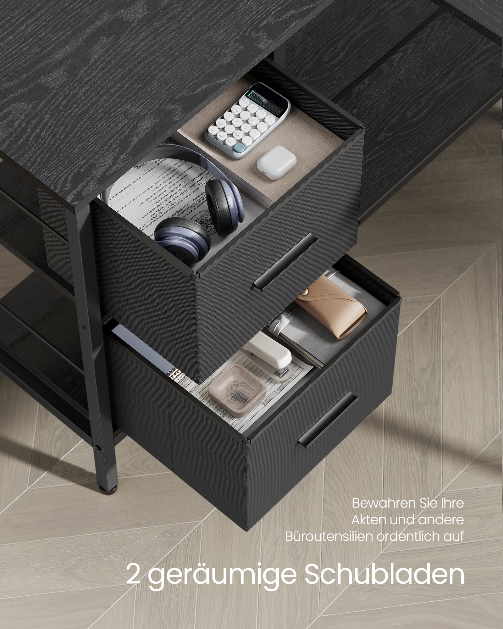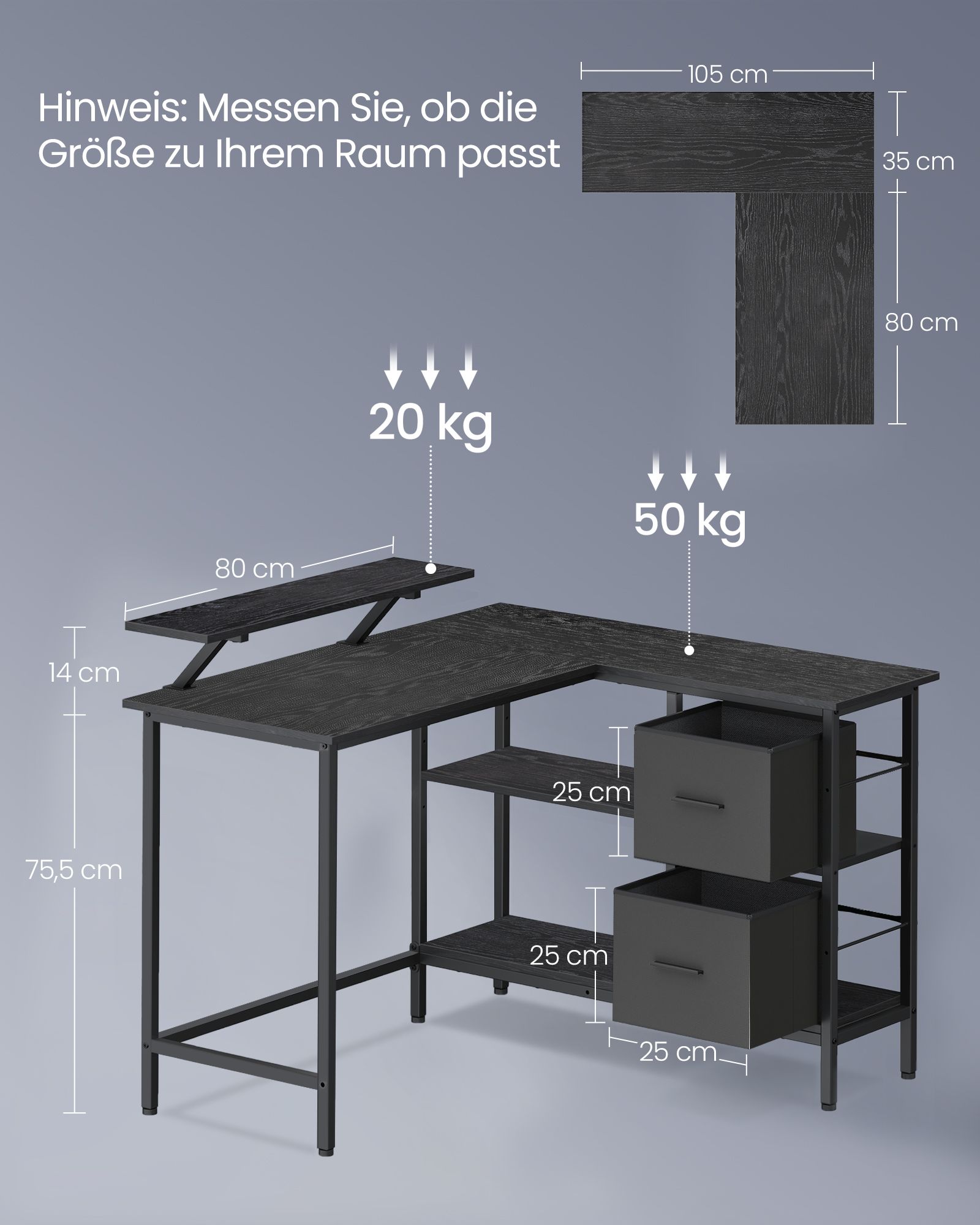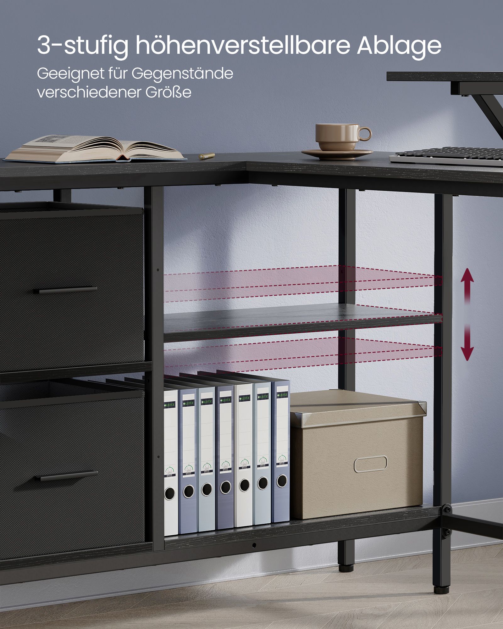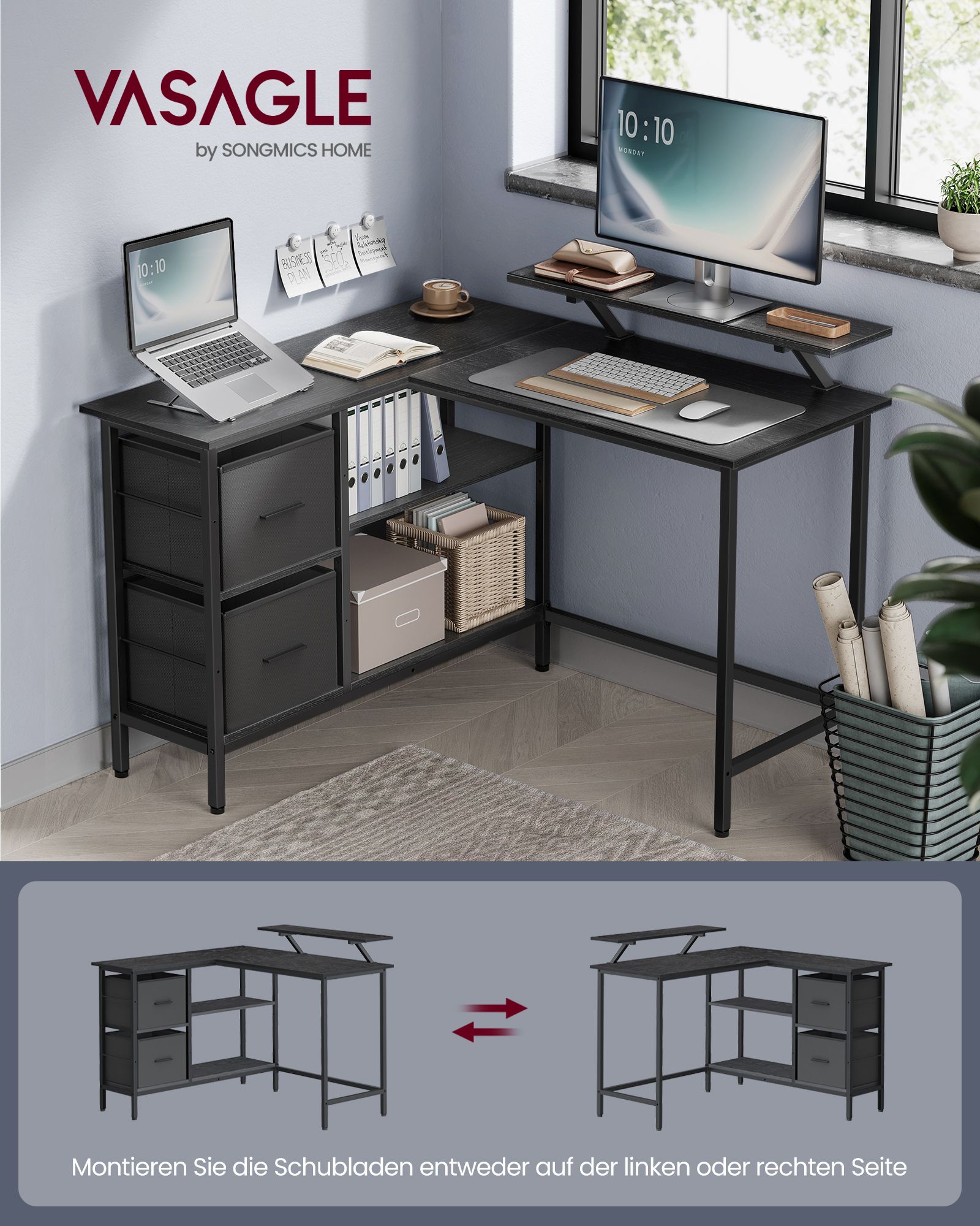 VASAGLE L-shaped desk, 2 spacious drawers, computer desk with monitor stand, corner desk, gaming table with adjustable shelf 115 x 105 cm vintage brown LWD097B01