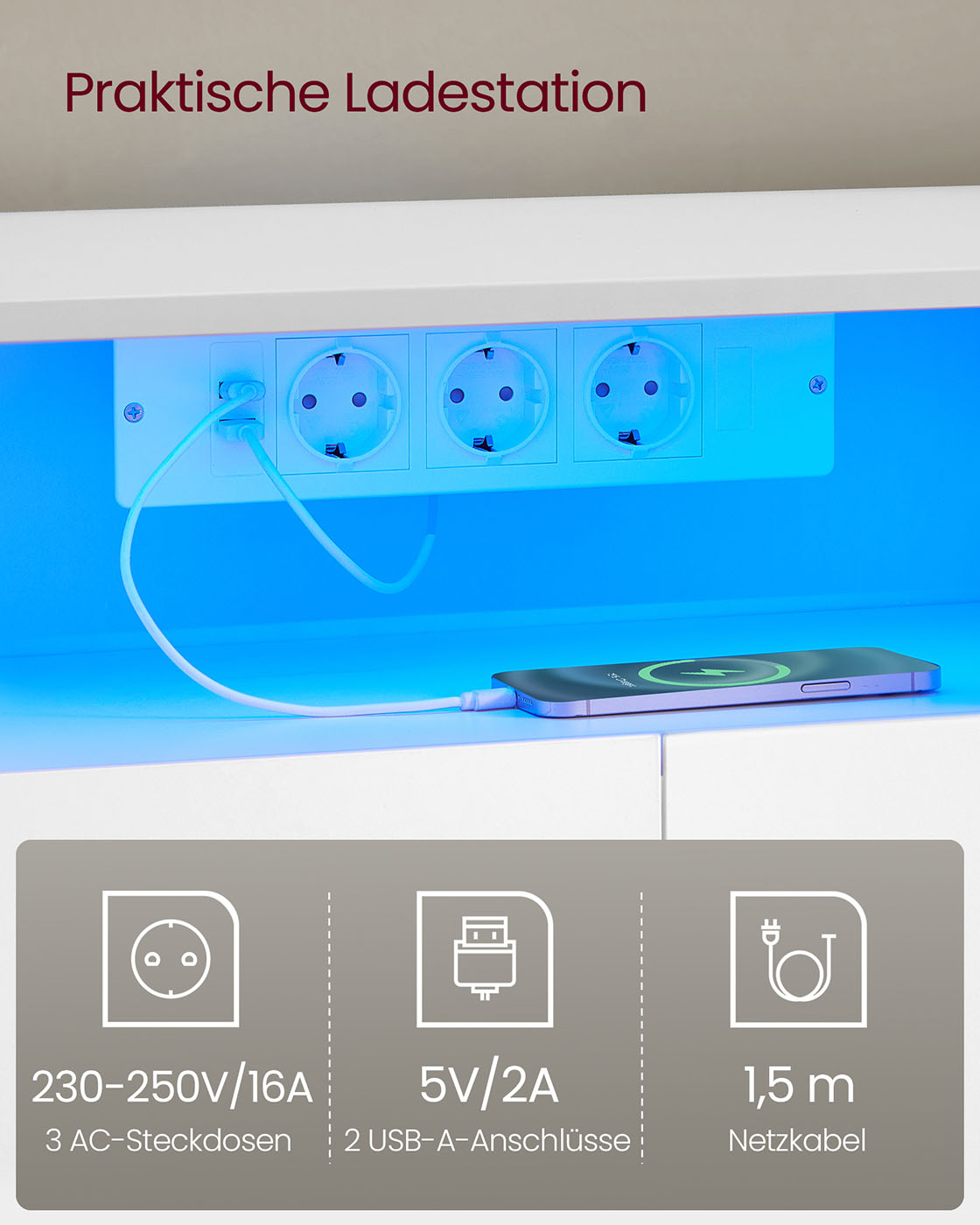 VASAGLE TV lowboard, adjustable length 162-270 cm, L-shaped TV cabinet, 2 drawers, 3 open compartments, LED lighting, power strip, living room, cloud white-natural beige LTV126W02