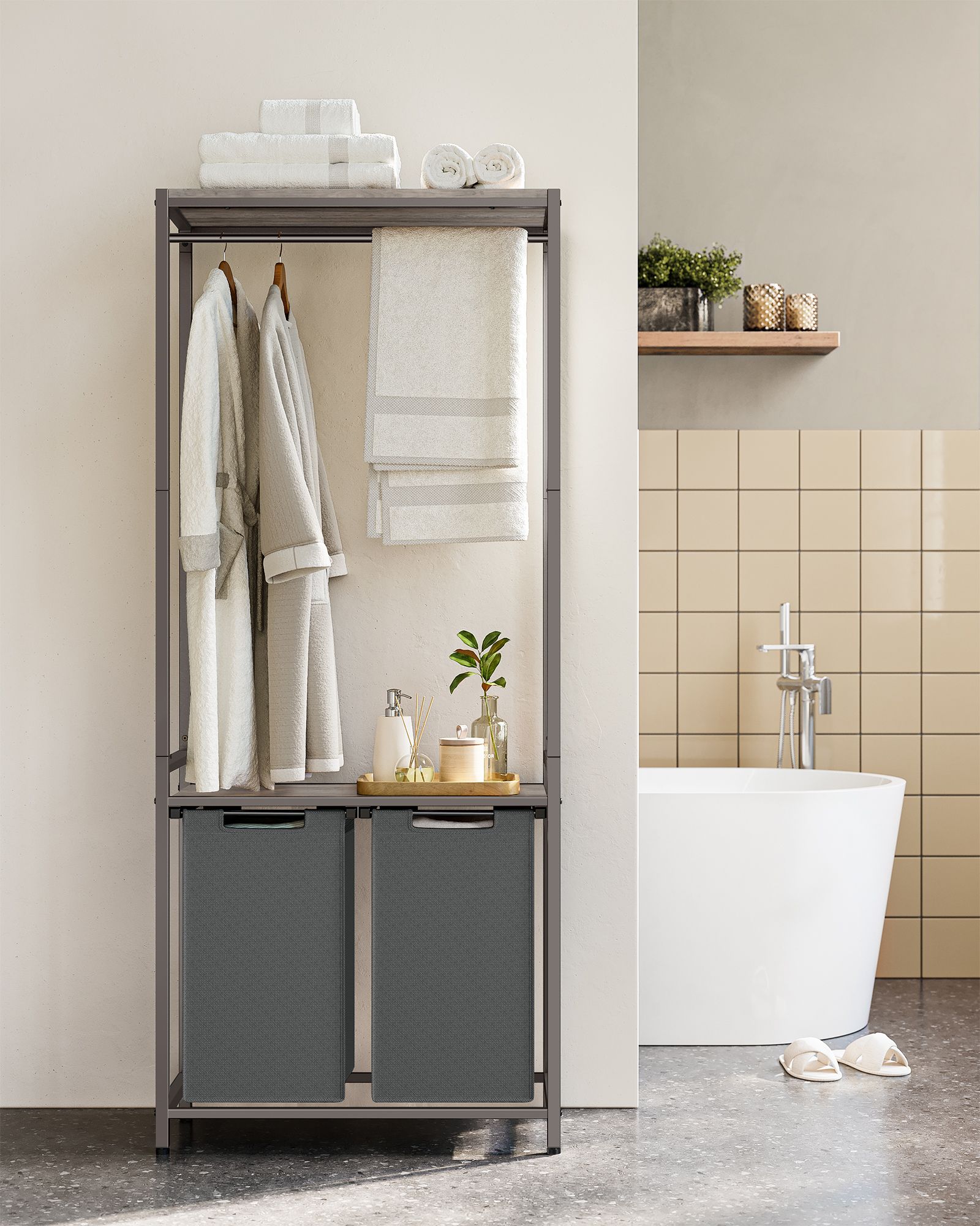 VASAGLE laundry basket with coat rack, laundry collector with 2 compartments, 73 x 33 x 177 cm, clothes rack, laundry box, extendable removable laundry bag