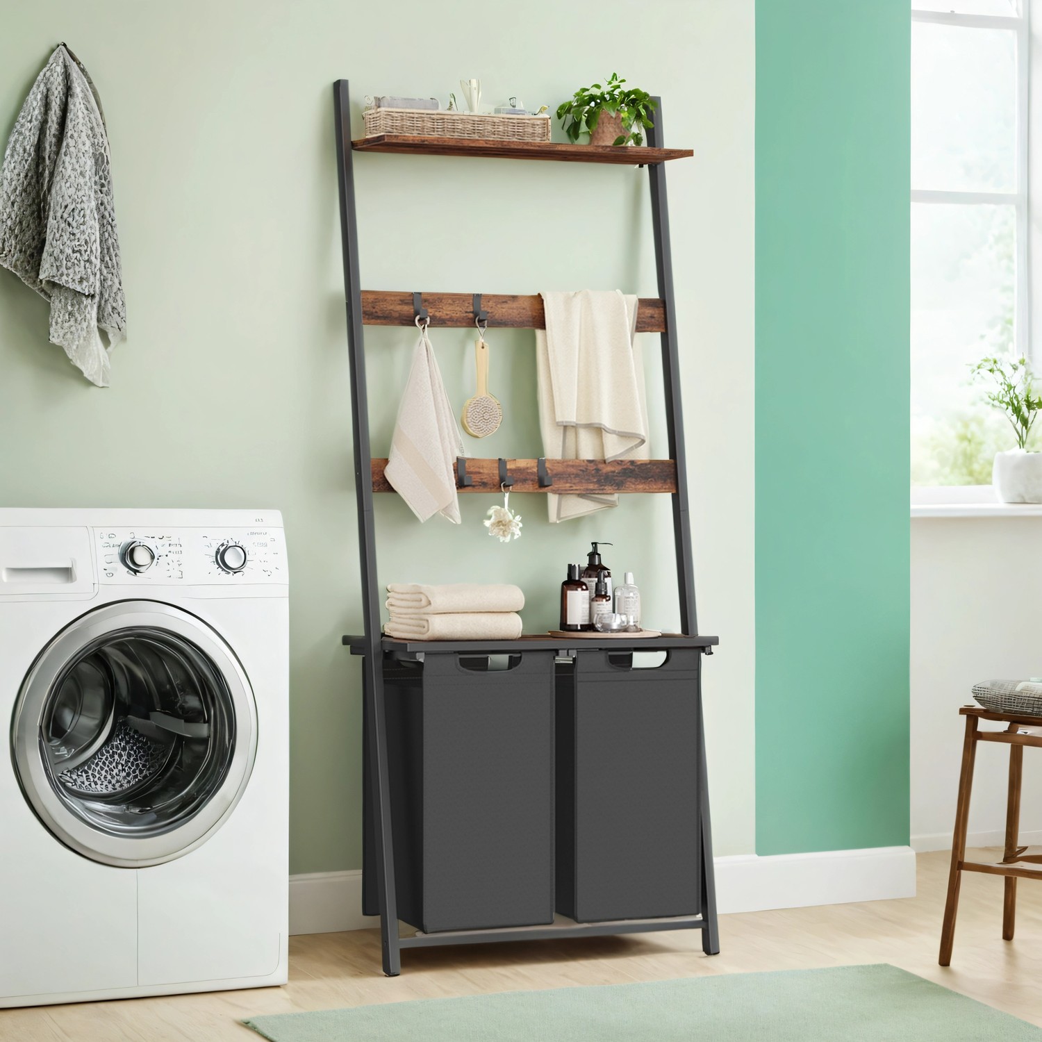 VASAGLE laundry basket with towel ladder, towel rack with laundry collector, 73 x 33 x 177 cm, towel holder, laundry sorter with 2 compartments, ladder shelf, bathroom furniture