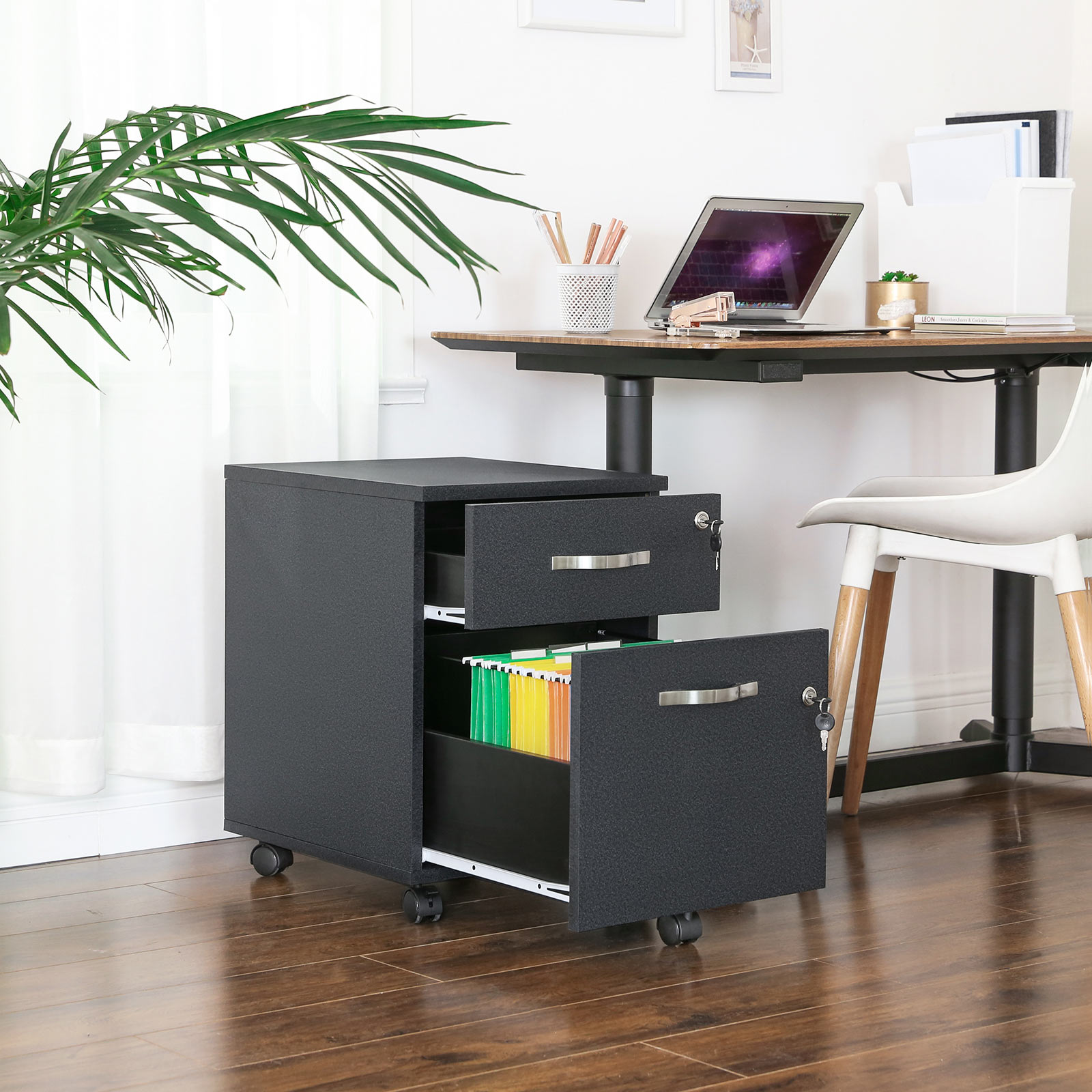 A practical helper for work Are you lacking storage space in your office? Then you should try this lockable rolling container from VASAGLE! Everything you need for work can be stored in this cabinet. There is also space for your printer on the shelf.A piece of furniture for all occasions At the head of the bed, the rolling container serves as a nightstand on which you can place a night lamp, for example; next to the sofa, it transforms into a side table on which bowls of snacks, cups, etc. are within easy reach. Practical casters This filing cabinet is equipped with 5 casters so you can easily move it around. Or you can lock the cabinet in place with the 2 lockable wheels. The roller on the bottom drawer also gives it a good grip and ensures high load capacity. Product details: – Color: Black – Material: E1 class MDF (medium density fiberboard), PVC – Size: 40 x 44 x 54.5 cm (L x W x H) – Weight: 17 kg – Max. static load capacity: 50 kg Scope of delivery: -1 x rolling container -1 x container with accessories -1 x instructions (DE, EN, FR, ES, IT) VASAGLE Notes:- We advise against children under 3 years of age using the product; if they do, please only under adult supervision. – Do not allow children to climb on or play with the product to avoid injuries caused by tipping over.