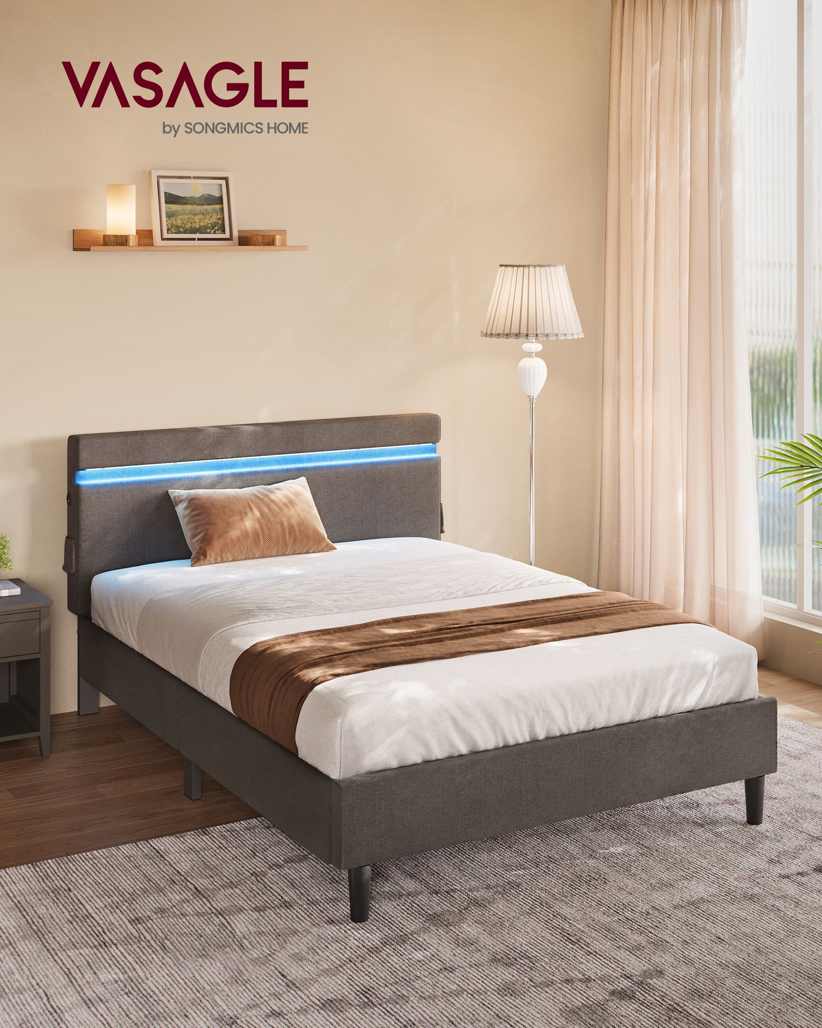 VASAGLE metal double bed, 140 x 190 cm, bed frame, with headboard, LED lighting, USB and Type-C port, modern style, for guest rooms, teenagers