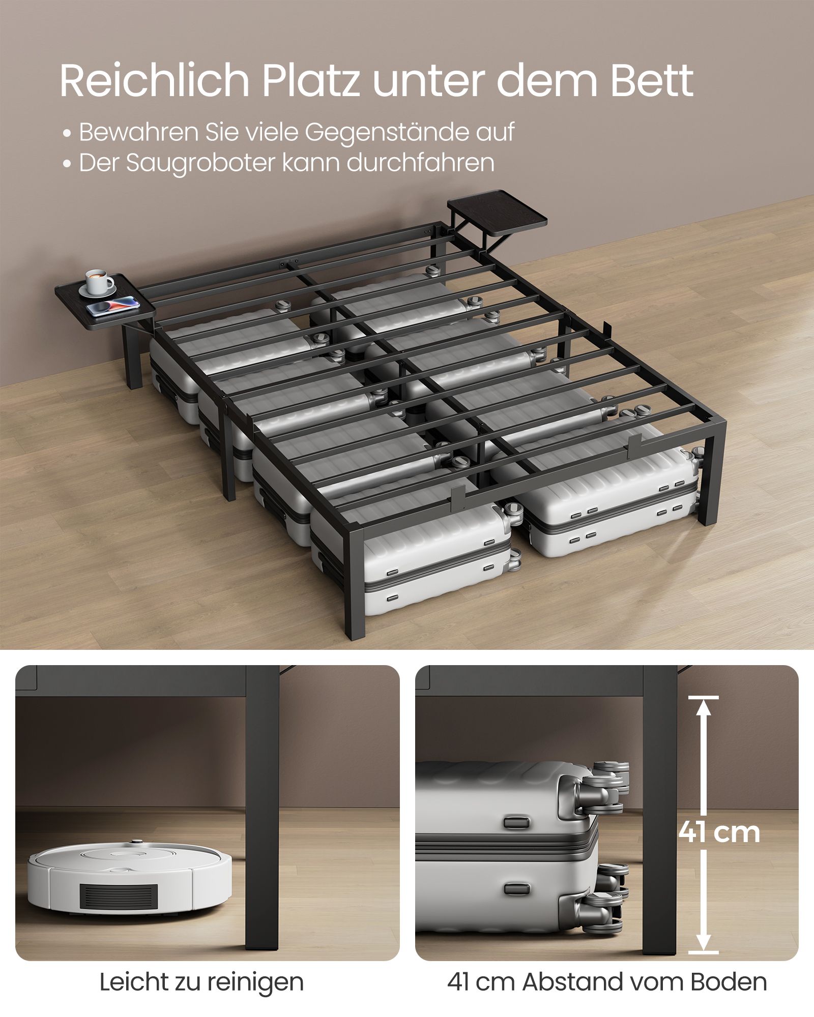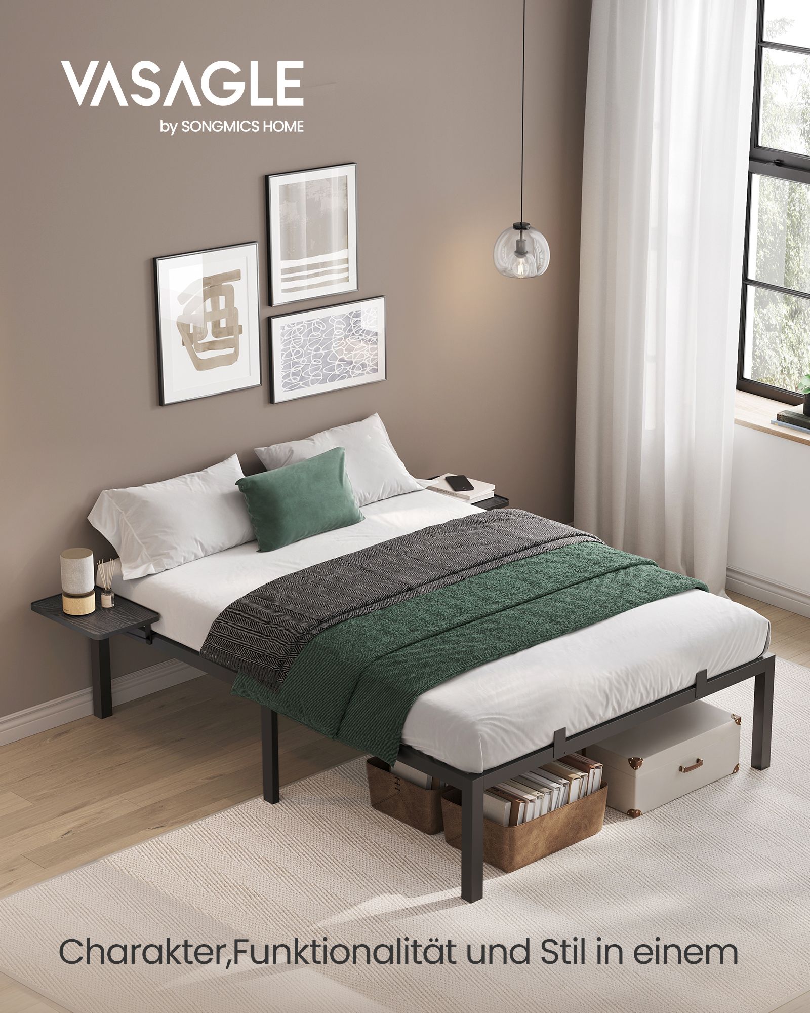 VASAGLE double bed frame, bed frame, metal bed frame, with storage shelves, guest bed, suitable for 190 x 140 cm mattress, easy assembly, classic black RMB093B01