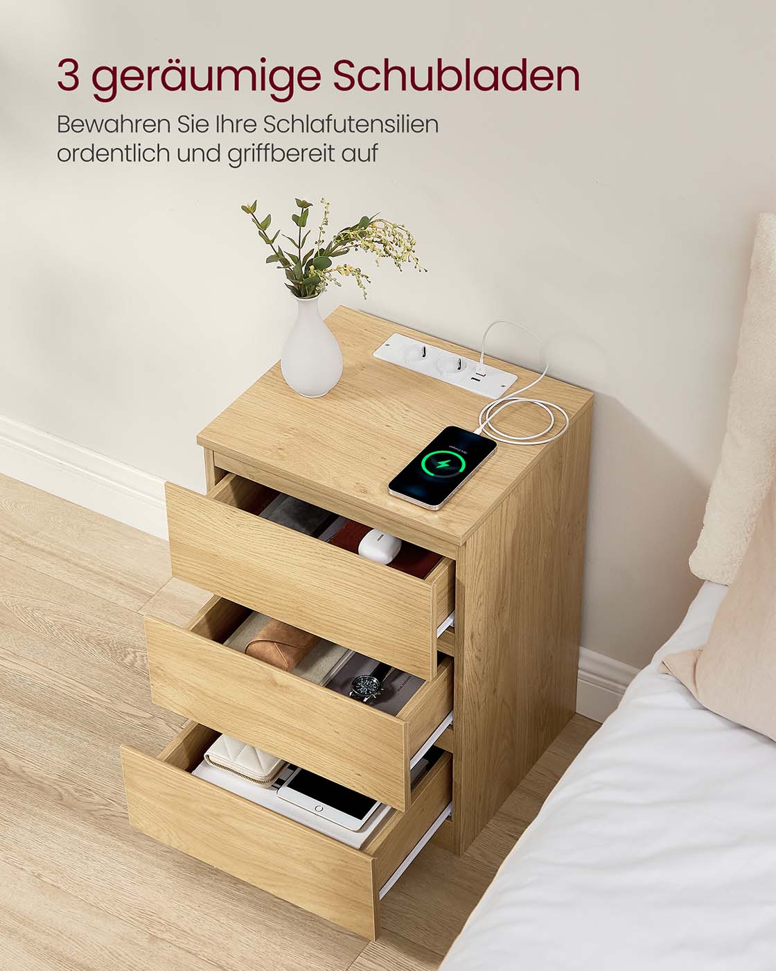 VASAGLE bedside table, side table, 3 drawers, beveled edge, 2 AC outlets, 2 USB ports, living room, bedroom, study, modern