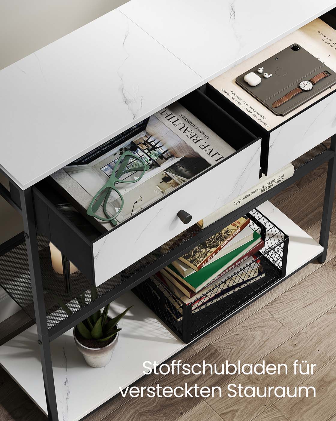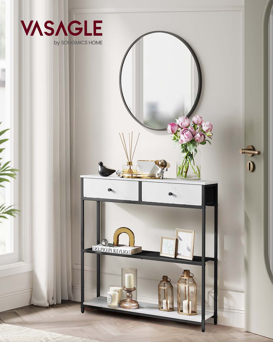 VASAGLE narrow console table, side table with 2 fabric drawers, hallway table, 24 x 76 x 80 cm, for hallway, living room, vintage brown-ink black LNT092K01
