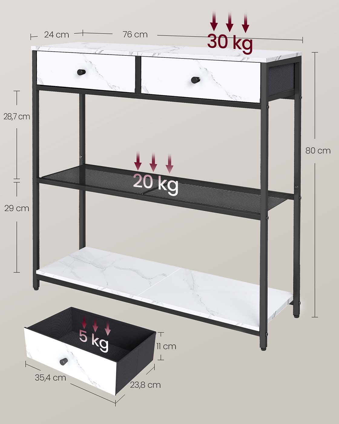 Max. static load capacity per drawer: 5 kg