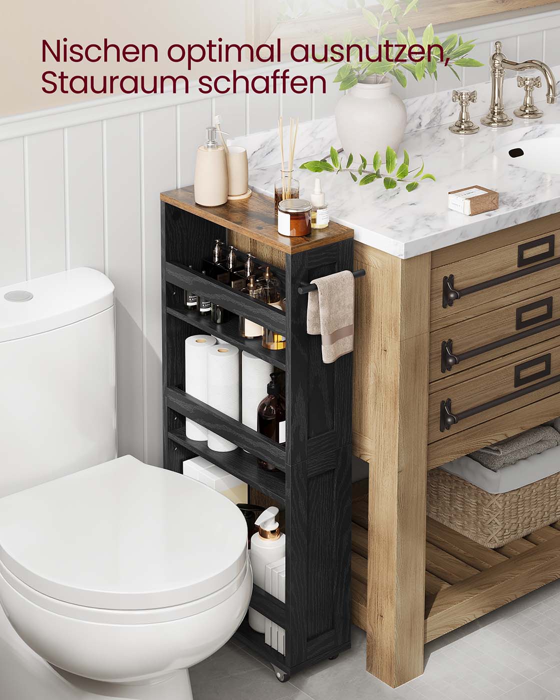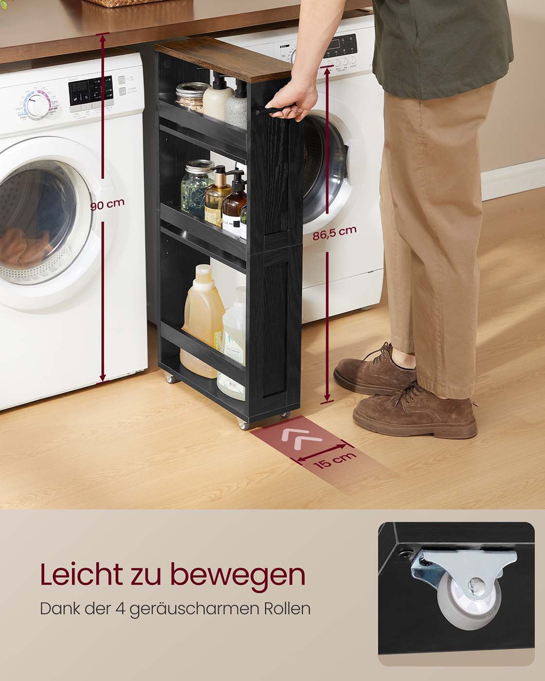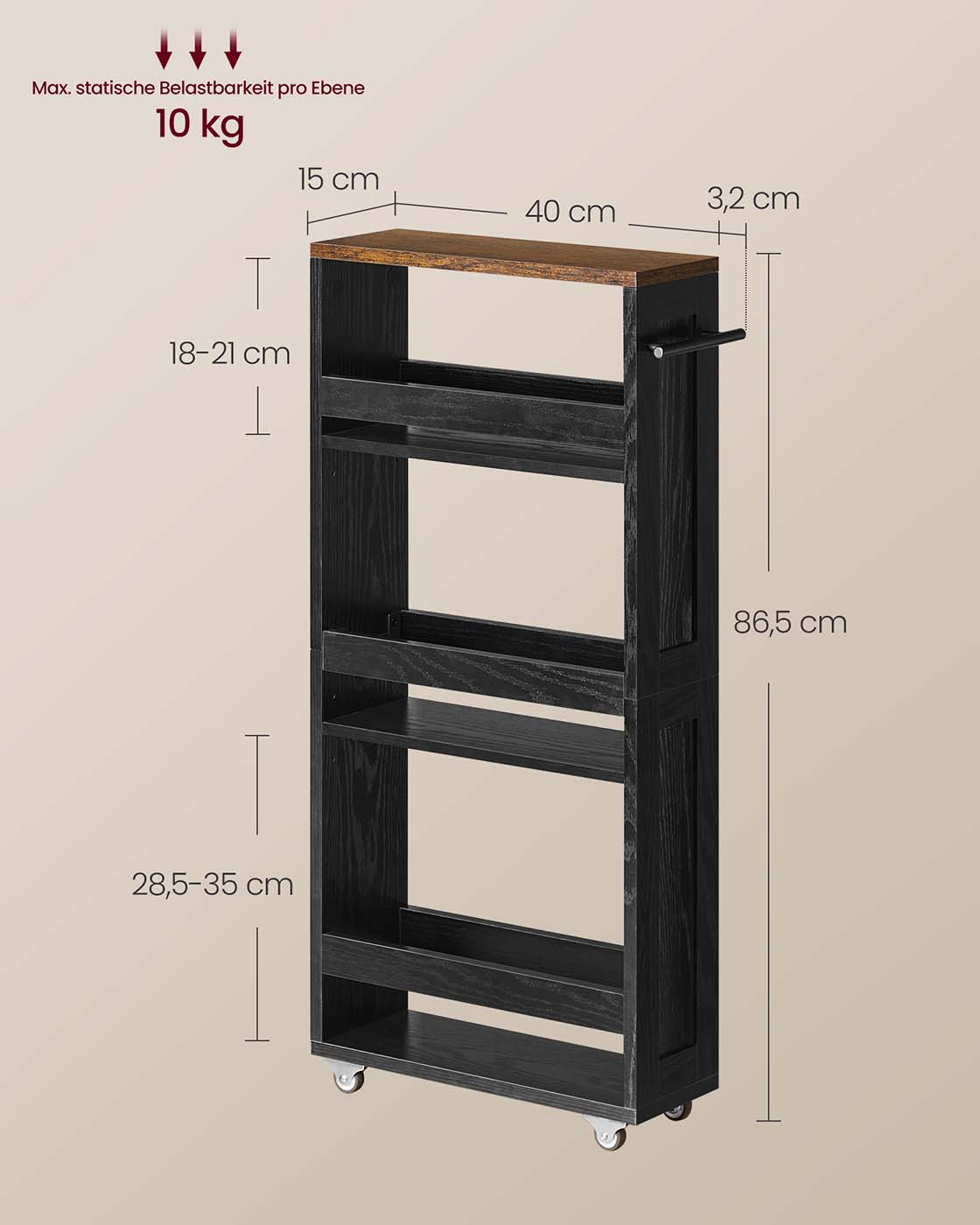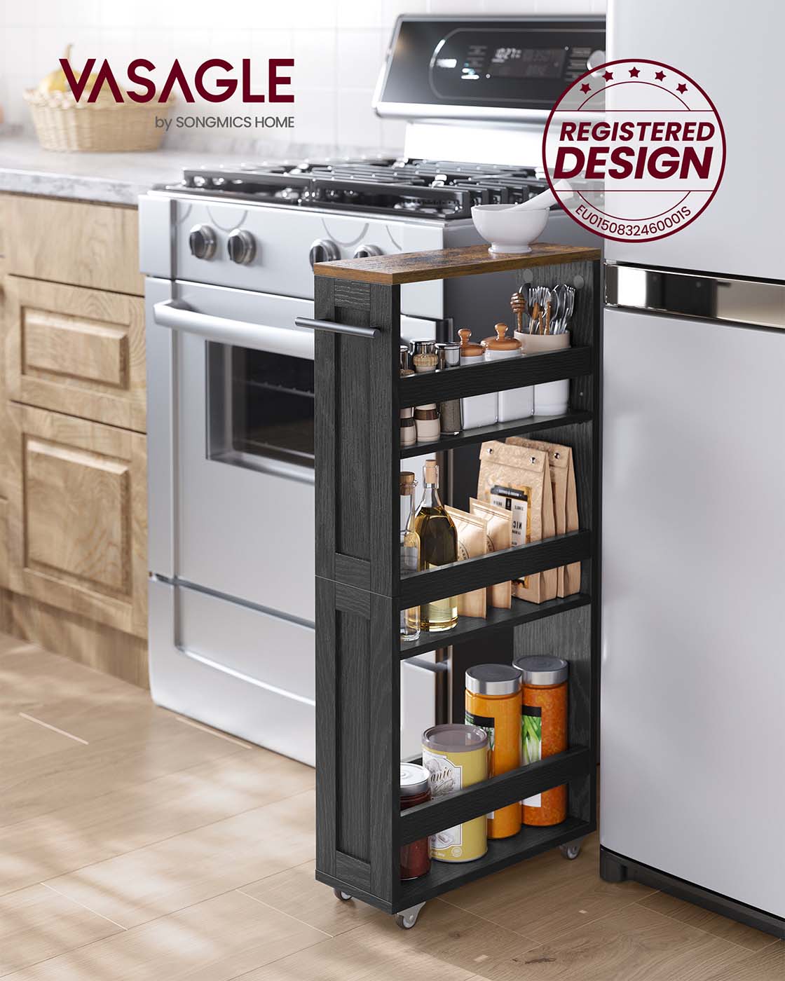 VASAGLE 4-tier narrow kitchen trolley, niche shelf on casters, handle, for small spaces, 15 x 43.2 x 86.5 cm, bathroom, laundry room, vintage white-honey brown LRC050K01