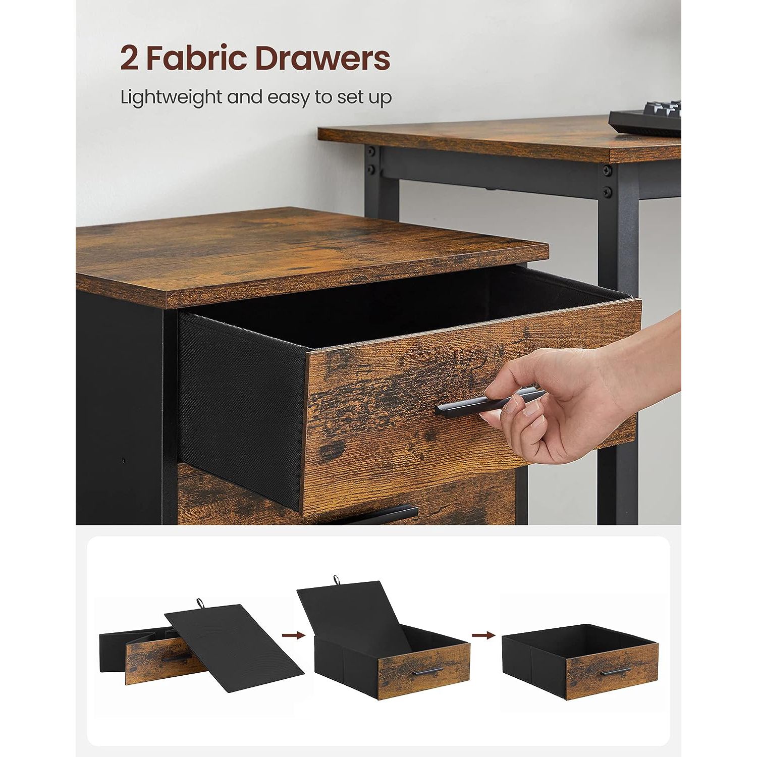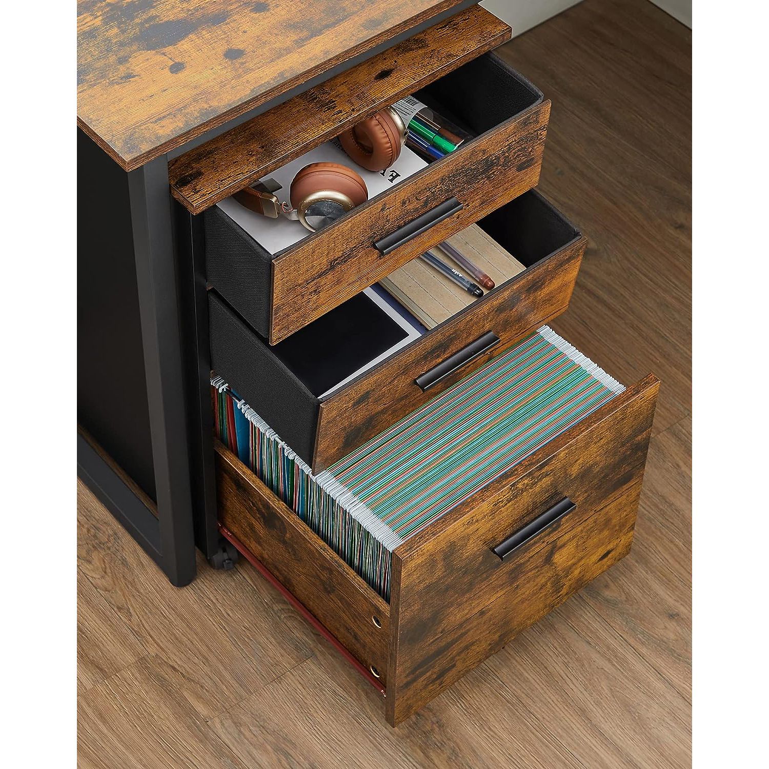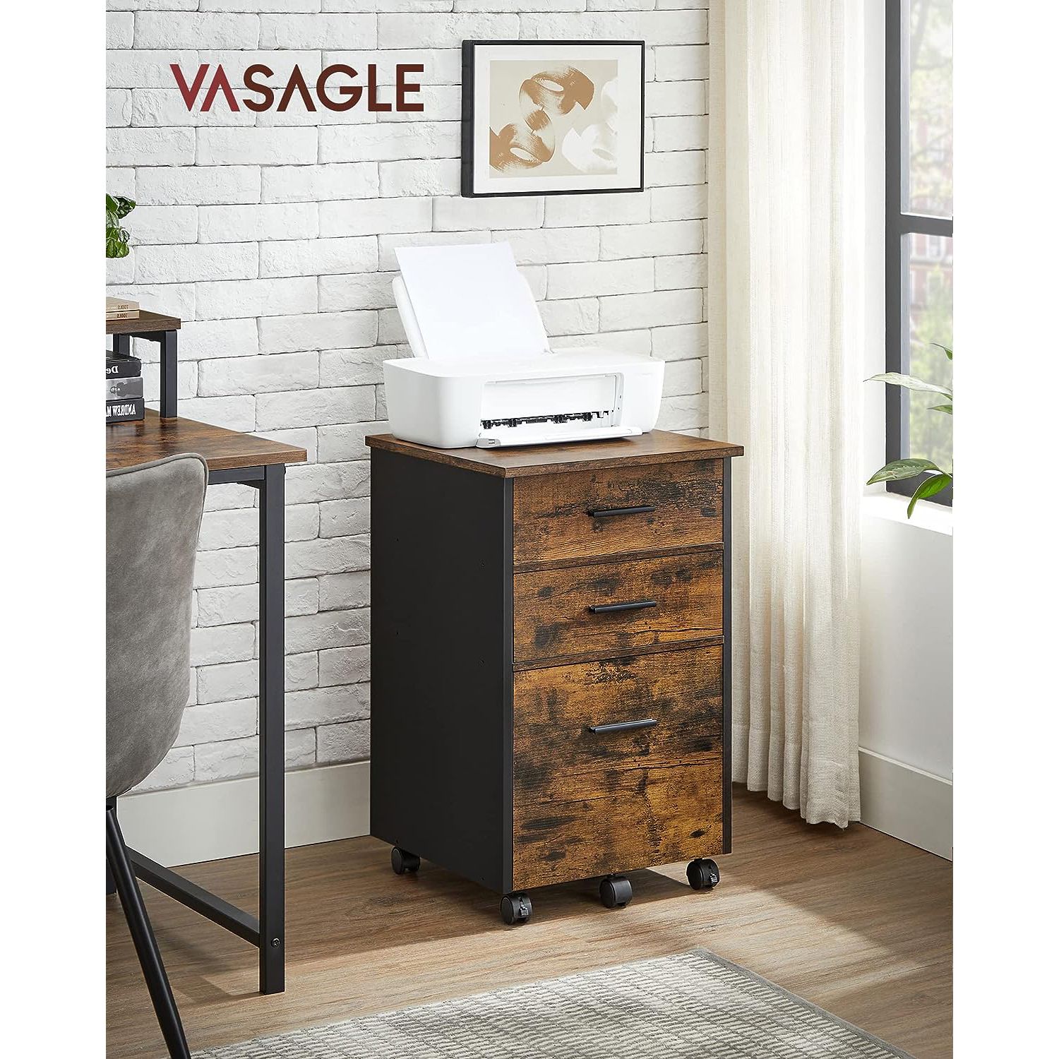 VASAGLE rolling container, filing cabinet, office cabinet with 3 drawers, 2 of which are made of fabric, 1 drawer made of chipboard, with casters, for office, study, bedroom, vintage brown-black OFC046B01