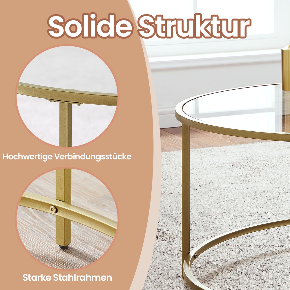 Stylish coffee table with gold frame For example, they designed the glass table shown above, which not only provides you with a stable surface on which you can display a vase of magnificent white lilies, for example. You also gain a new decorative piece with a gold frame, which you can use as an accent piece and thus make it the eye-catcher of your living room.The round gold frame made of powder-coated iron and the glass element create a distinctive retro look that fits both stylish rooms with large upholstered sofas and carpets as well as rooms with minimalist furnishings. However, this living room table should not be the only highlight in your home. Feel free to take a look at the other accent furniture from VASAGLE. Product details: – Color: Gold – Material: Iron, tempered glass – Size: 84 x 84 x 45.5 cm (L x W x H) – Weight: 11.5 kg – Max. static load capacity: 70 kg Scope of delivery:- 1 x living room table with glass surface – 1 x accessory bag – 1 x instructions (DE, EN, FR, IT, ES) VASAGLE notes: – Please keep the product away from pointed or sharp objects to avoid damage.