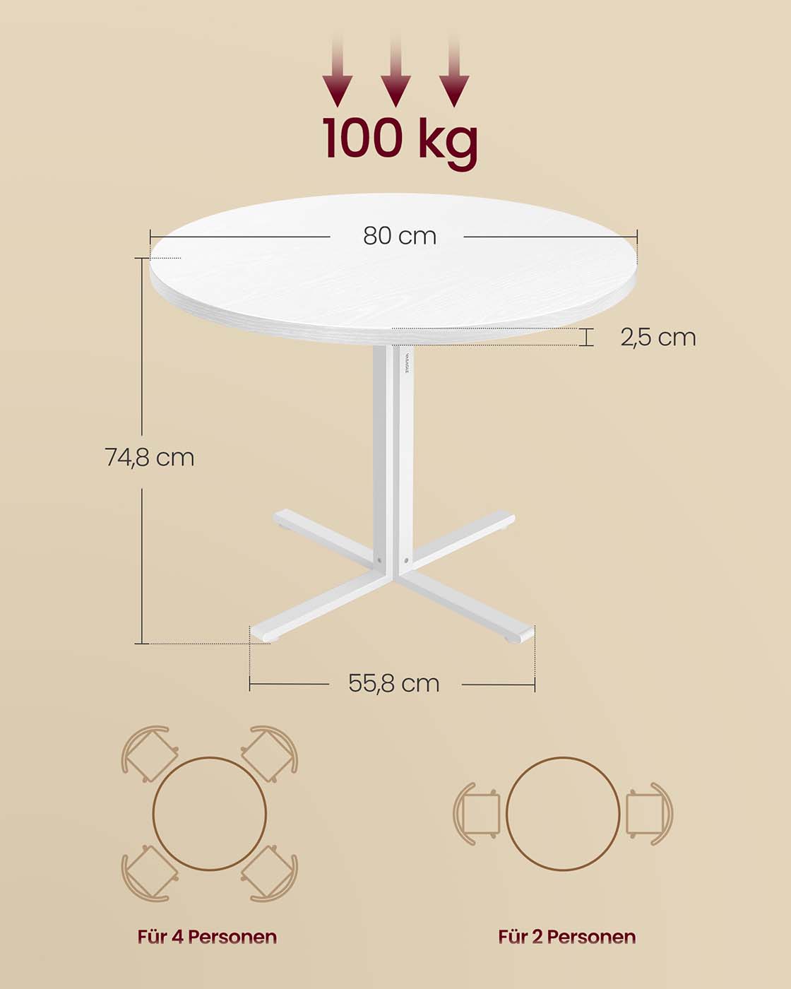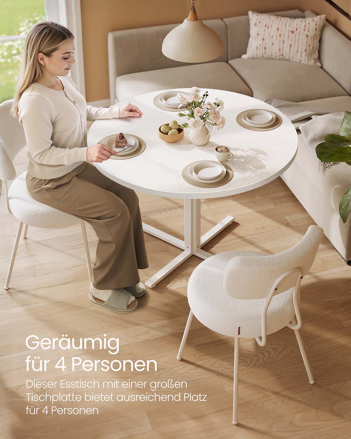 VASAGLE Round dining table, dining room table, small kitchen table for 4 people, country style, water-resistant surface, 80 cm D, 74.8 cm H, for dining room, living room, snow white KDT082W01
